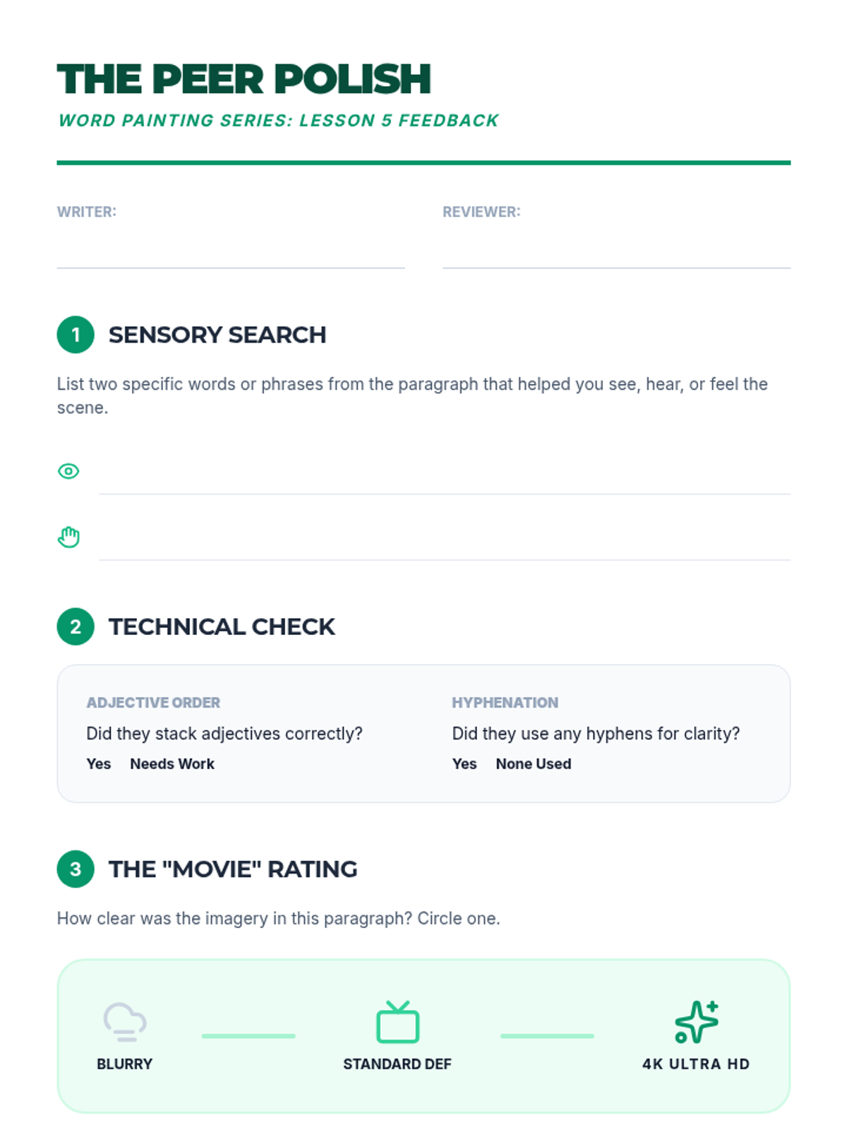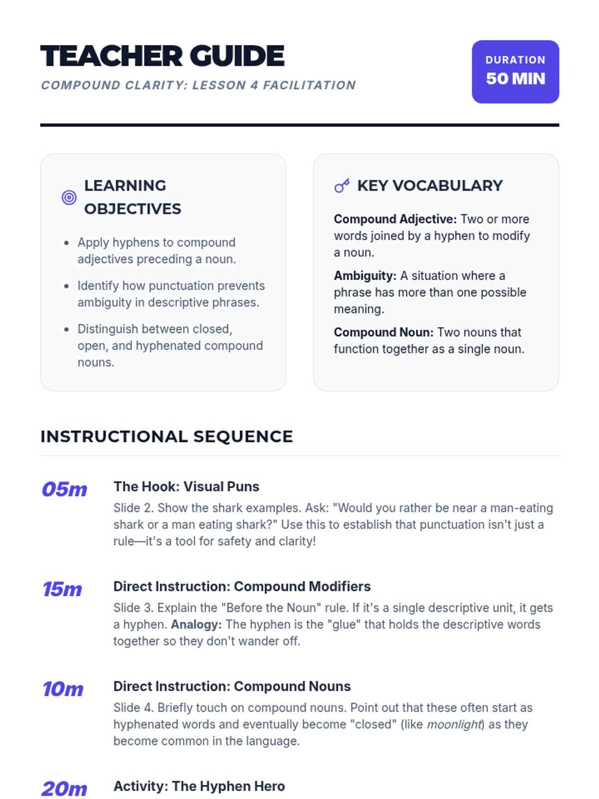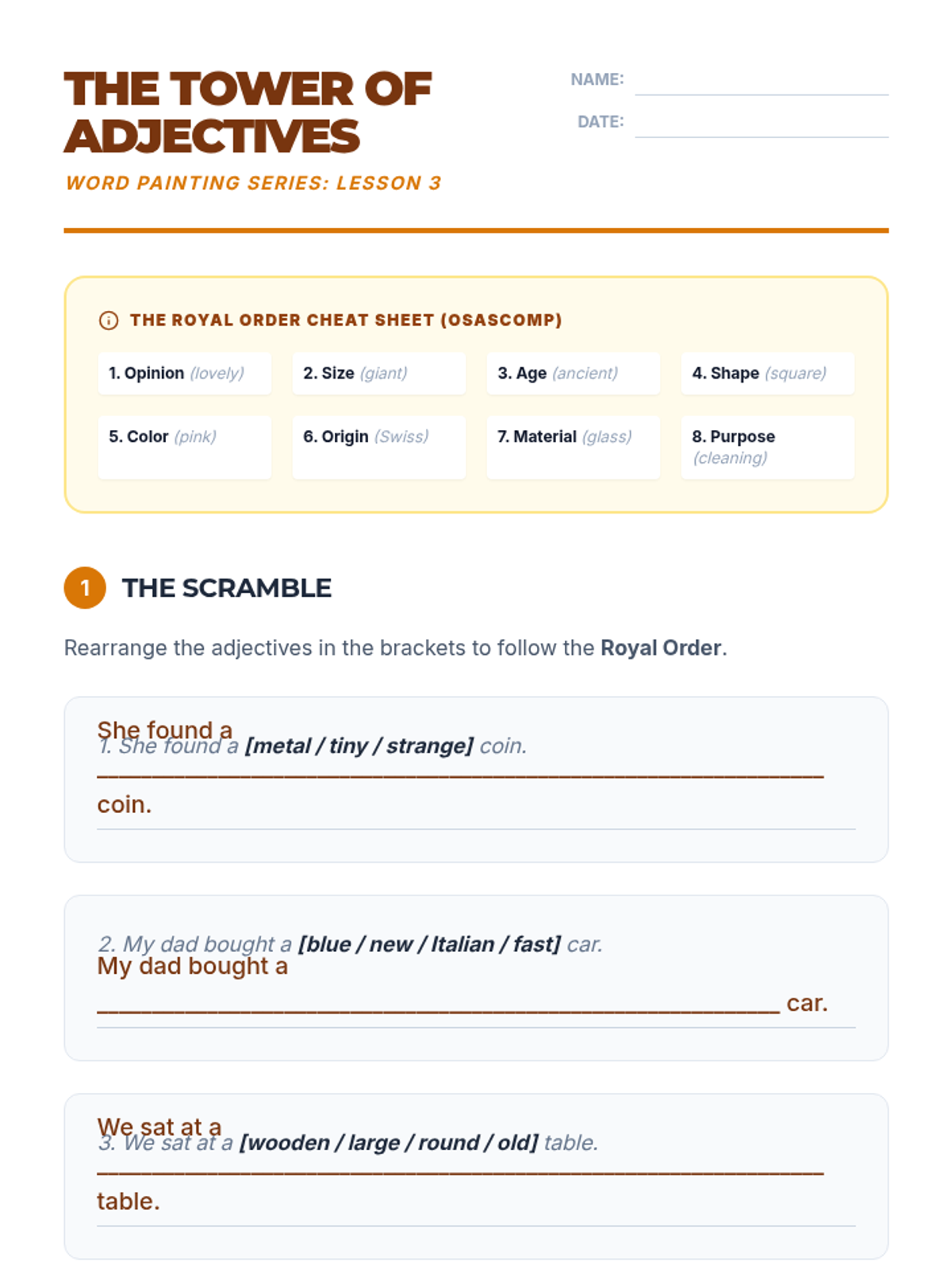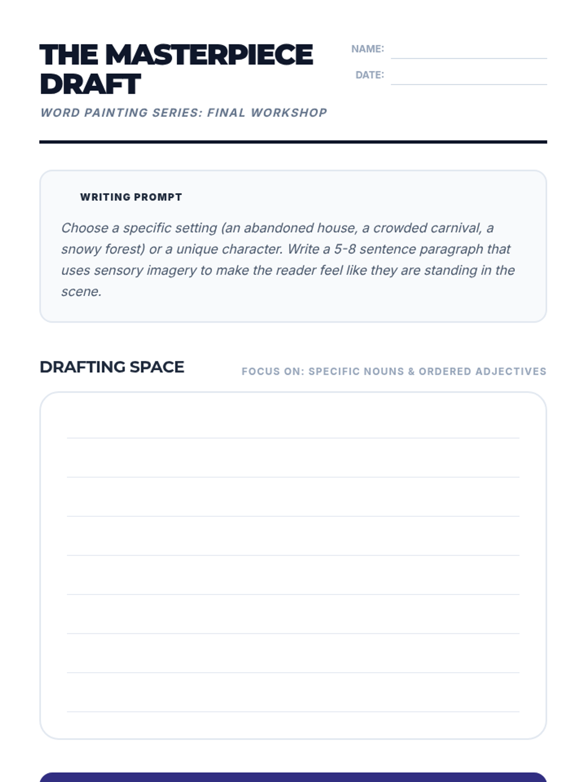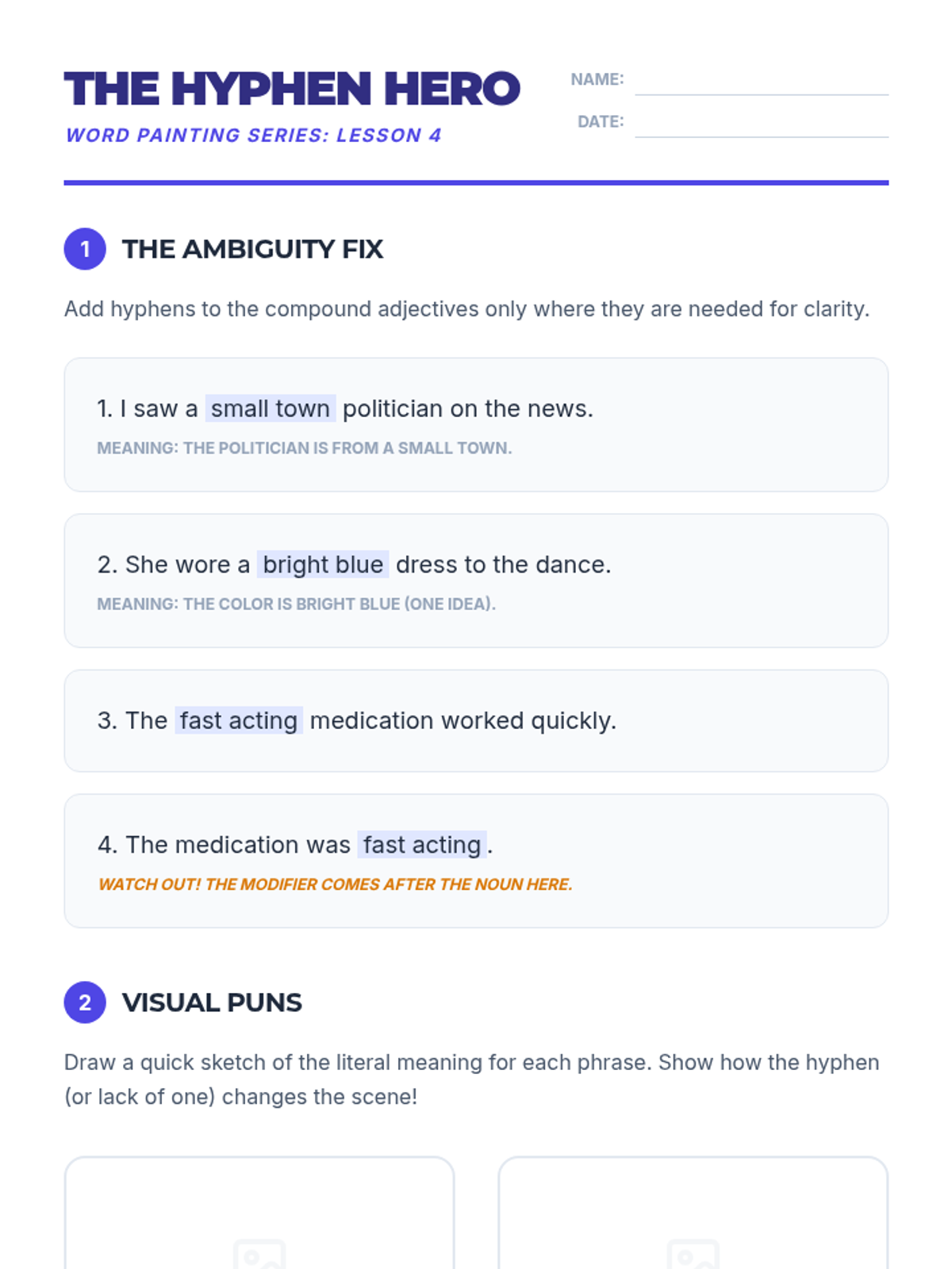 This sequence guides 7th-grade students from using generic vocabulary to crafting high-definition descriptive writing through the precise use of nouns and adjectives. Students explore concrete vs. abstract nouns, sensory adjectives, the royal order of adjectives, and hyphenated modifiers.