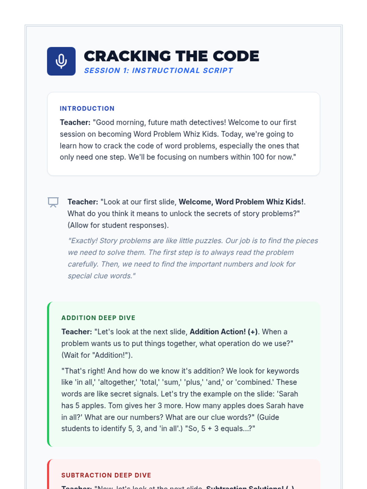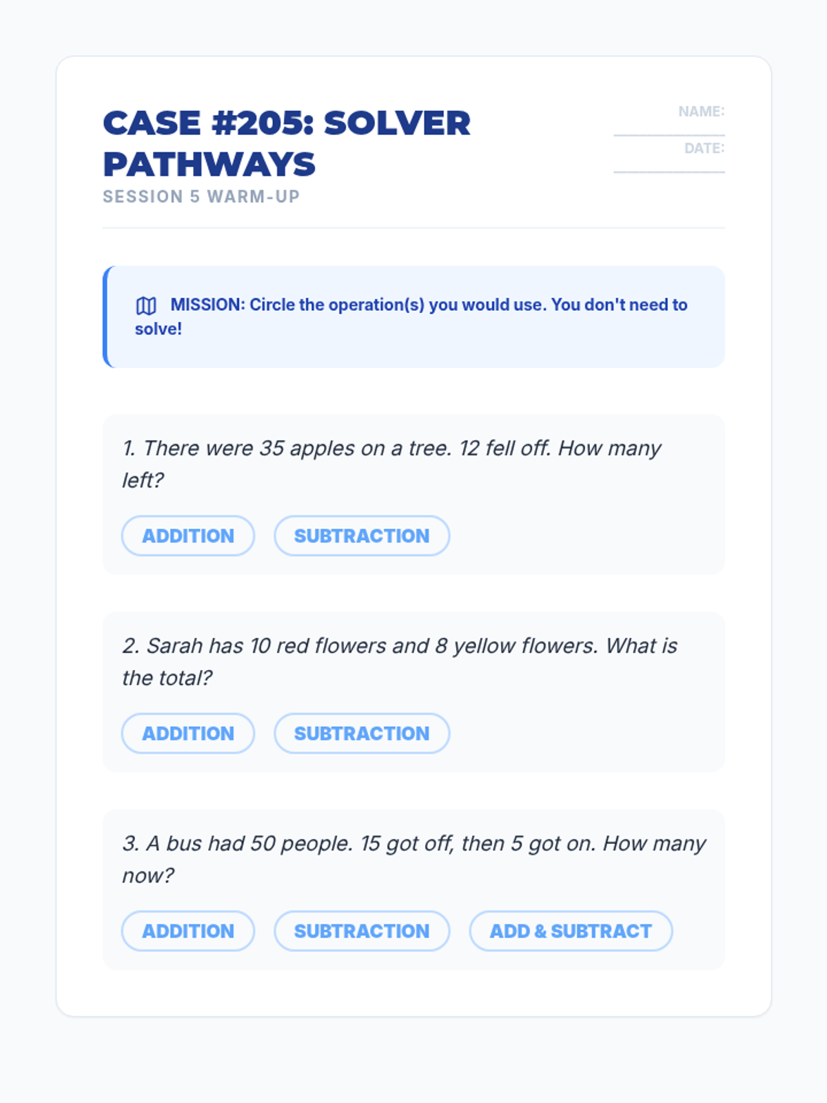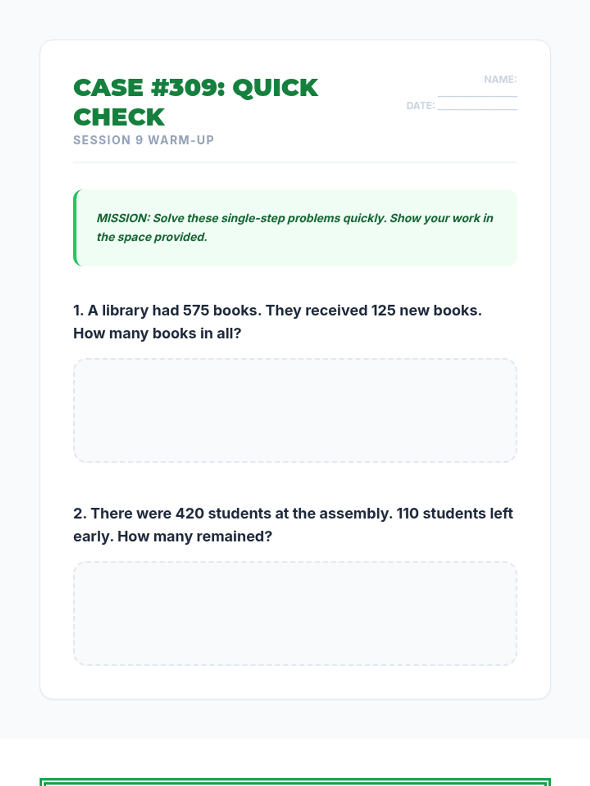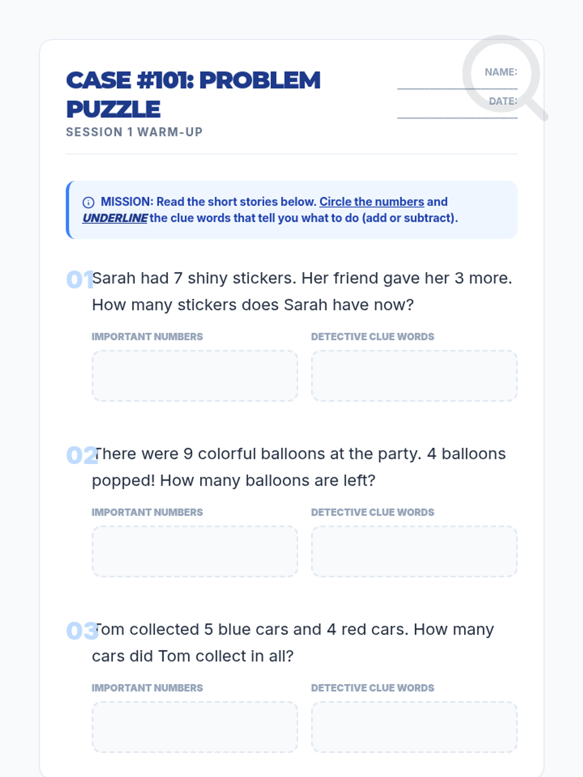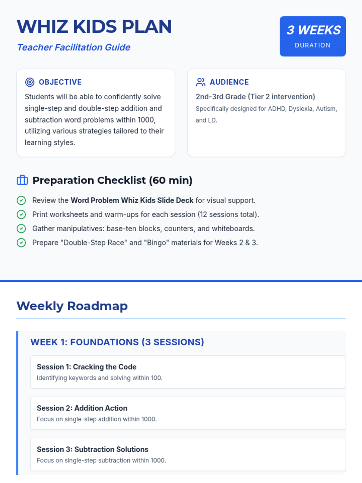 A comprehensive 3-week, 12-session math intervention unit for 2nd-3rd grade students, focusing on mastering single and double-step addition and subtraction word problems within 1000 through a detective-themed approach.
