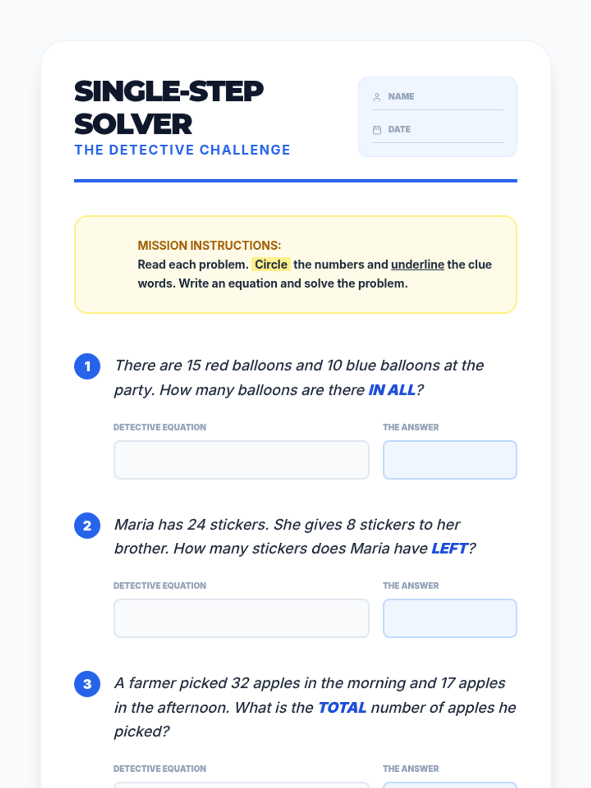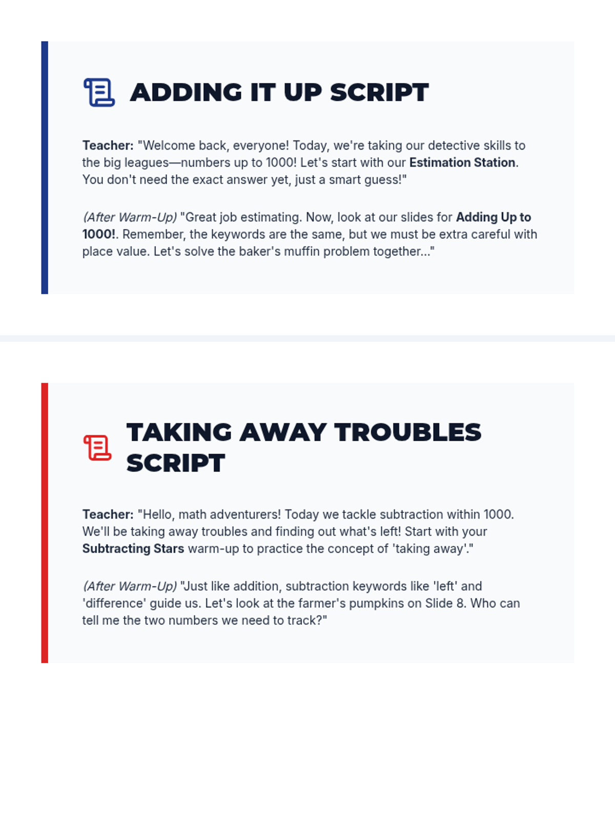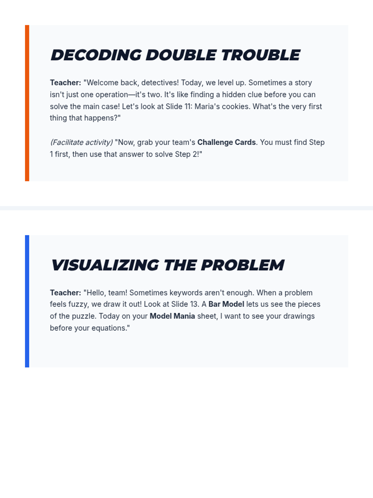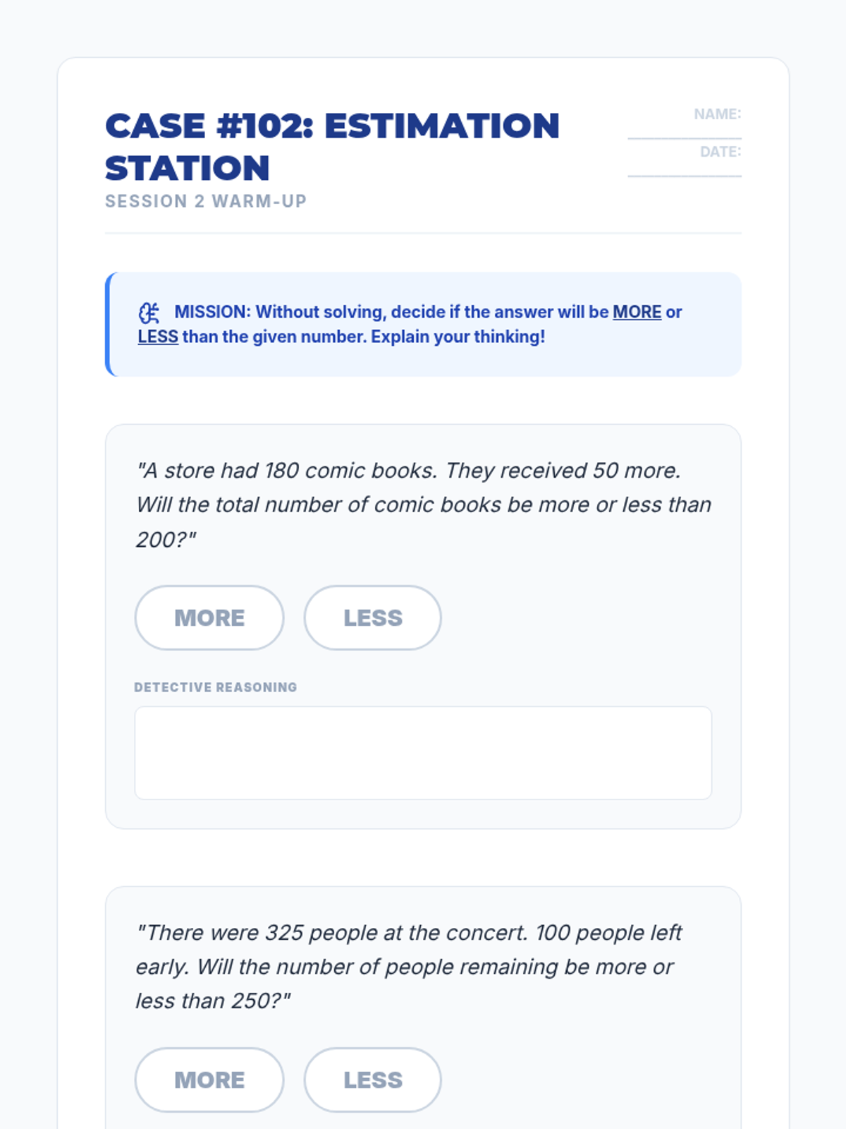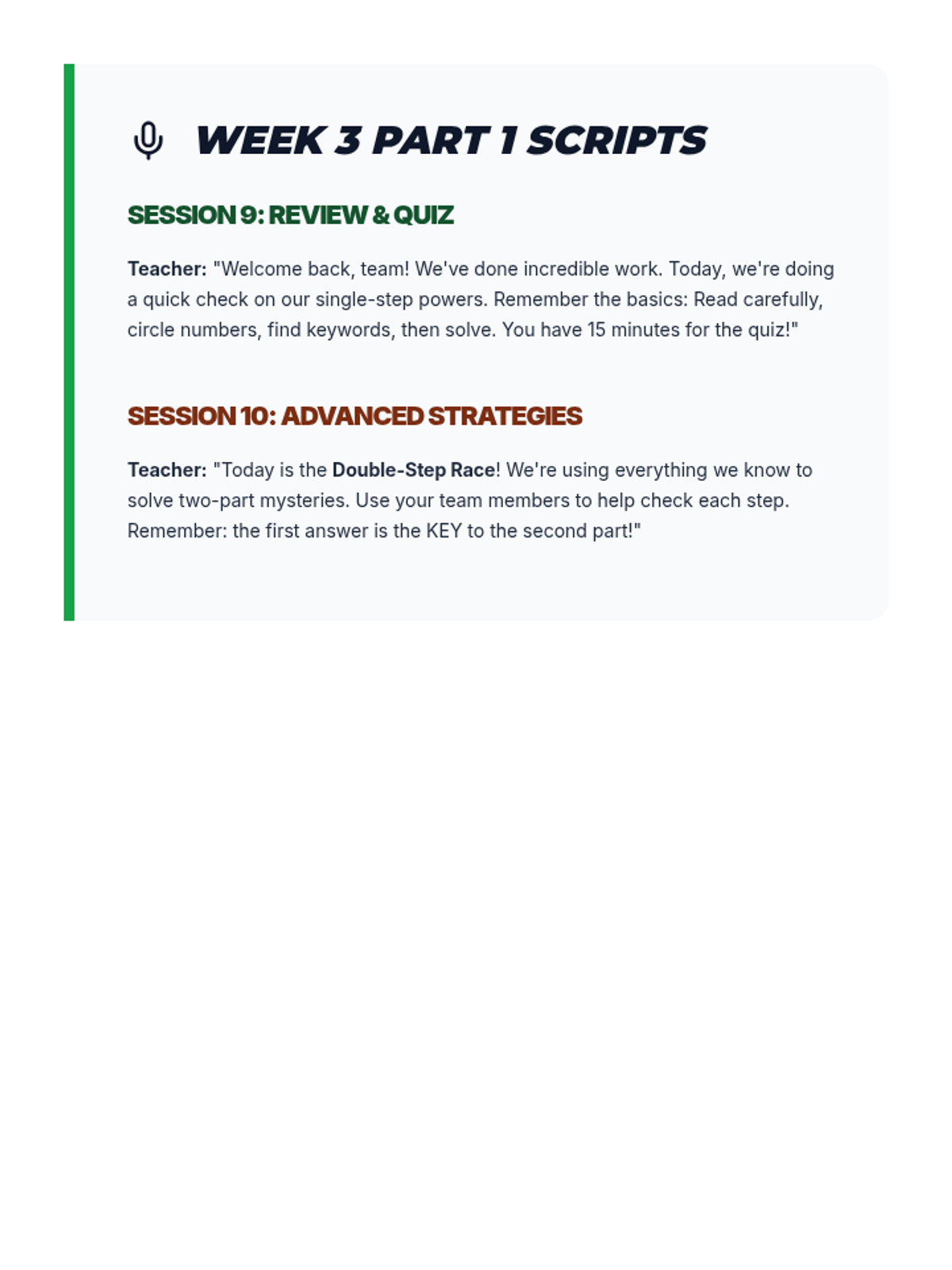 A comprehensive 3-week, 12-session math intervention unit for 2nd-3rd grade students, focusing on mastering single and double-step addition and subtraction word problems within 1000 through a detective-themed approach.