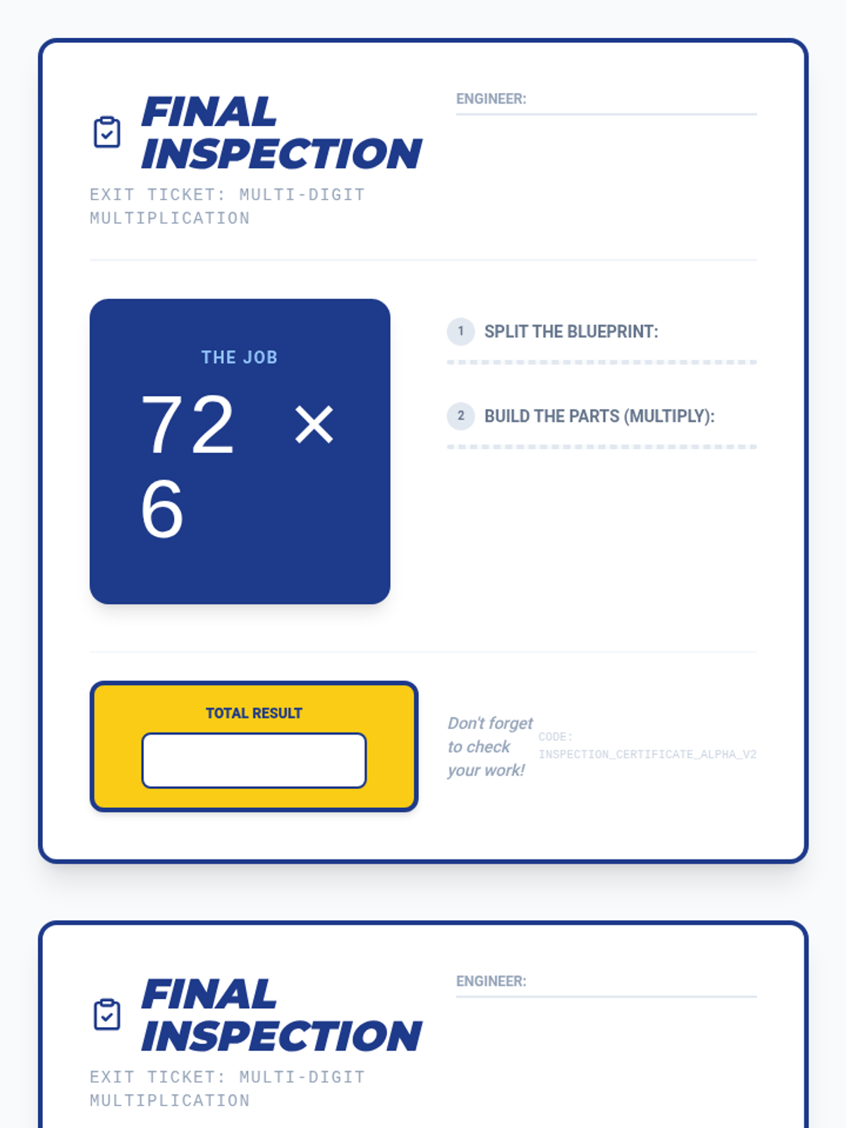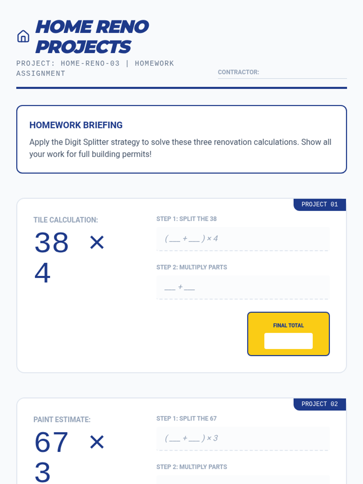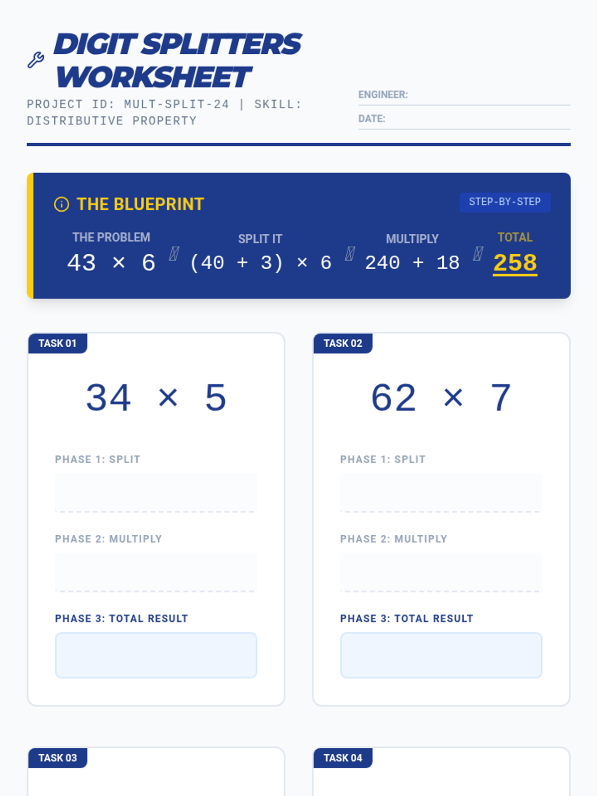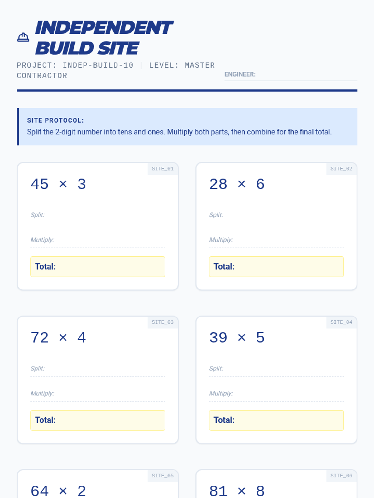 A multiplication sequence focused on the distributive property and area model strategies for multi-digit multiplication, using a construction blueprint theme.
