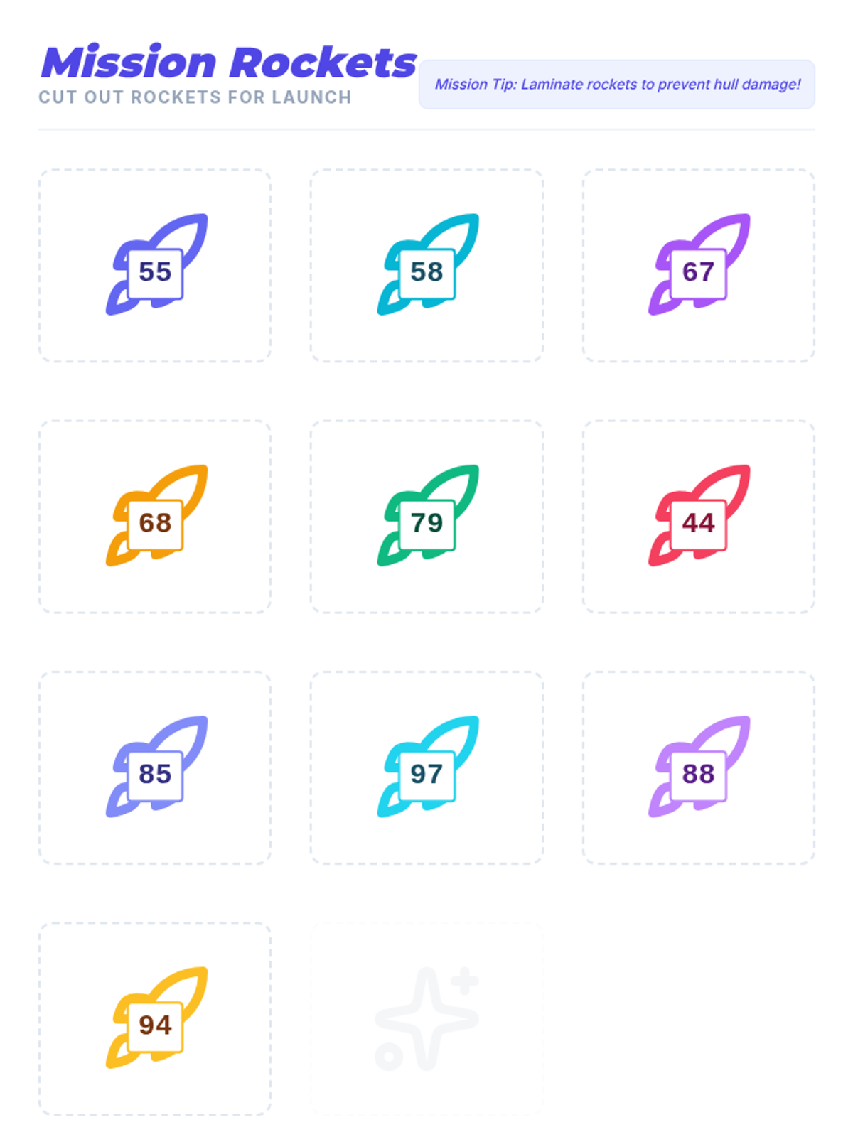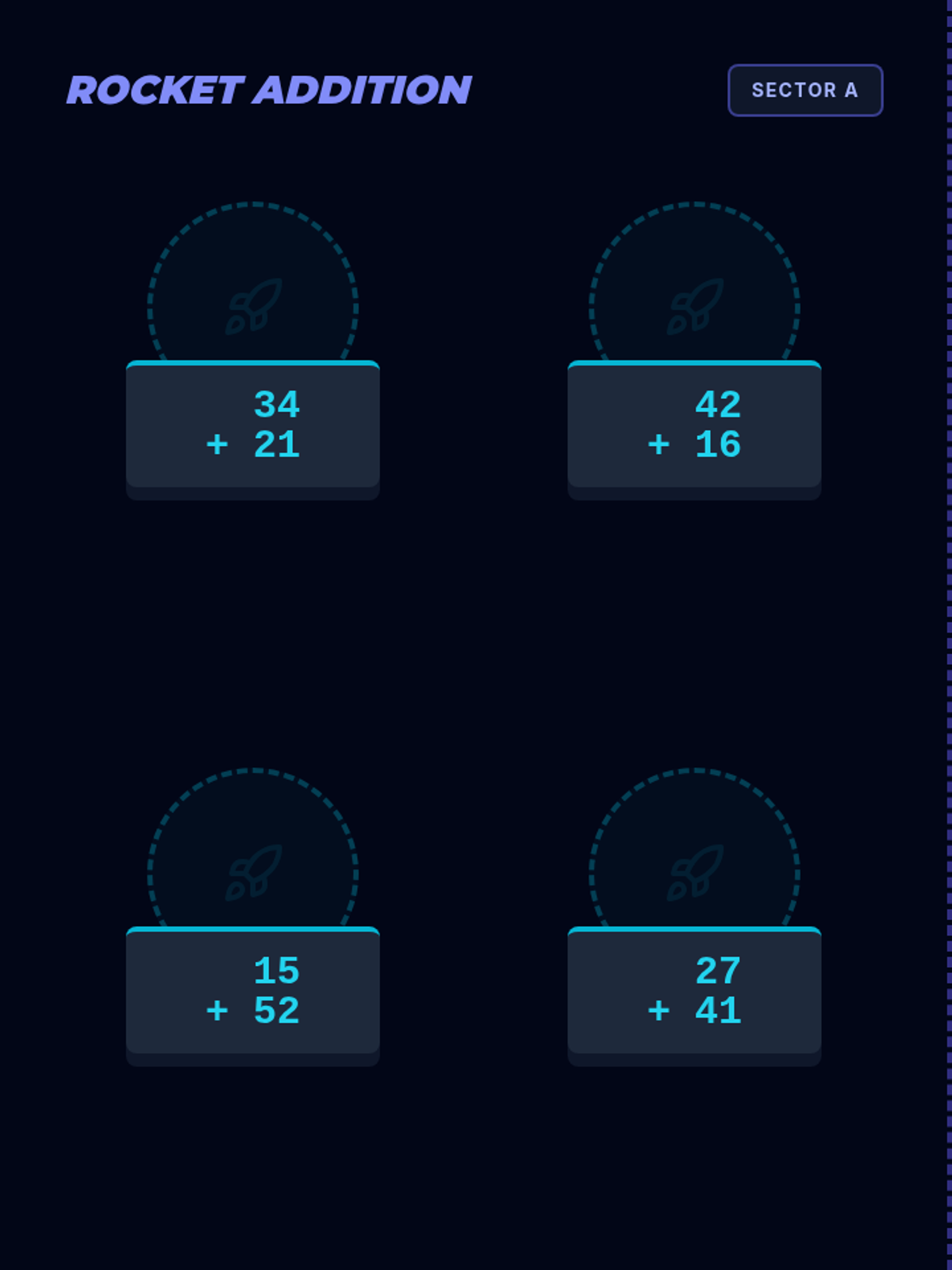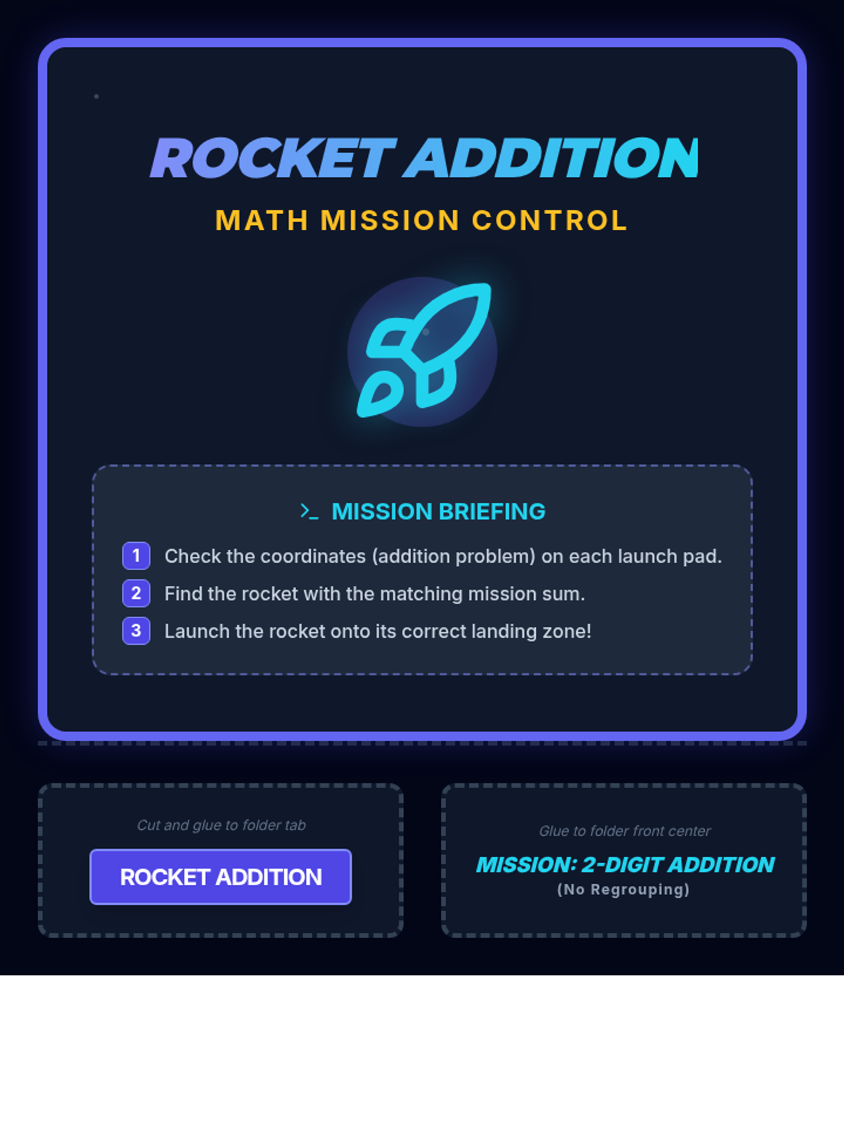 A collection of space-themed file folder games for practicing early math skills like 2-digit addition and subtraction. Includes rockets, stars, and planetary adventures.