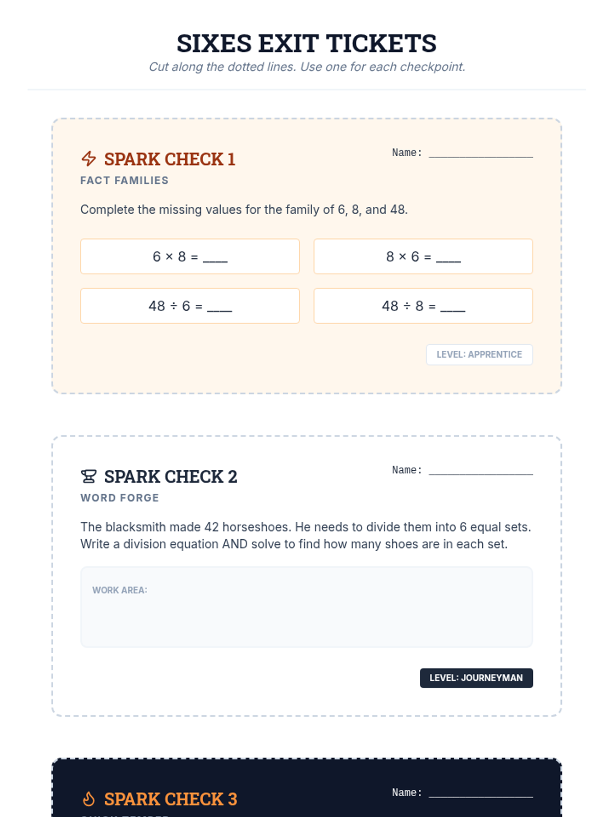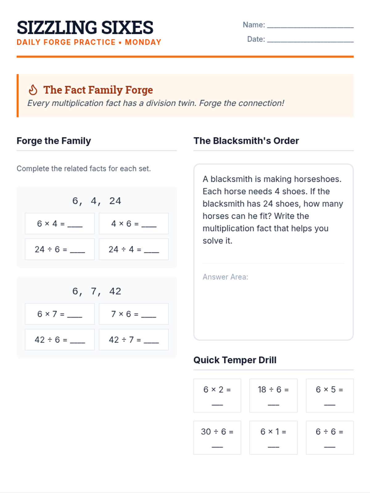 A three-week intensive unit focusing on multiplication and division fact families for factors 6, 7, and 8, using a blacksmith 'Factor Forge' theme to build math fluency and conceptual understanding.