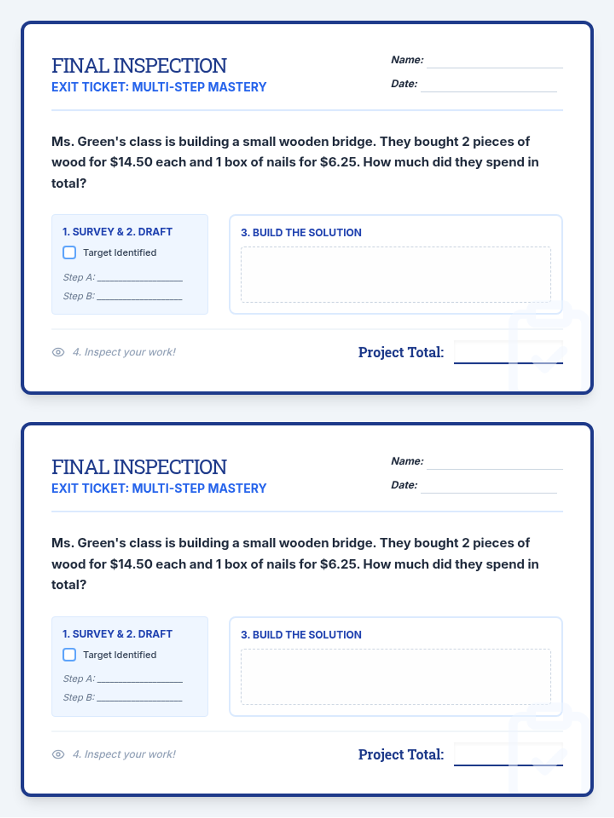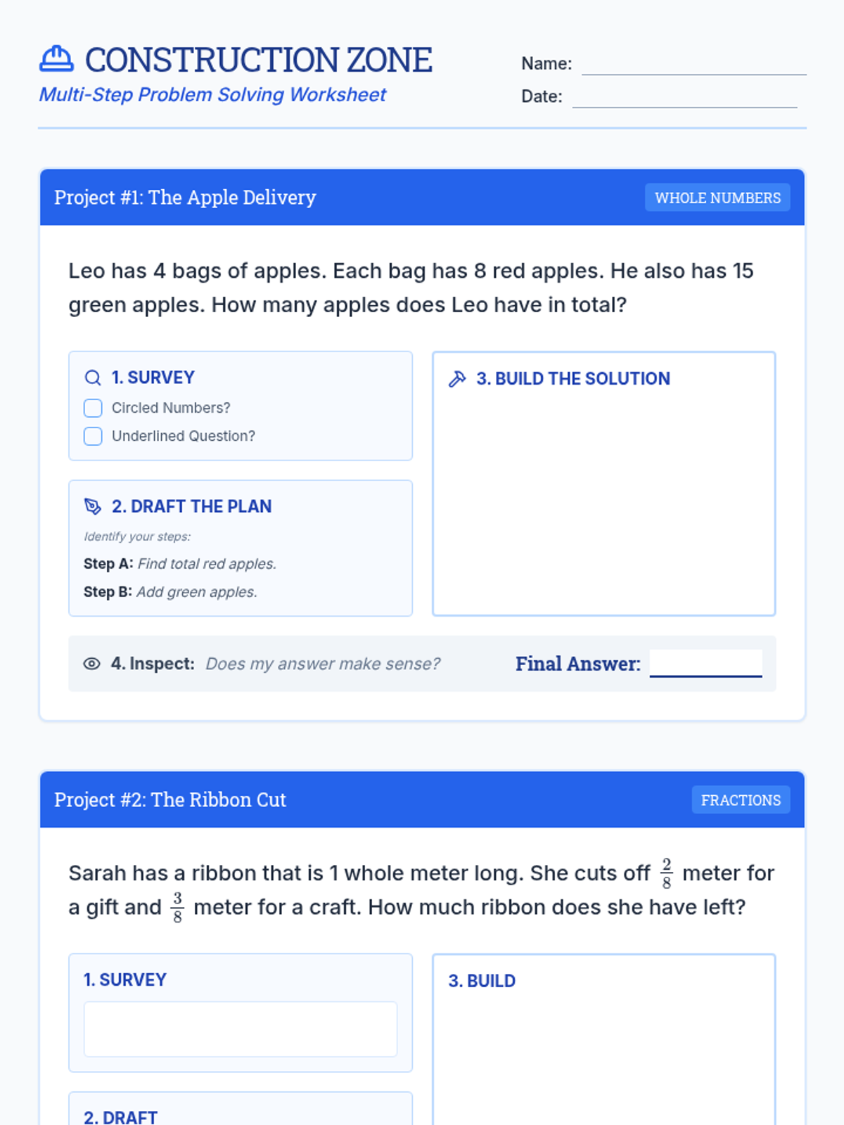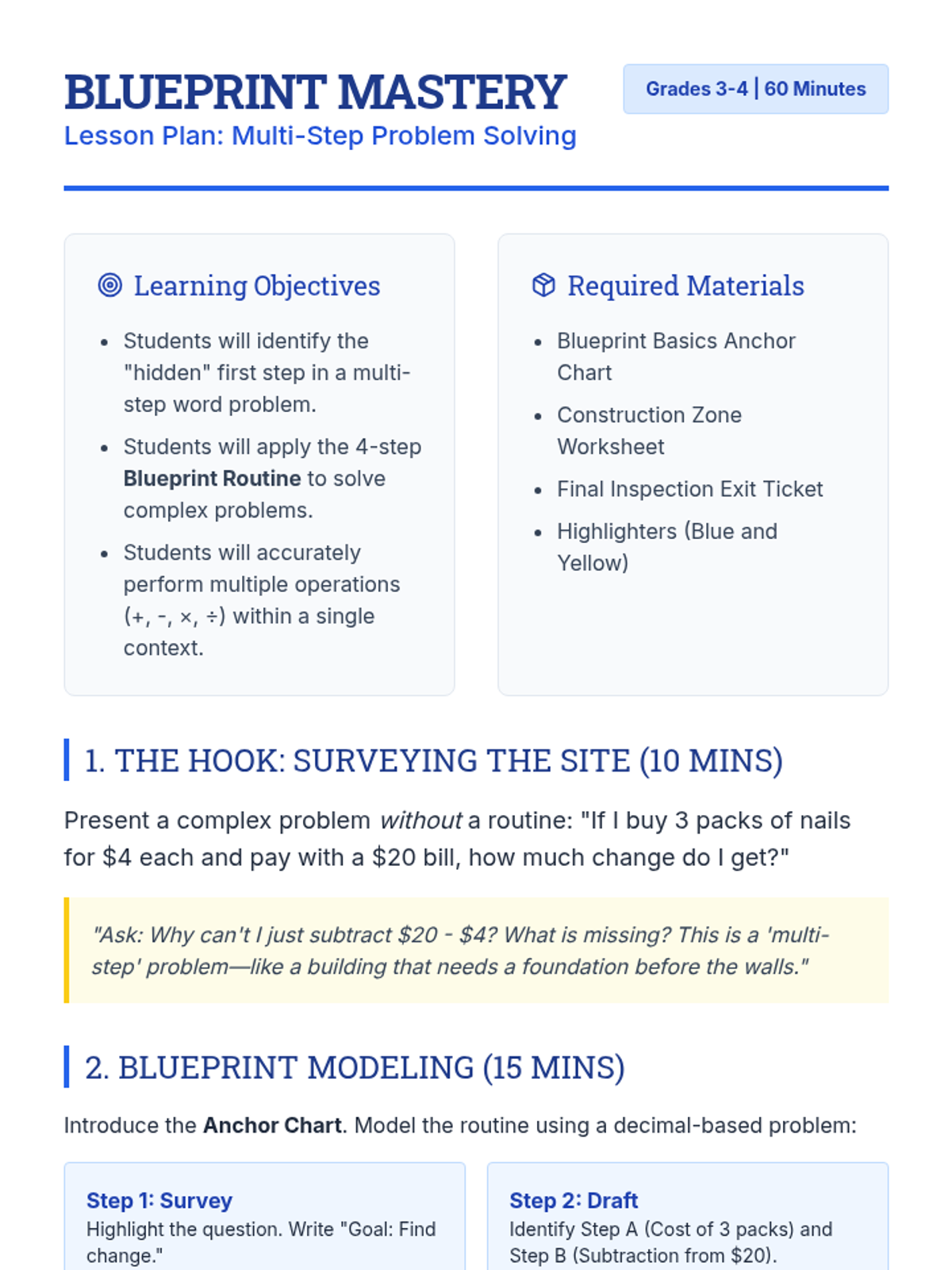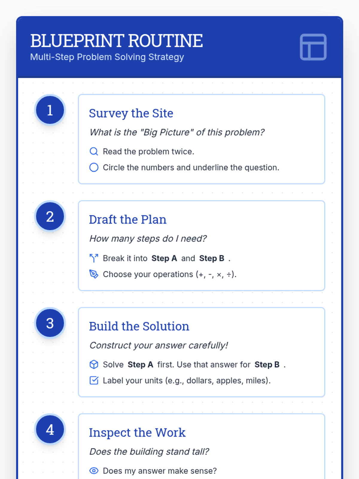 A comprehensive unit focusing on mastering multi-step word problems using a structured problem-solving routine. Students learn to break down complex problems involving whole numbers, fractions, and decimals using 'blueprint' thinking.