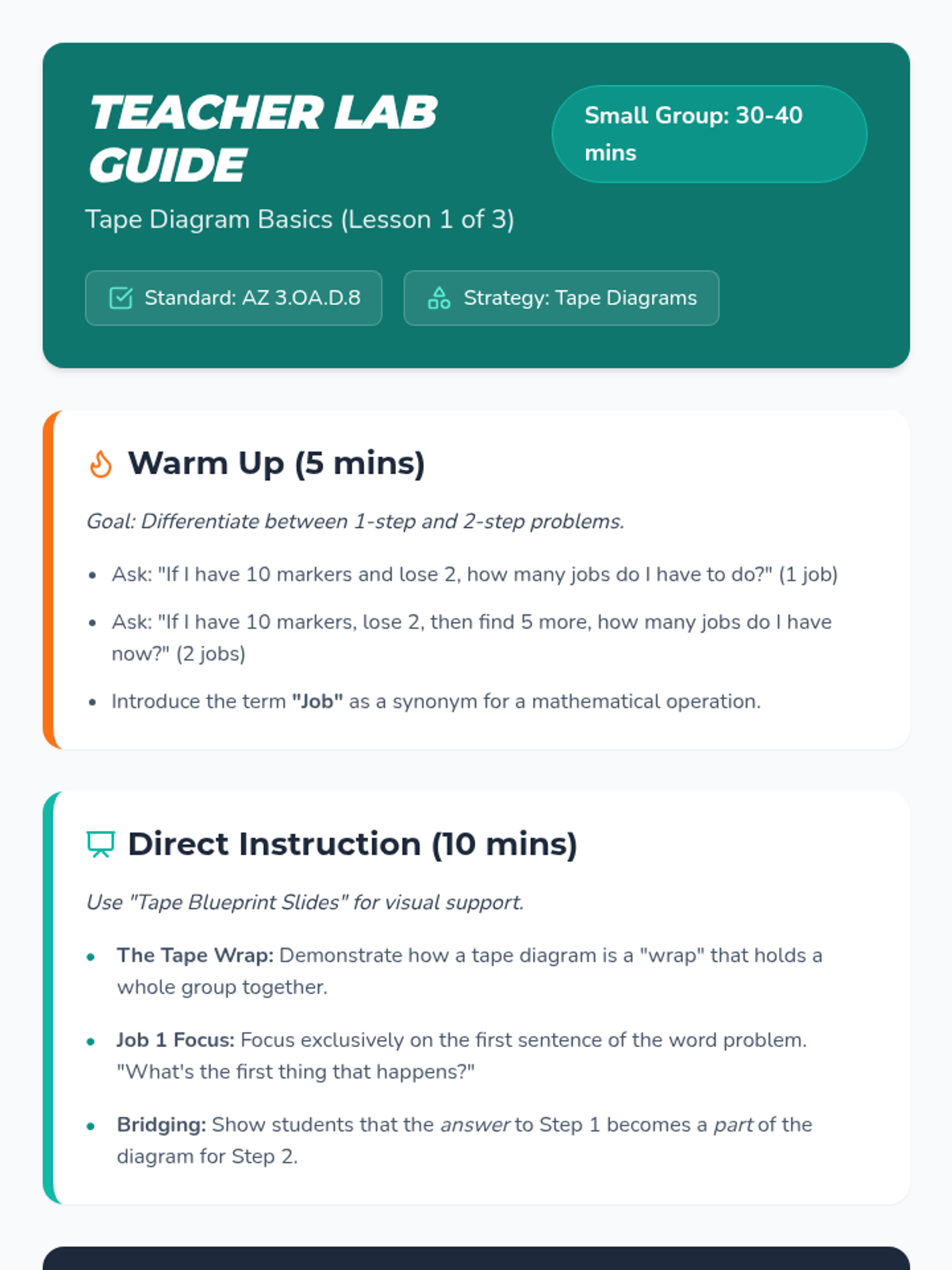 A comprehensive remedial unit for Arizona standard 3.OA.D.8, guiding students through two-step word problems using visual tape diagrams and algebraic equations.