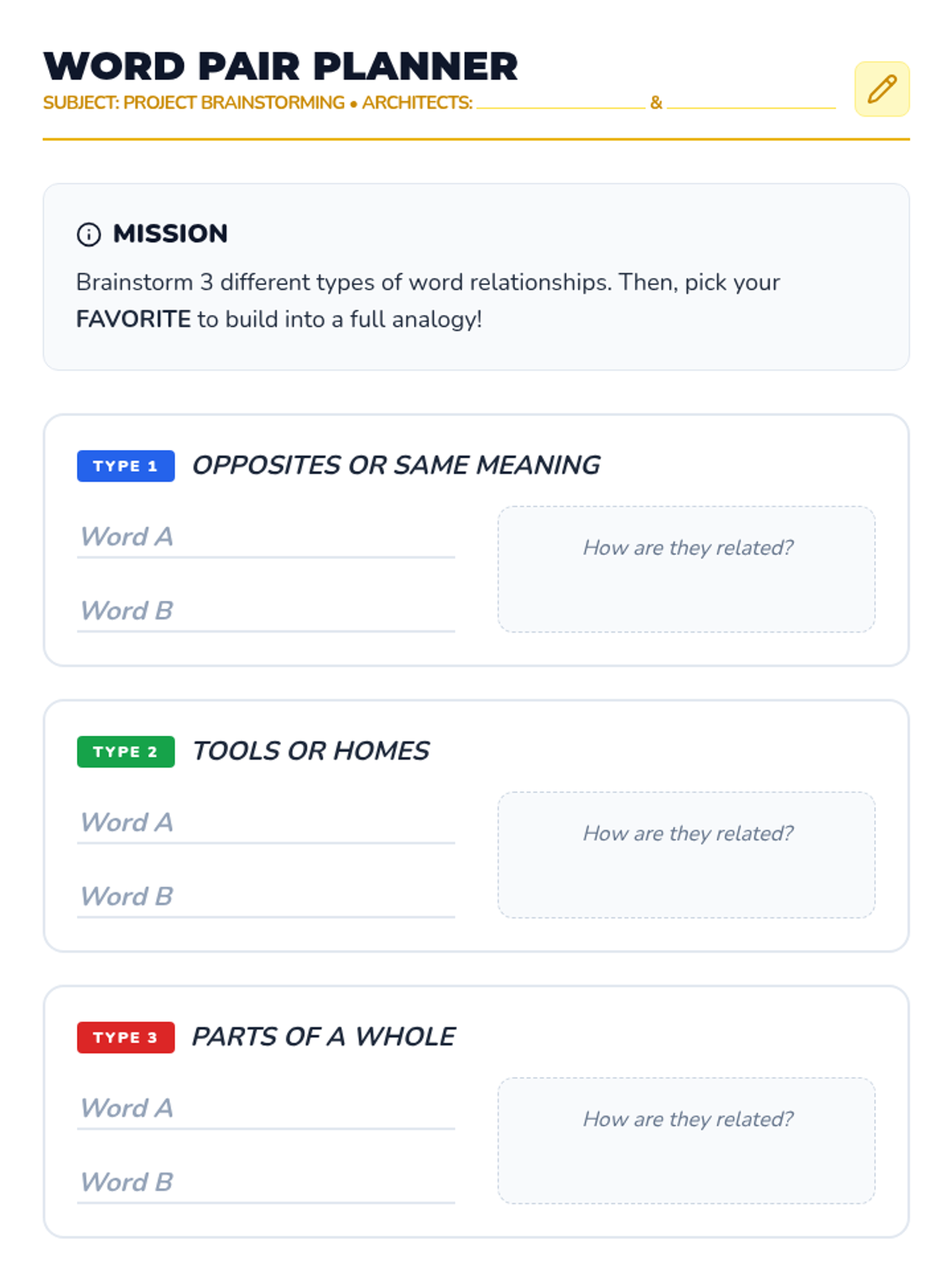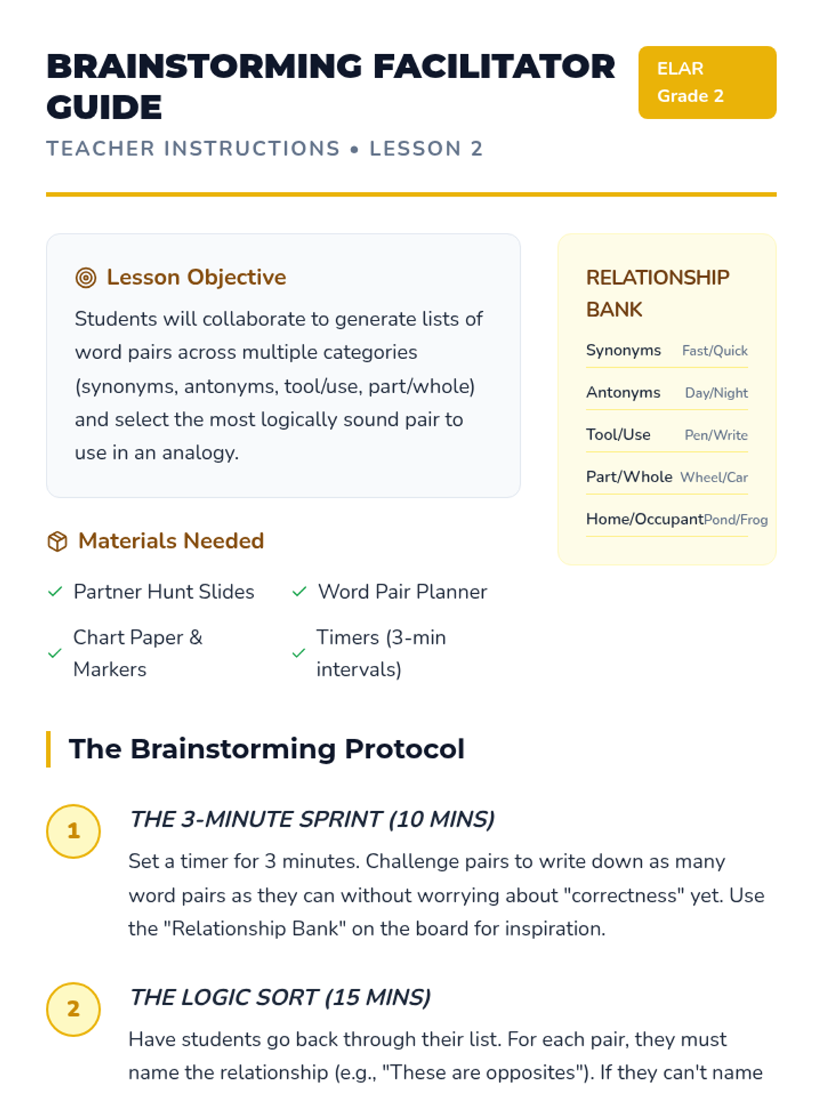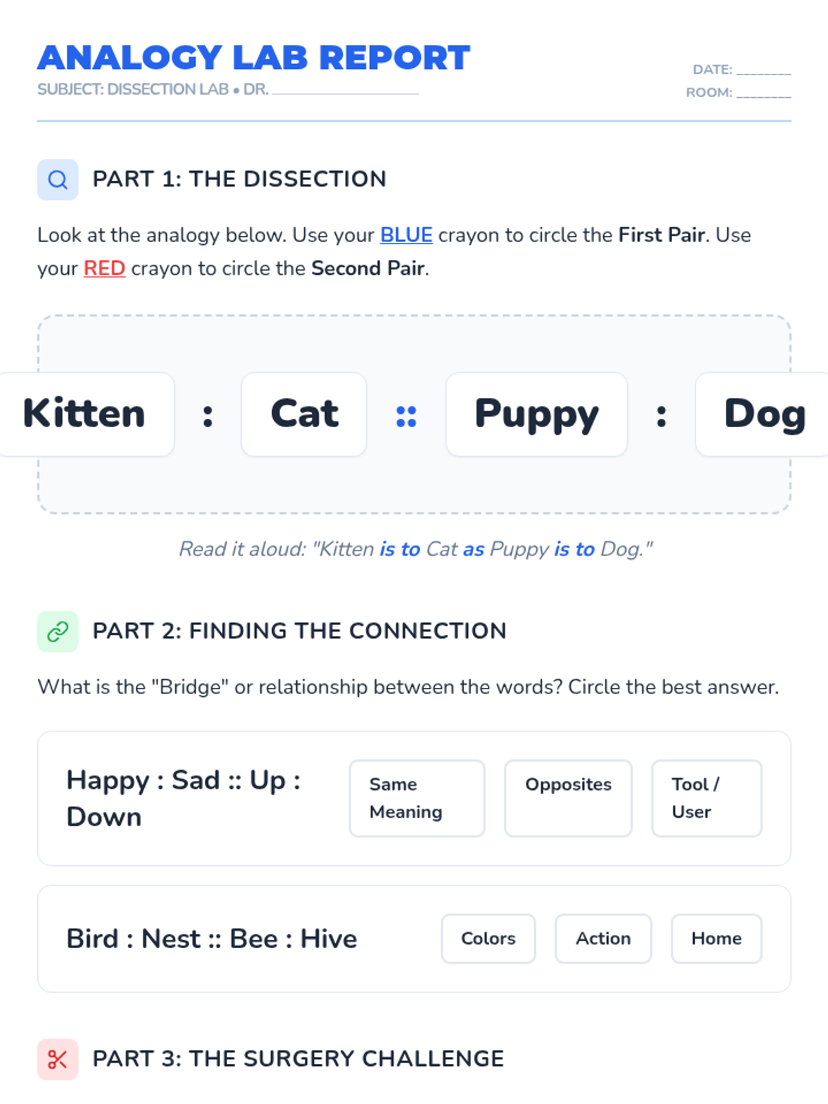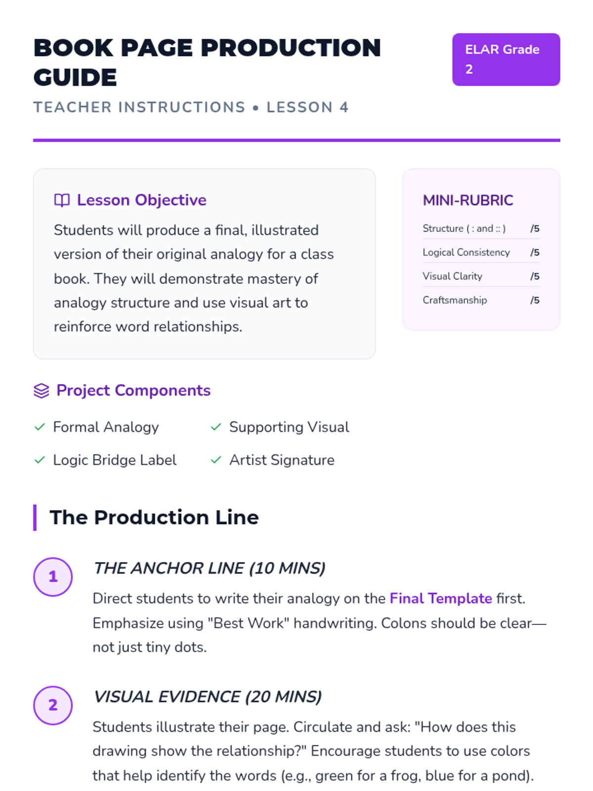 A project-based unit where 2nd-grade students learn the structure of analogies, brainstorm word pairs, and create an illustrated 'Book of Connections'. Students transition from solving analogies to designing their own logical puzzles.