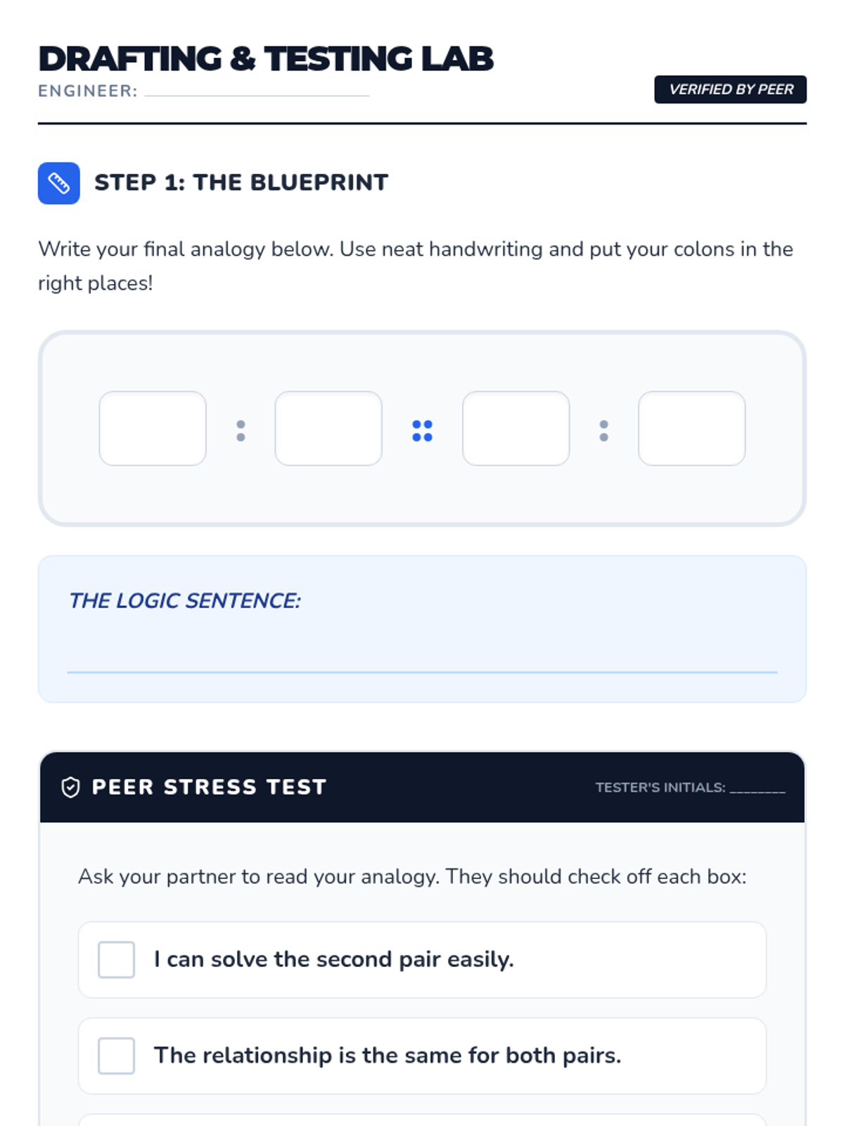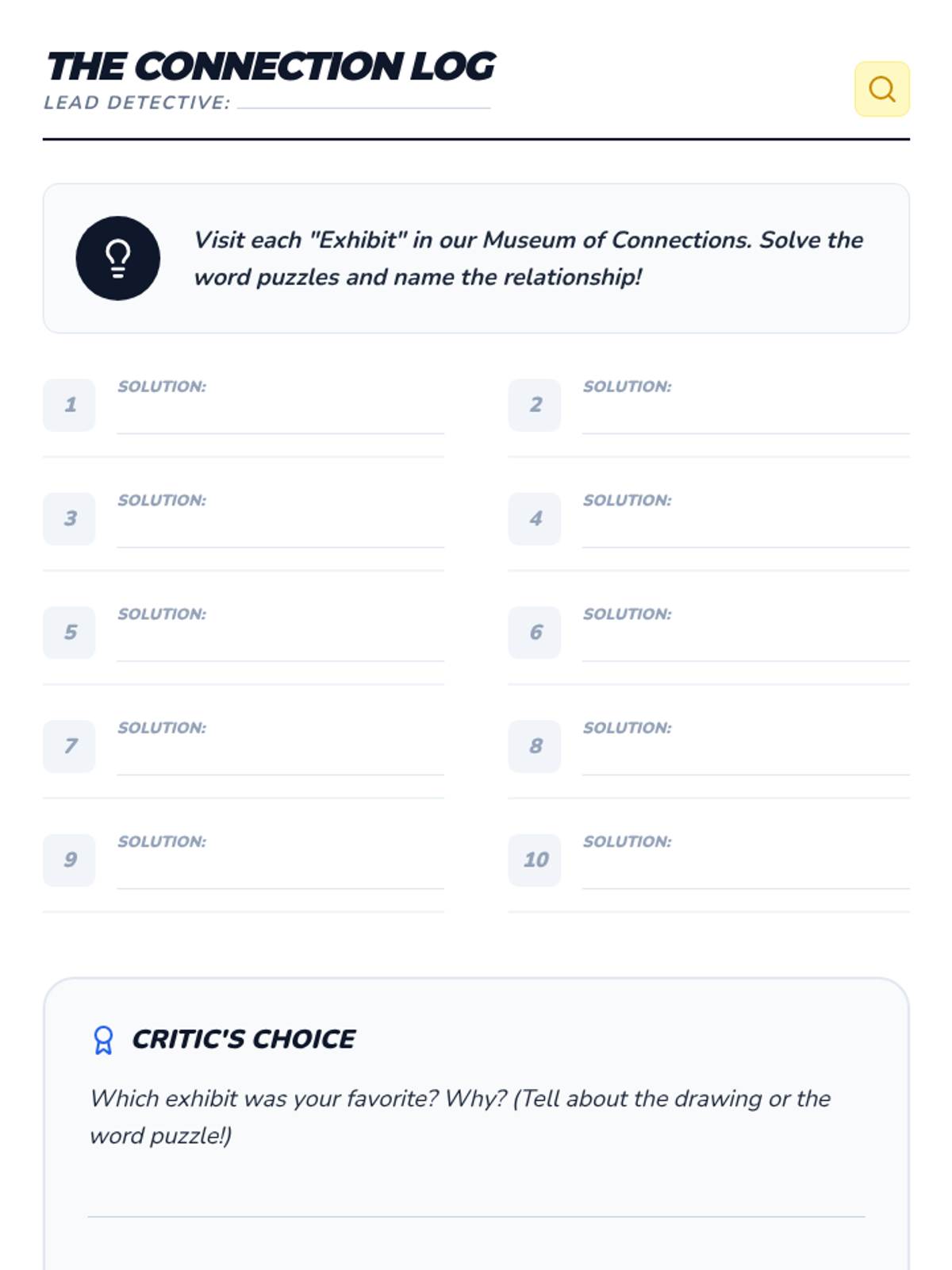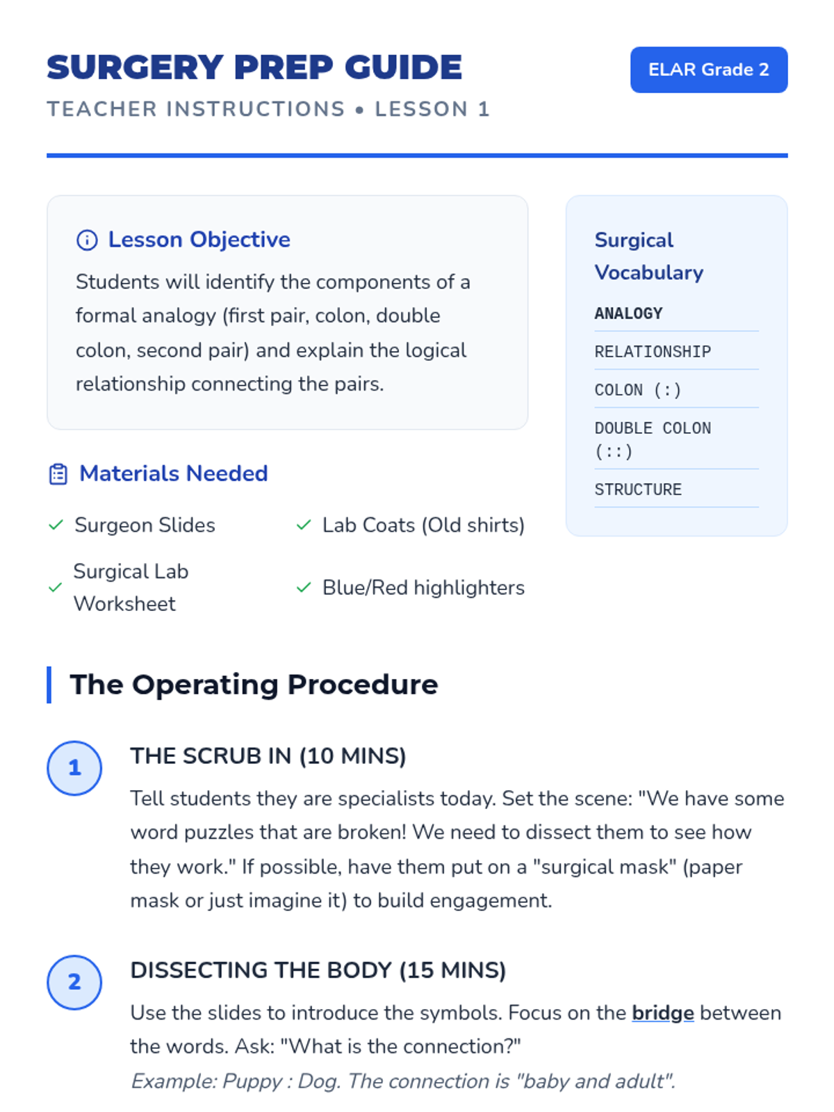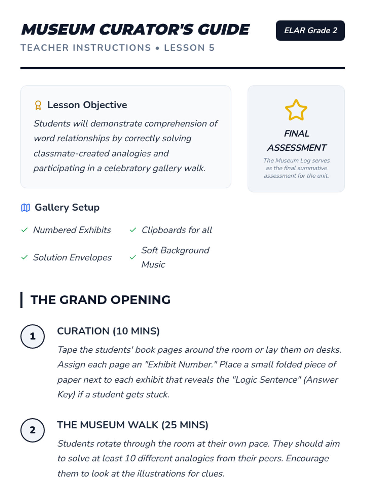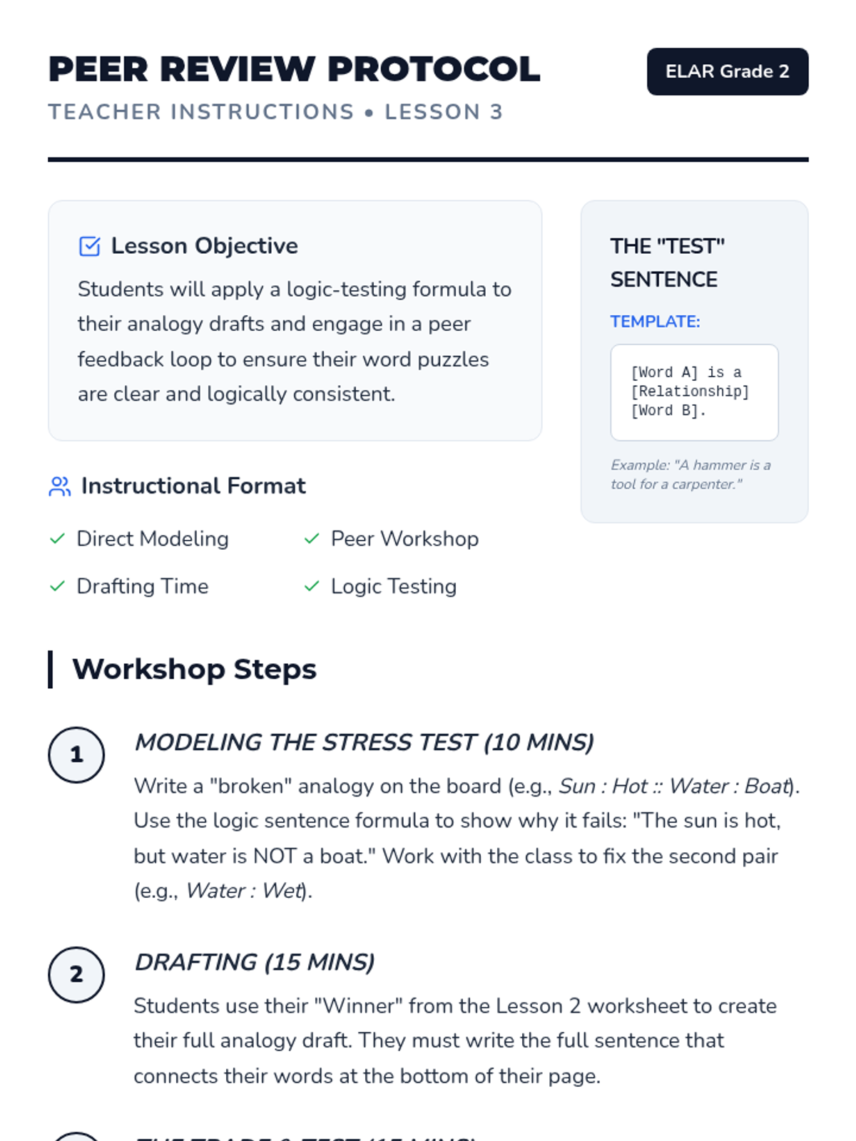 A project-based unit where 2nd-grade students learn the structure of analogies, brainstorm word pairs, and create an illustrated 'Book of Connections'. Students transition from solving analogies to designing their own logical puzzles.