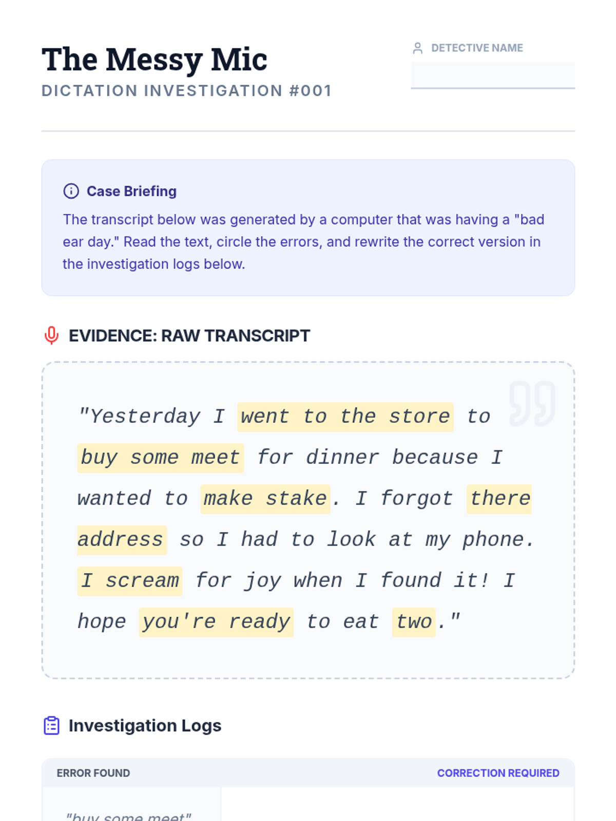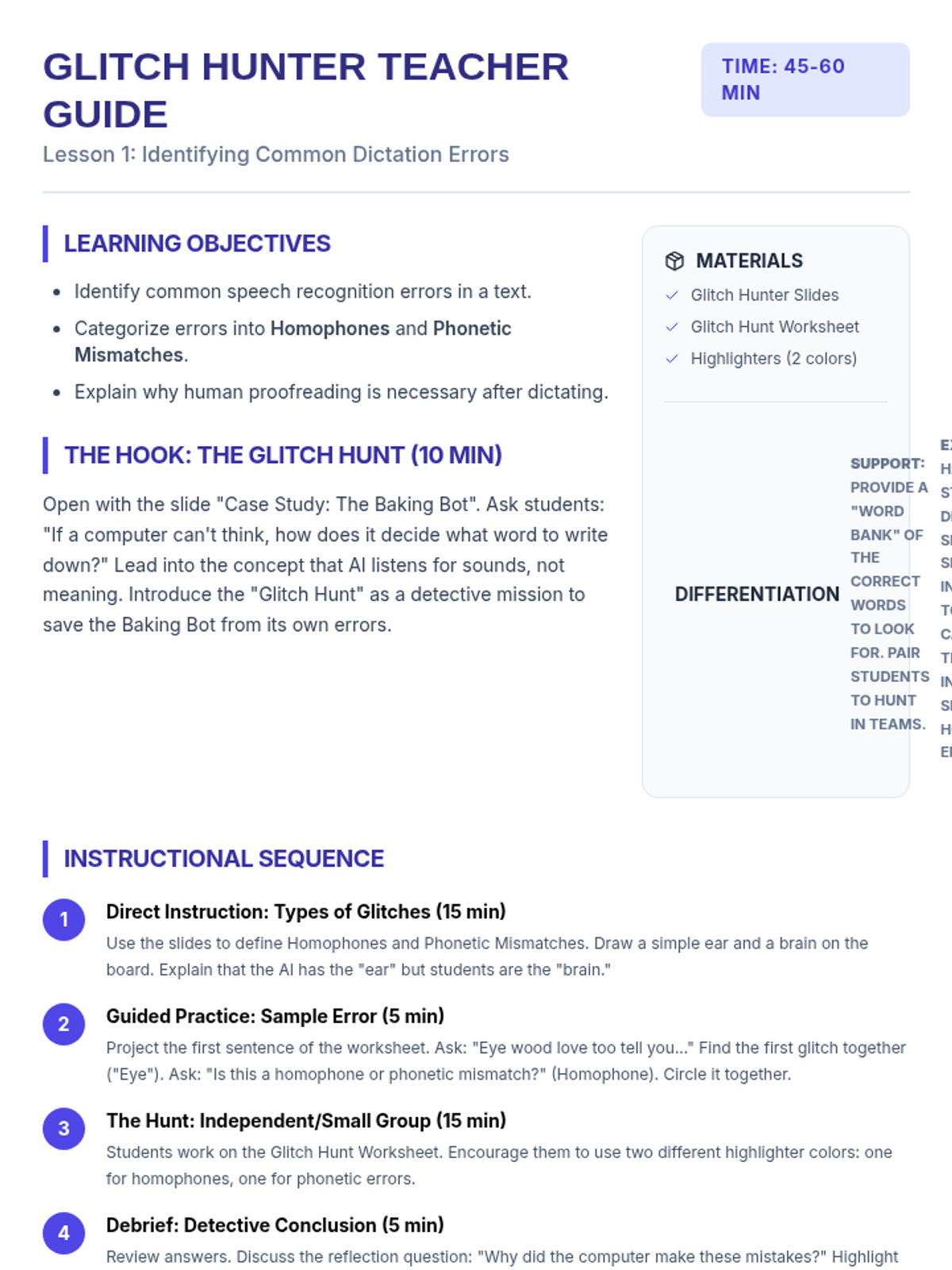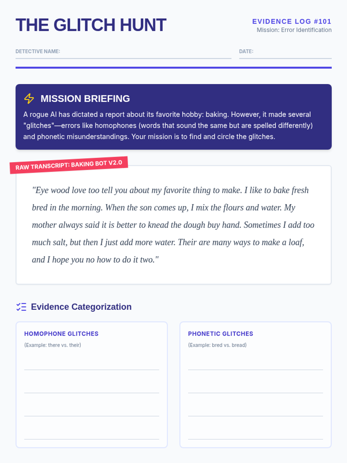 A comprehensive sequence designed for 6th-grade students to master the art of editing and refining text produced by speech recognition software. Students act as 'Digital Detectives' to identify AI glitches, apply systematic editing workflows, and format raw transcripts into professional documents.