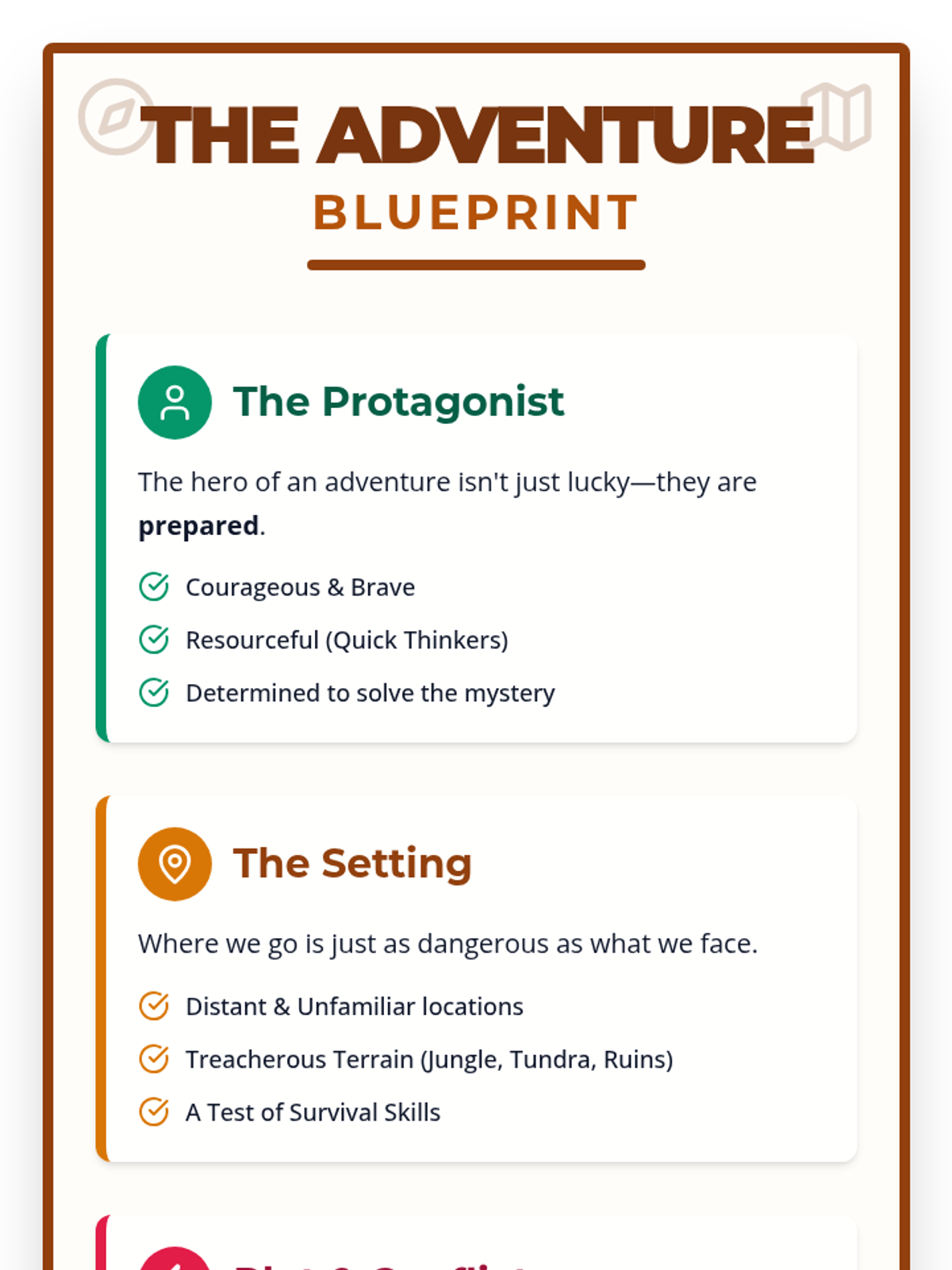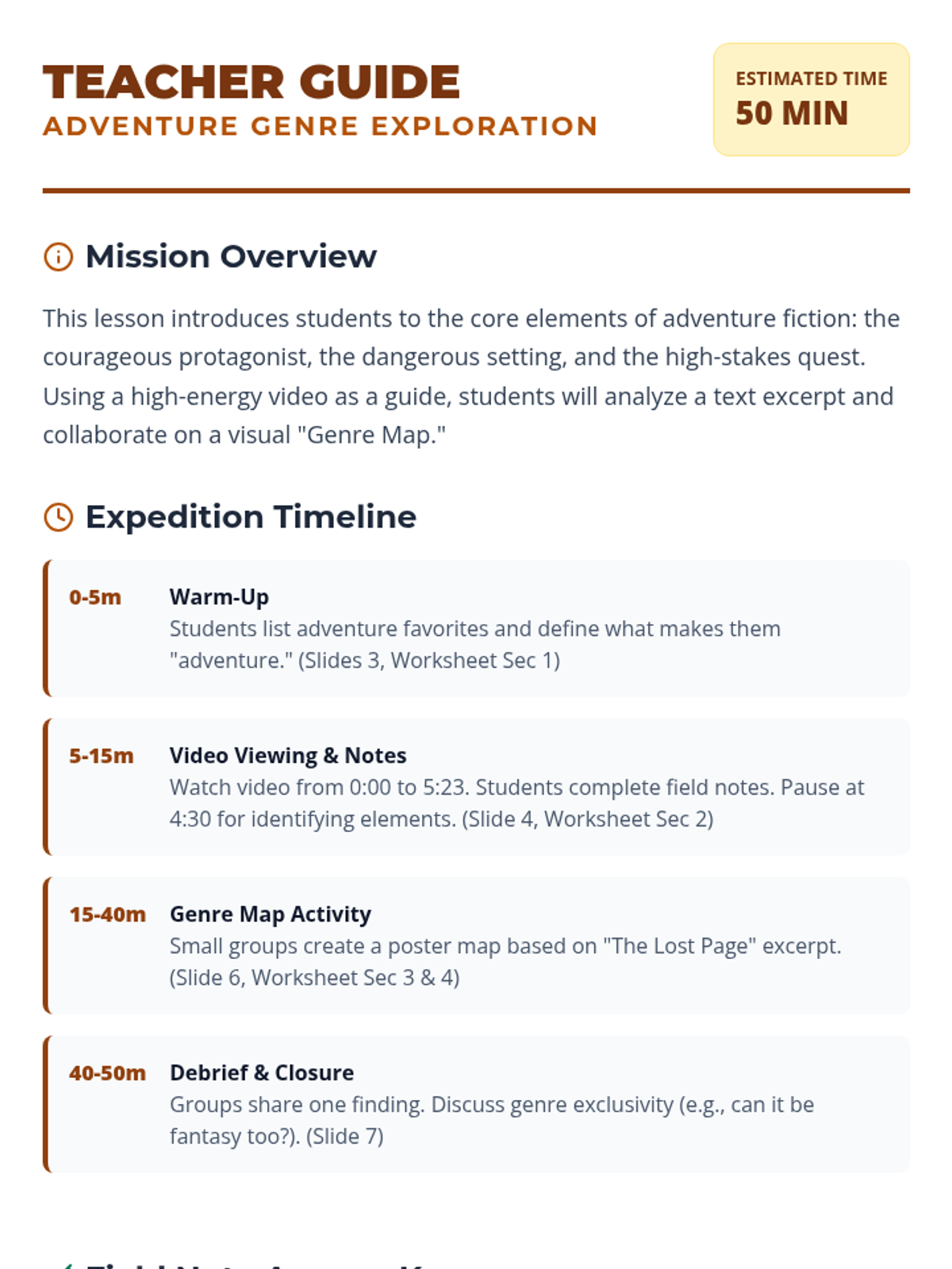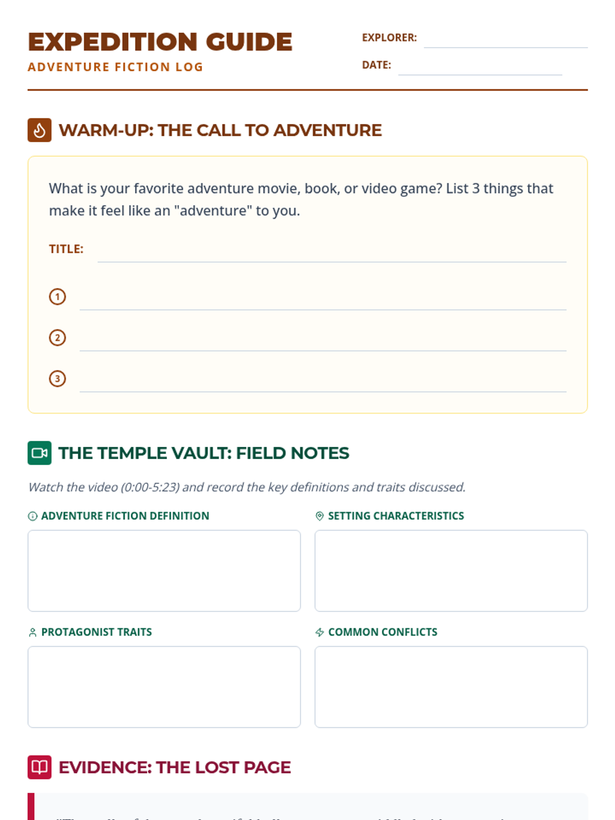 A comprehensive lesson sequence for middle school students to master the six elements of plot through video analysis, hands-on sorting, and text-based application. The unit follows a 'Plot Pathfinders' theme, mirroring the adventure-quest narrative of the instructional video.