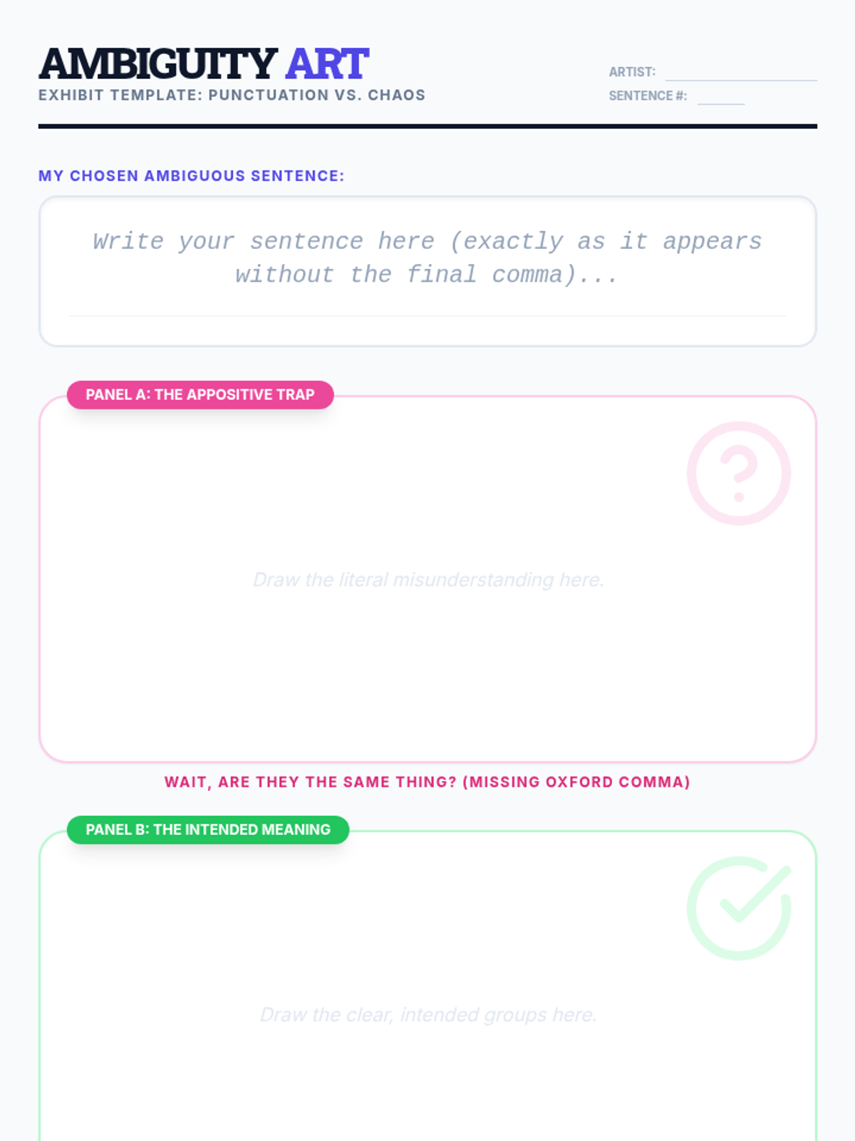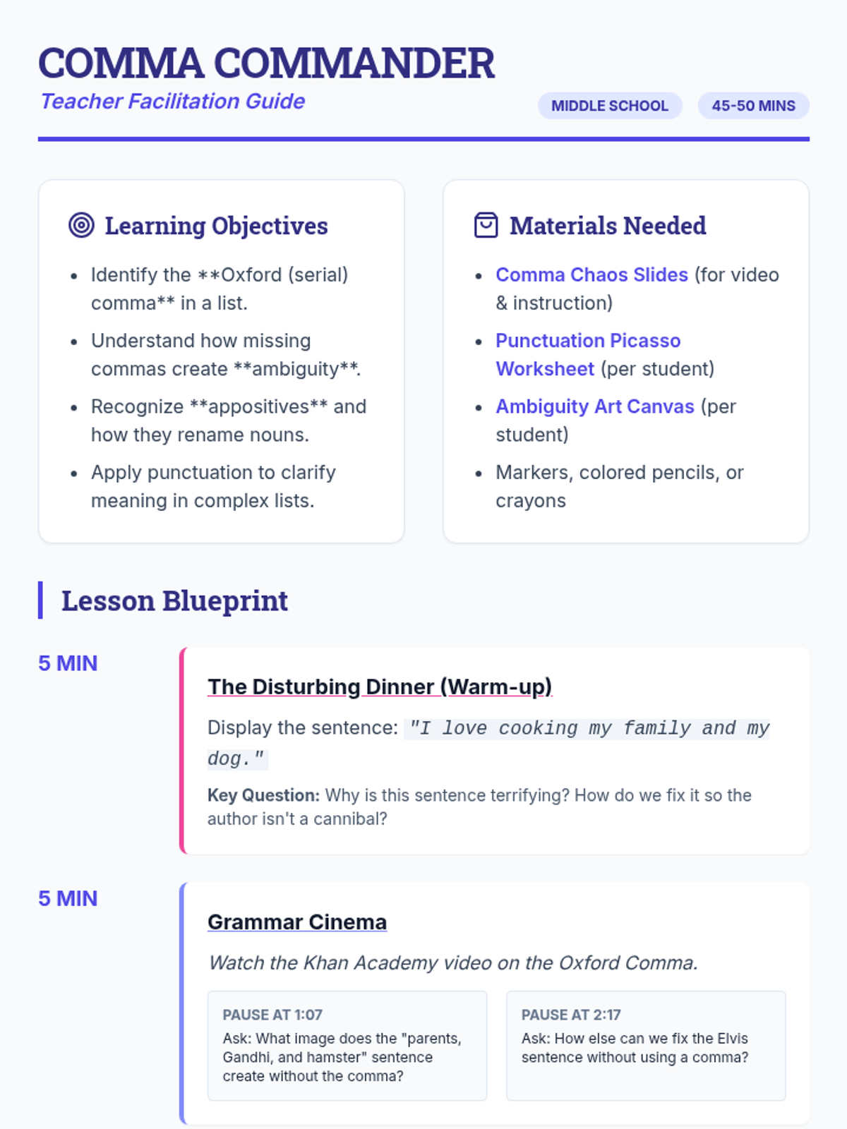 A short unit focusing on the power of punctuation, specifically the Oxford comma, to prevent ambiguity and the role of appositives in sentence structure.
