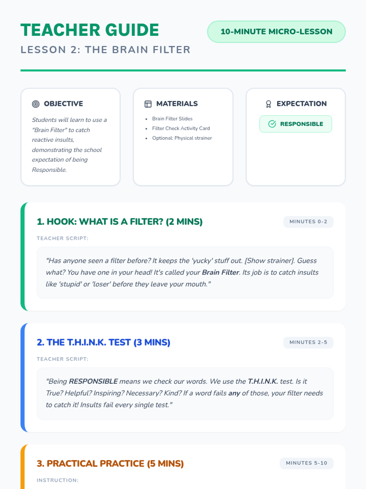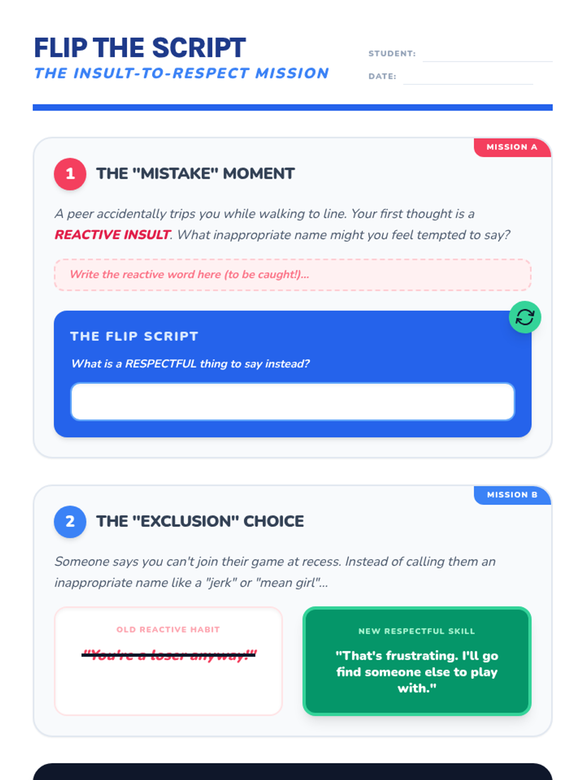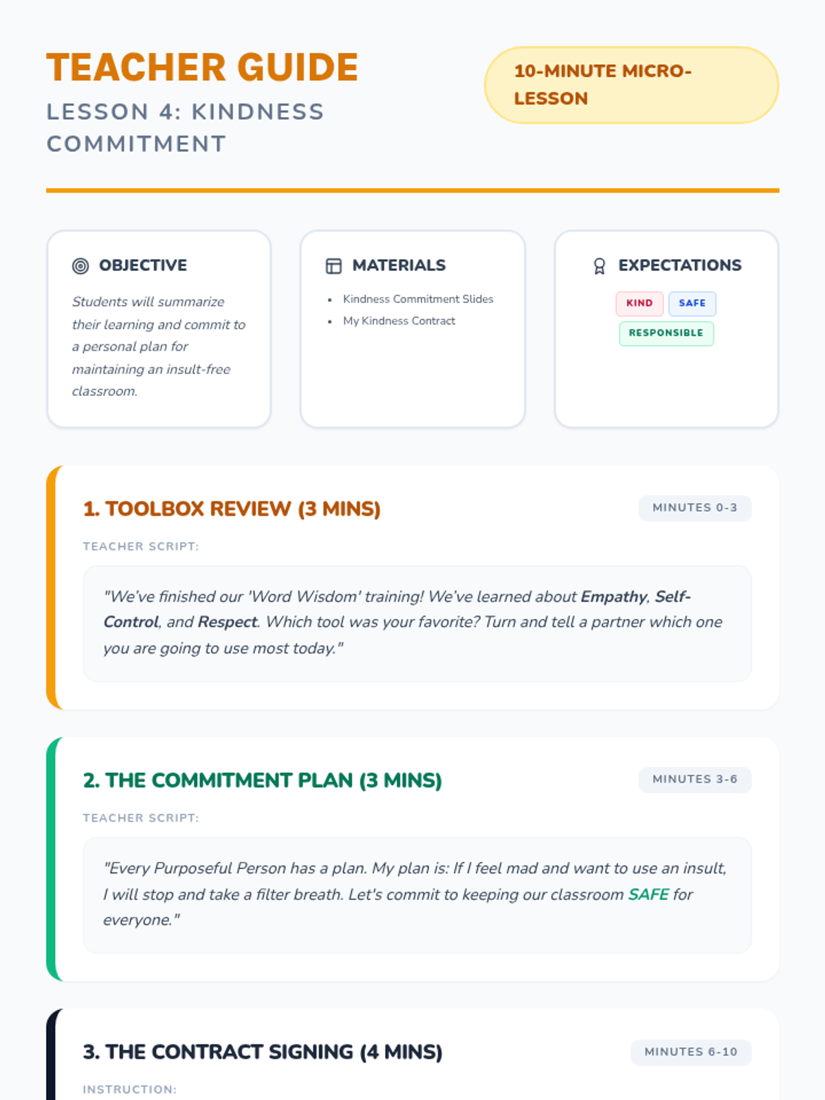 A series of four 10-minute micro-lessons designed for 3rd graders to build empathy, self-control, and respect. Using the 'Think Before You Speak' framework and the book Chrysanthemum, students learn to replace name-calling with responsible and kind choices aligned with school expectations.