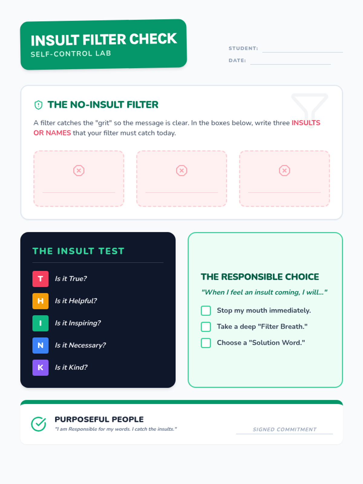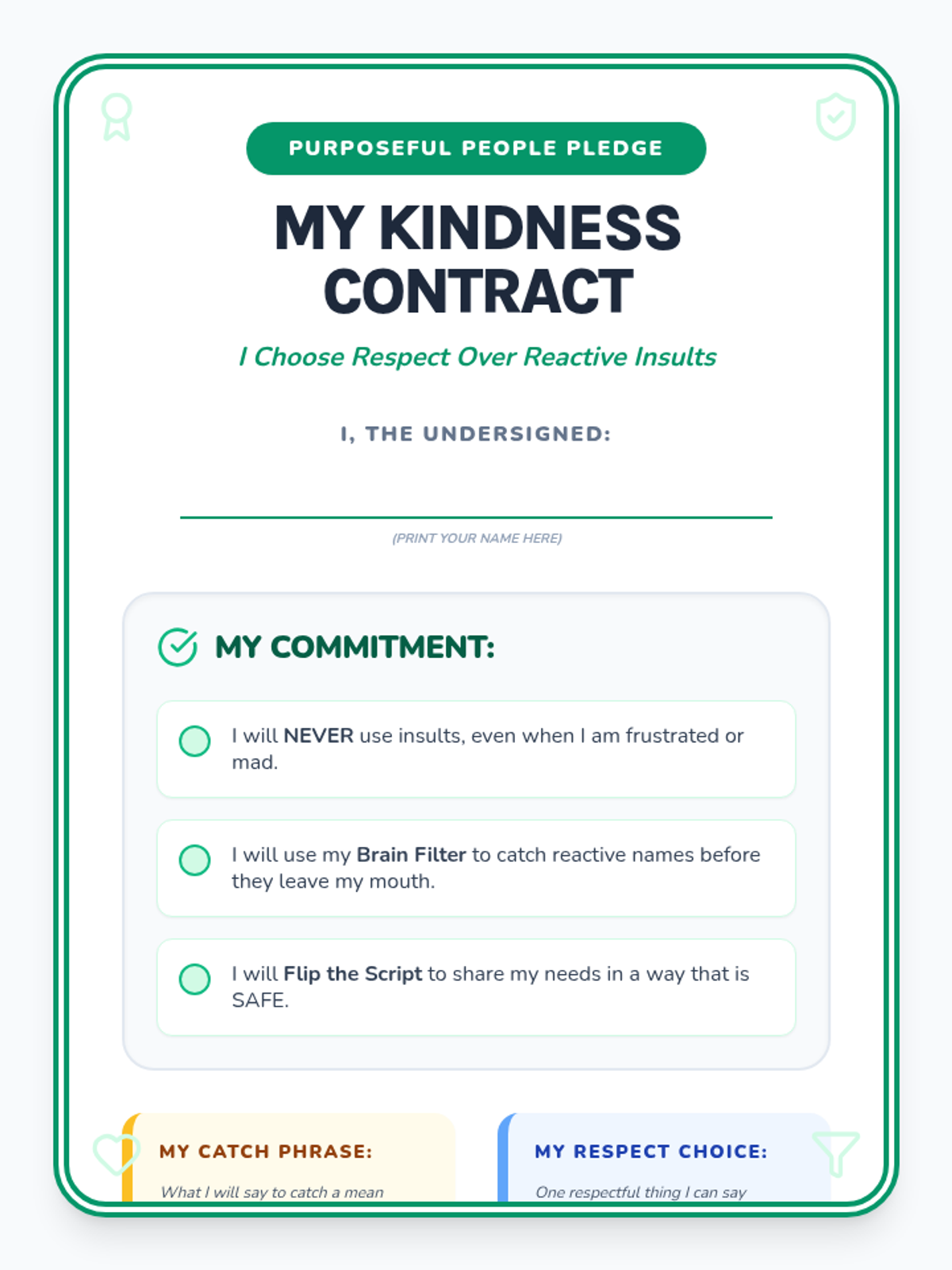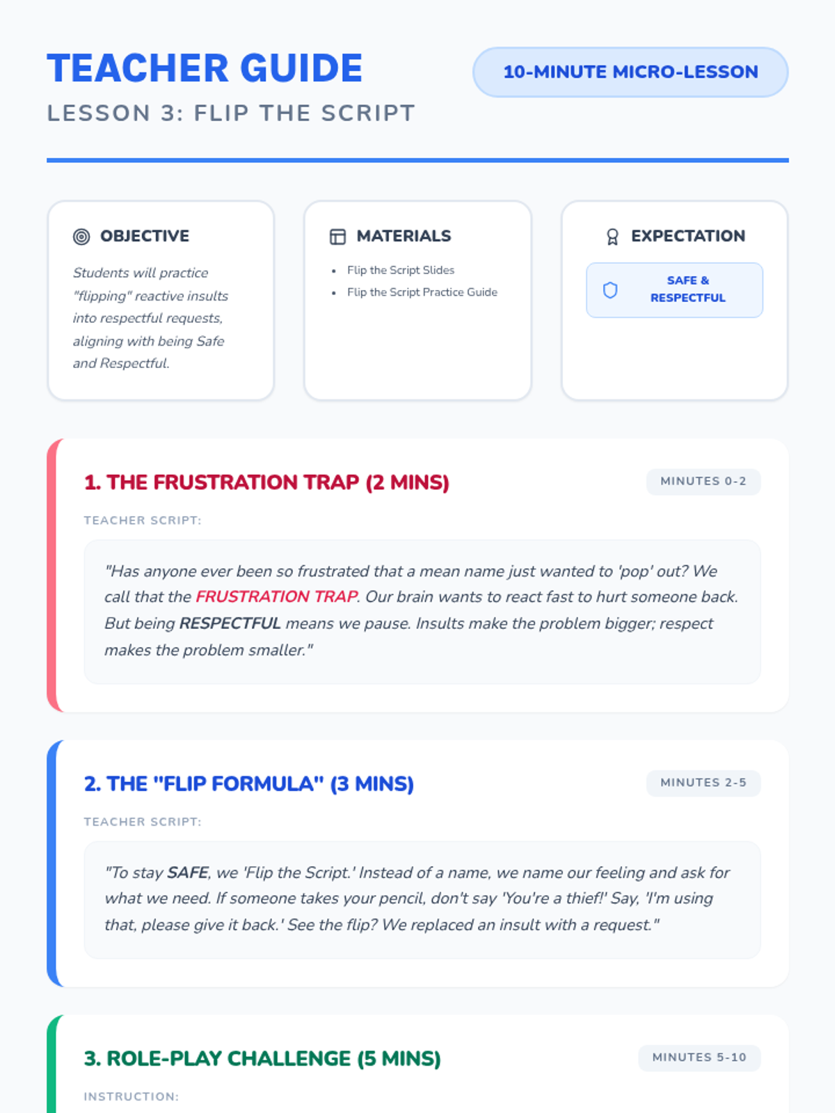 A series of four 10-minute micro-lessons designed for 3rd graders to build empathy, self-control, and respect. Using the 'Think Before You Speak' framework and the book Chrysanthemum, students learn to replace name-calling with responsible and kind choices aligned with school expectations.