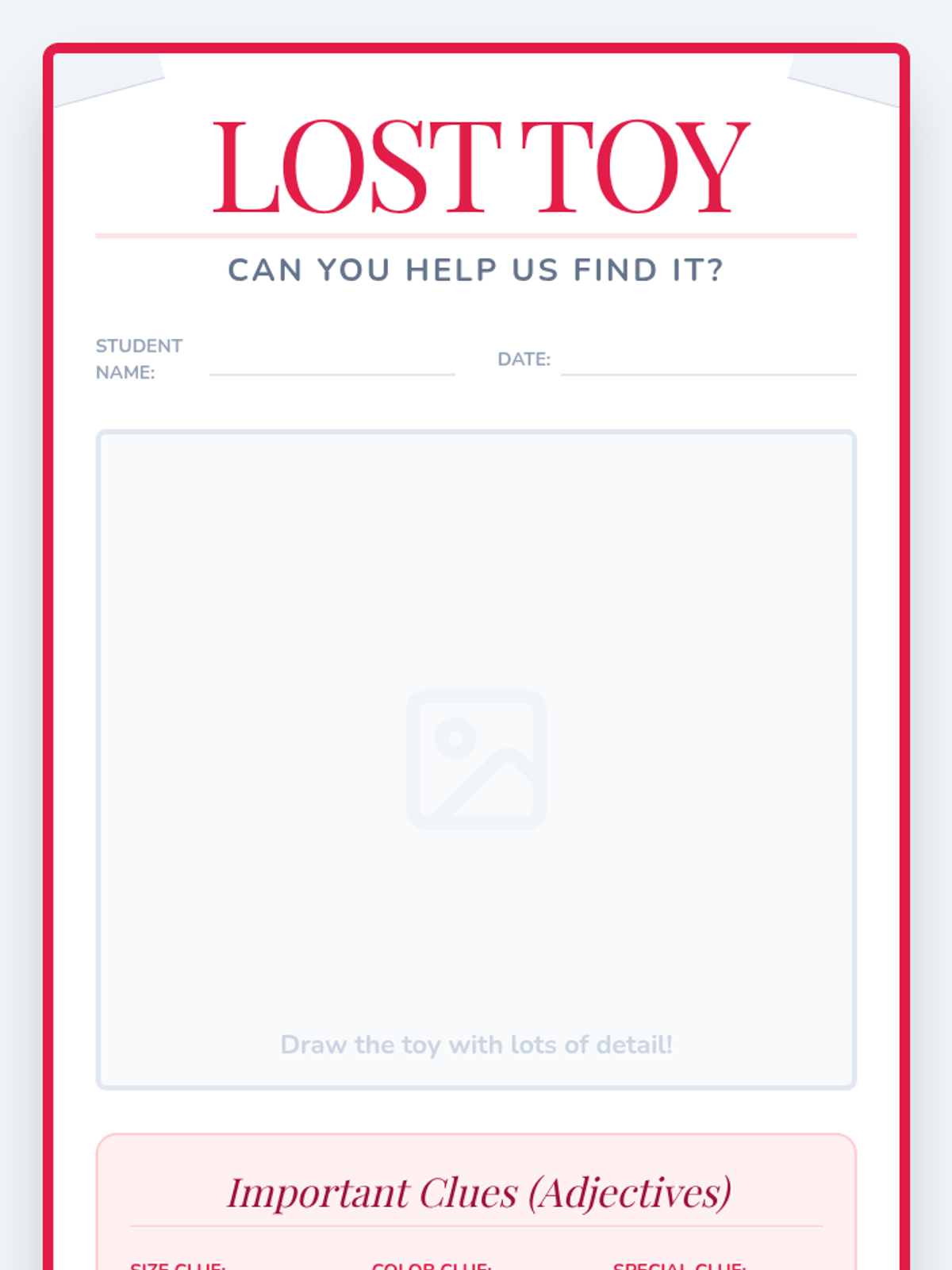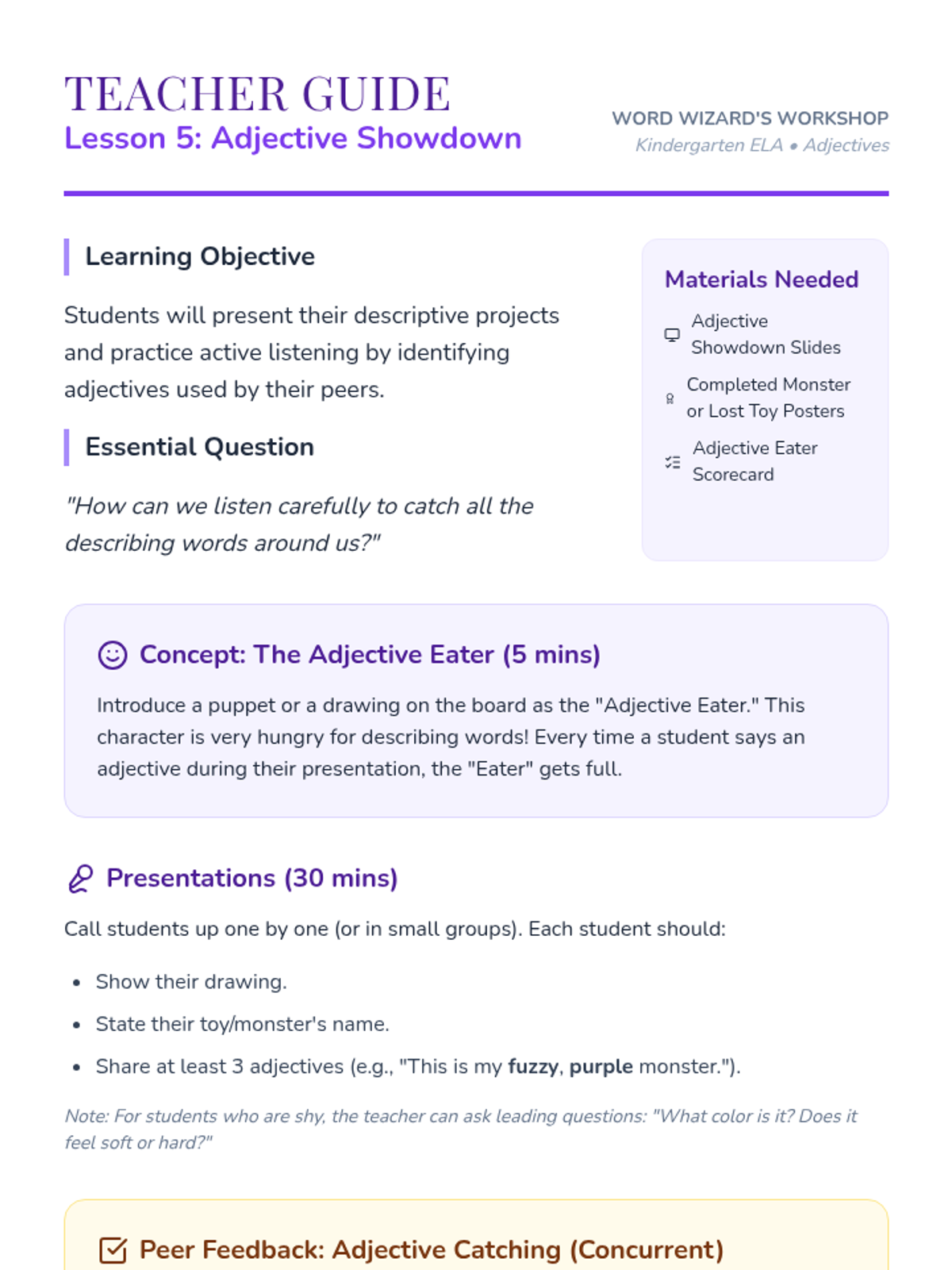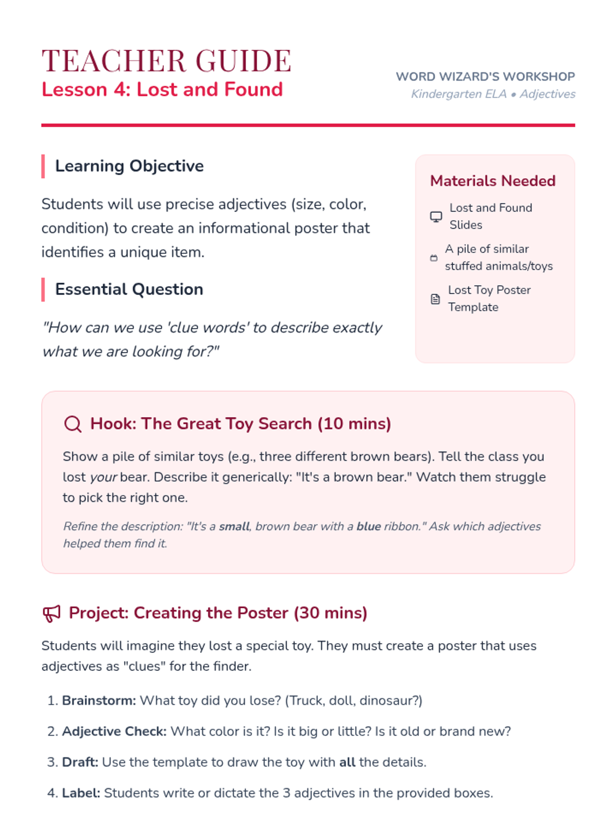A Kindergarten ELA sequence where students learn to use descriptive adjectives through character analysis, monster design, and sensory exploration, culminating in a creative 'Lost Toy' poster project.