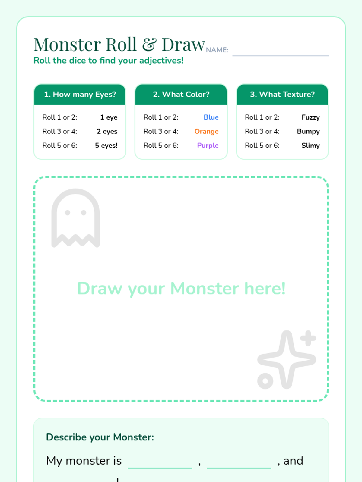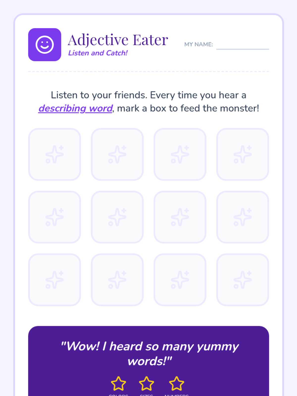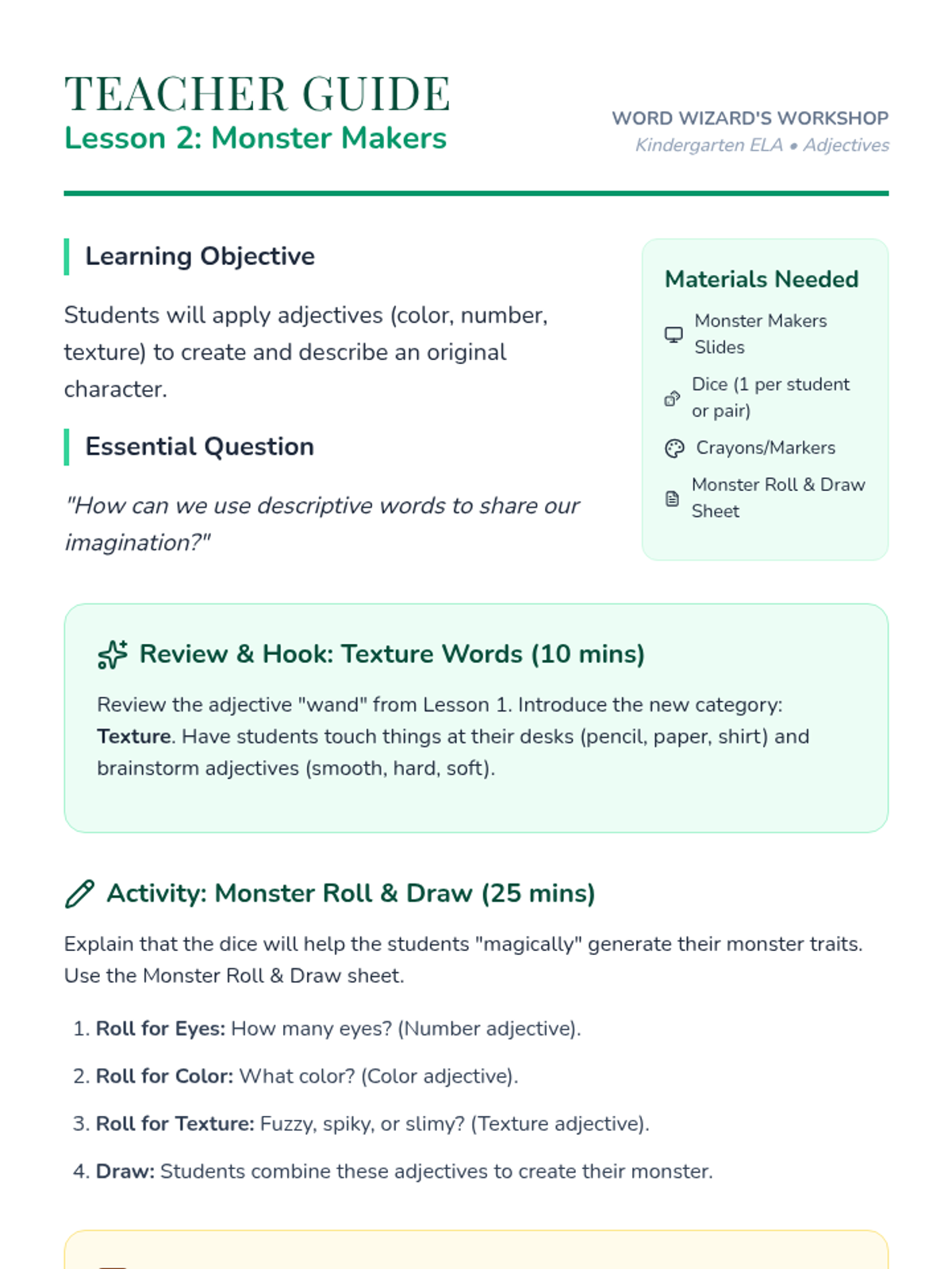 A Kindergarten ELA sequence where students learn to use descriptive adjectives through character analysis, monster design, and sensory exploration, culminating in a creative 'Lost Toy' poster project.