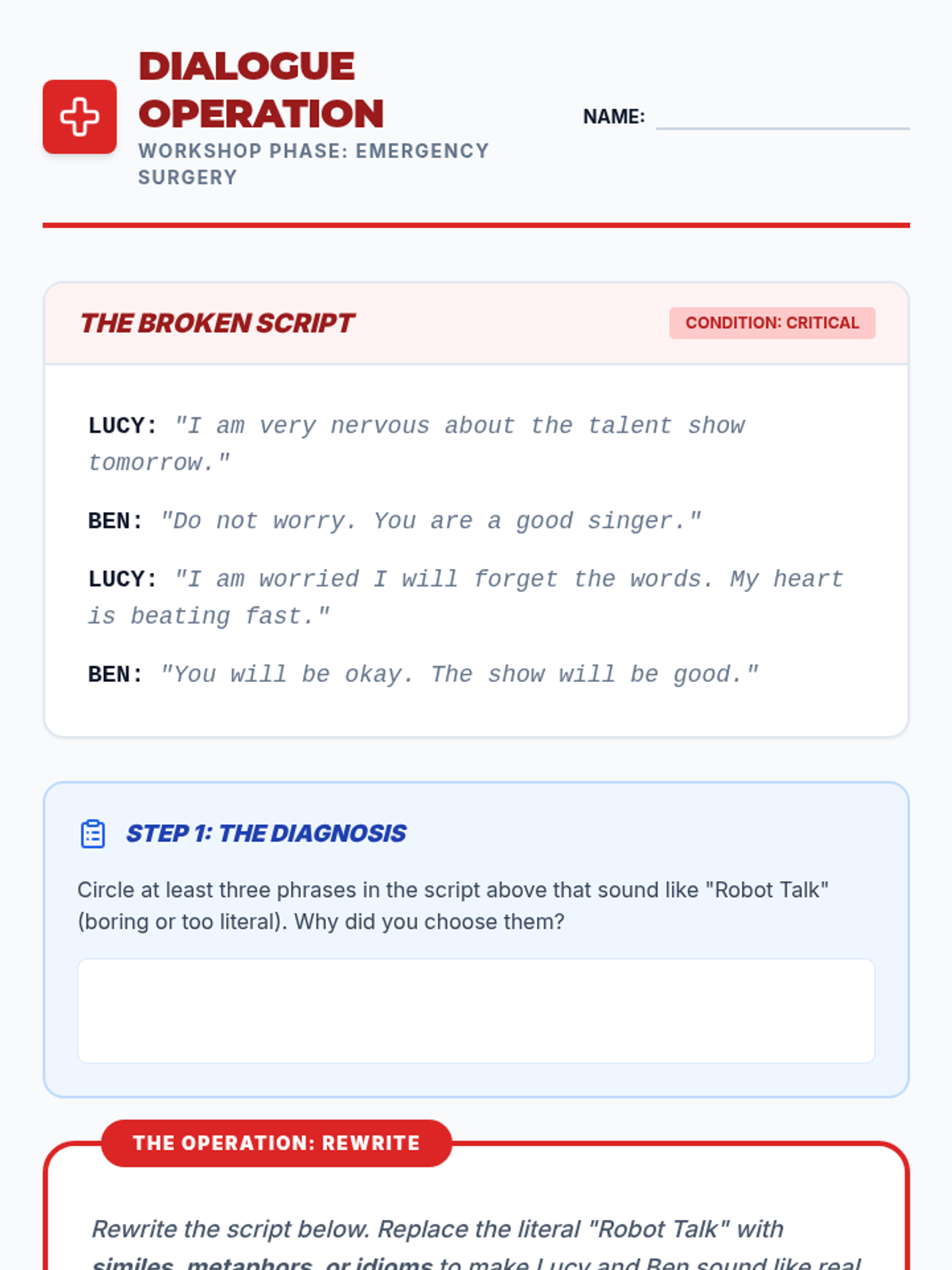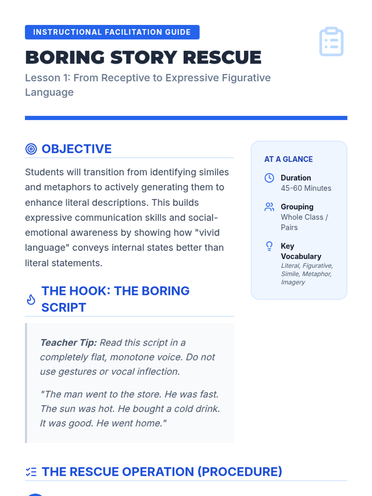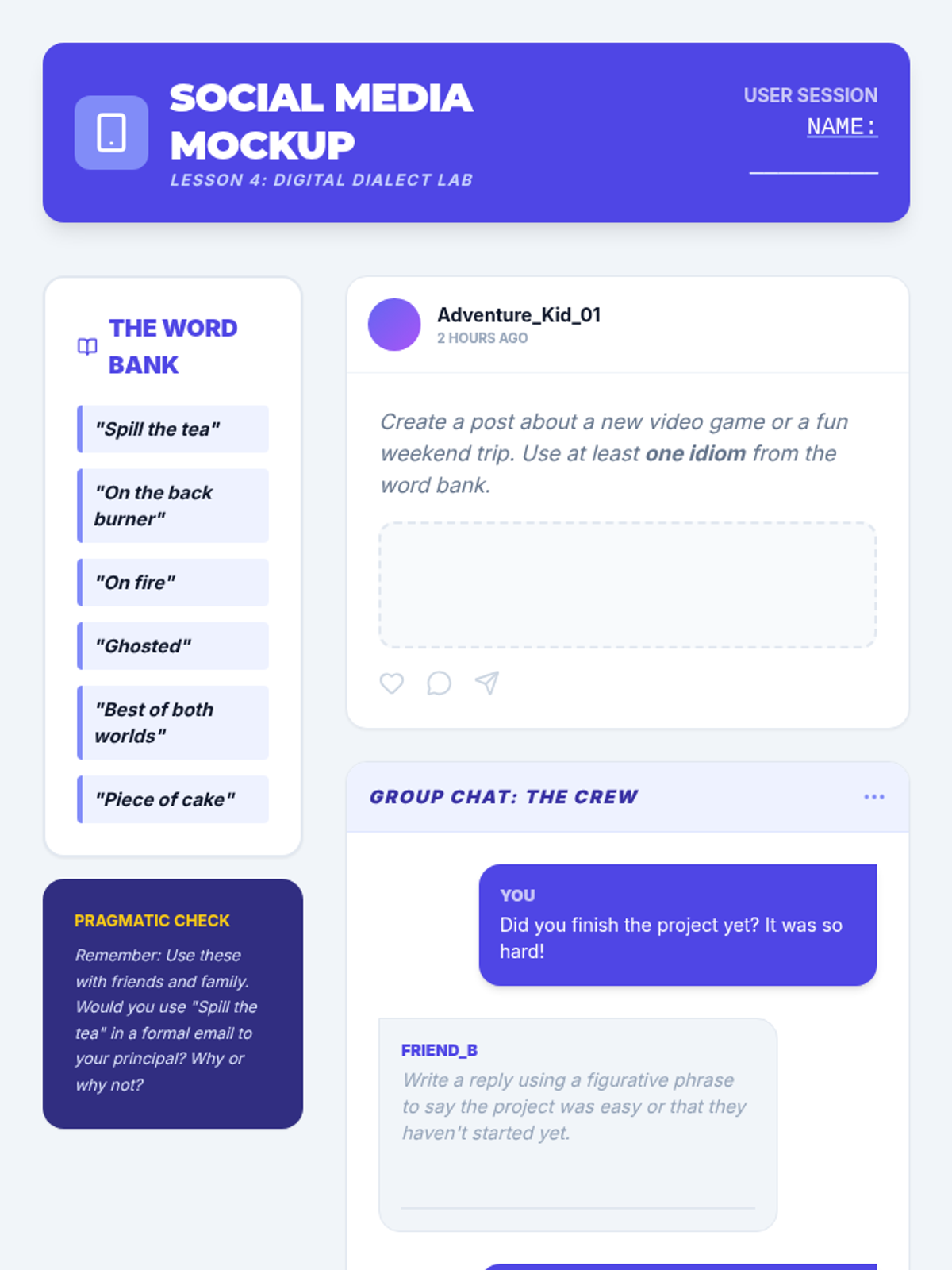 A 5-lesson unit focused on transition from receptive to expressive use of figurative language. Students learn to transform literal sentences, express emotions through idioms, refine dialogue, navigate digital communication, and perform original narratives.