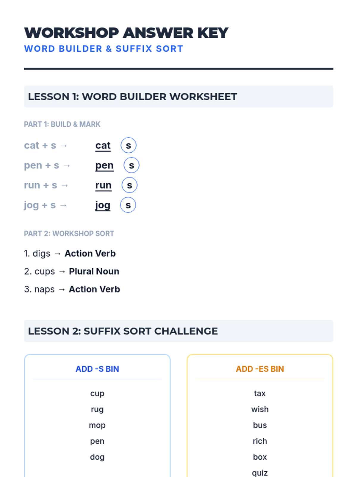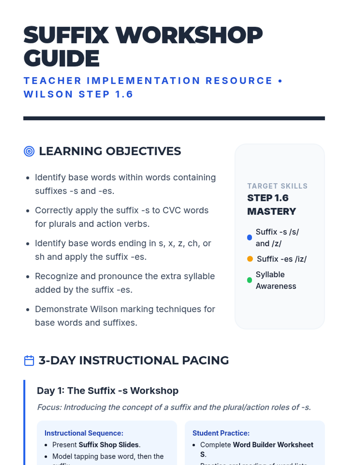 A comprehensive 3-day instructional sequence for Wilson Reading System Step 1.6, focusing on CVC words with suffixes -s and -es through visual instruction, hands-on sorting, and reading passages.