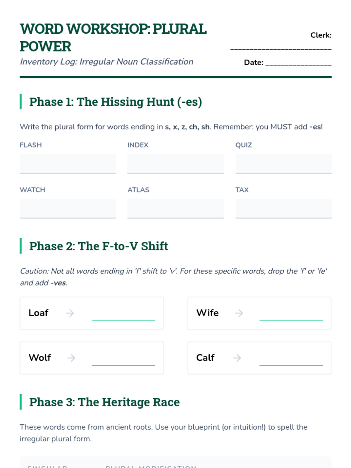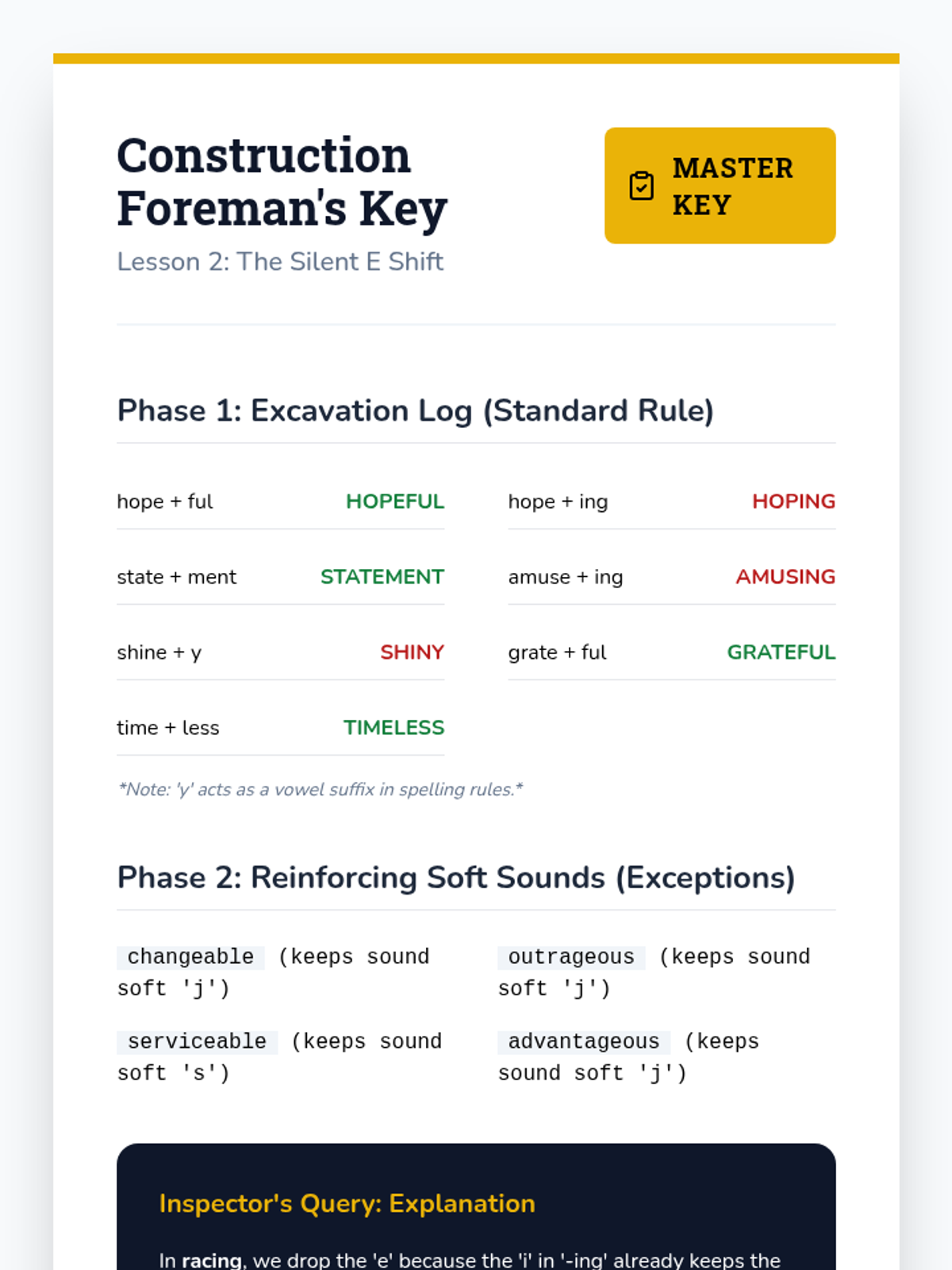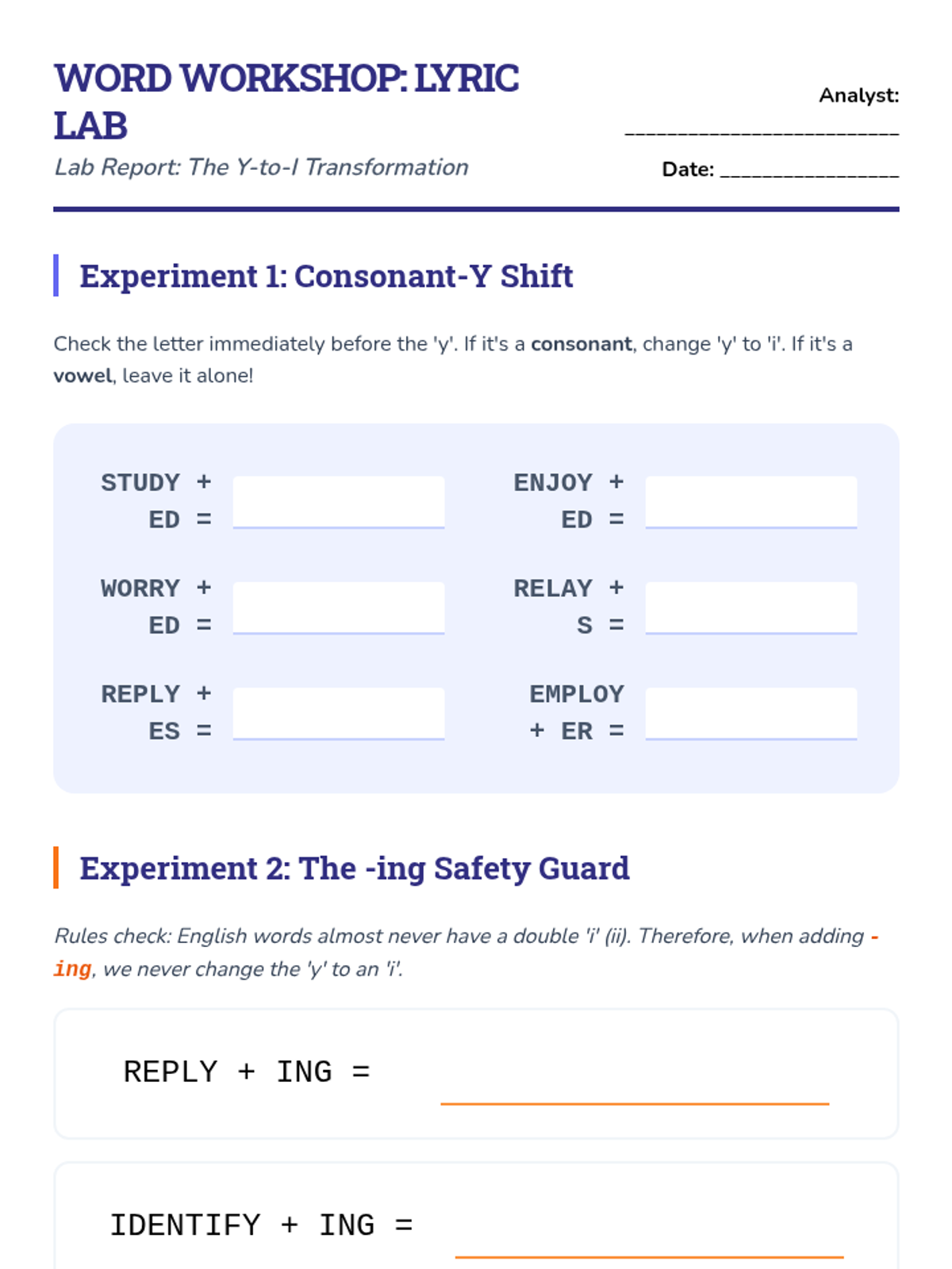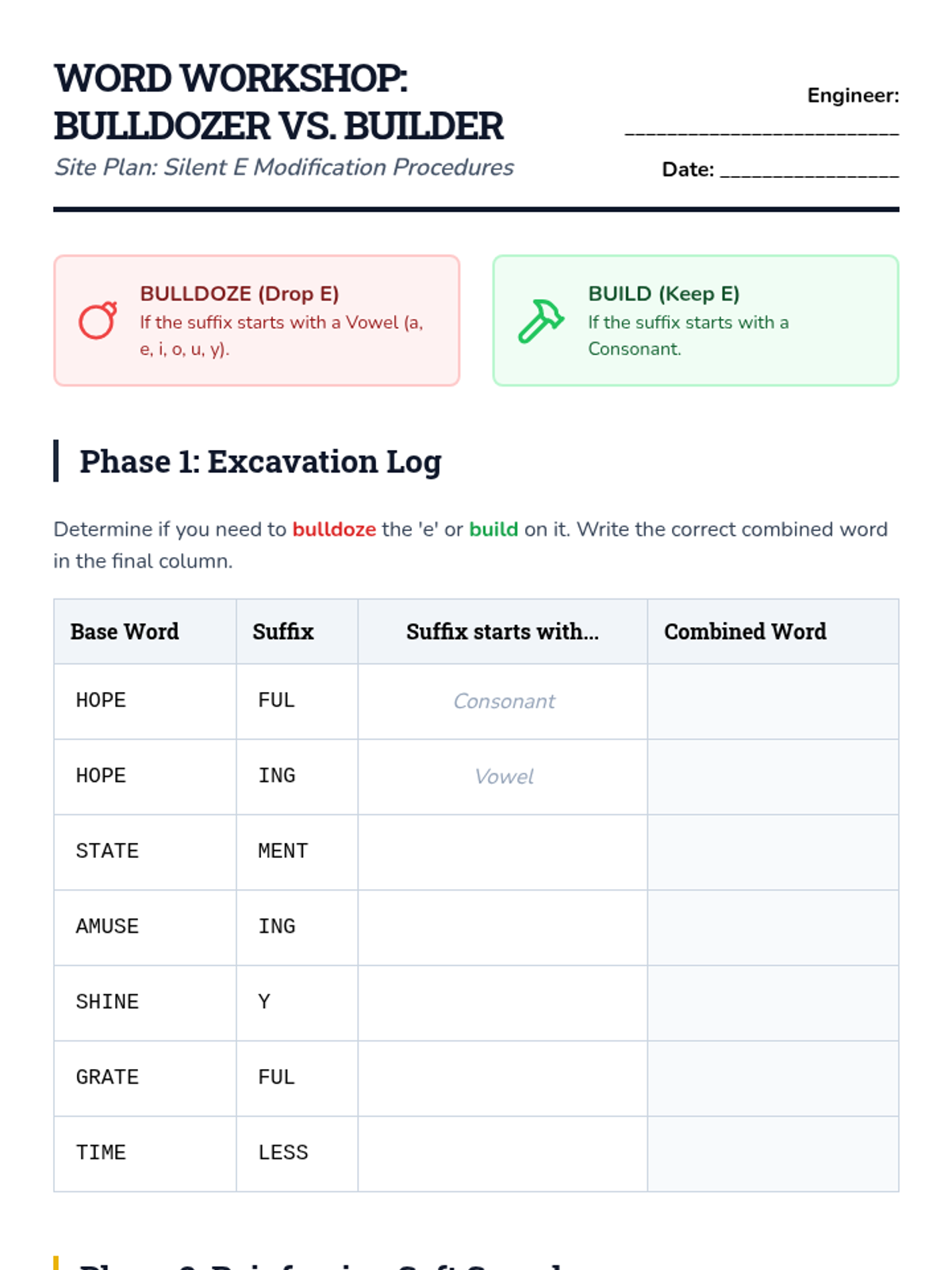 This sequence explores the orthographic transformations of base words when suffixes are added, focusing on the doubling rule, silent E, changing Y to I, and complex plurals. Students move from isolated practice to real-world editing through a workshop-themed approach.