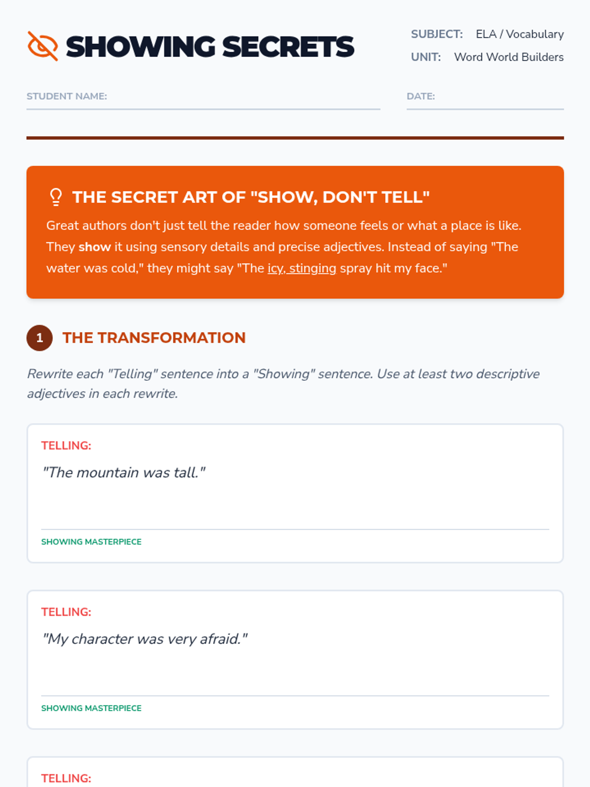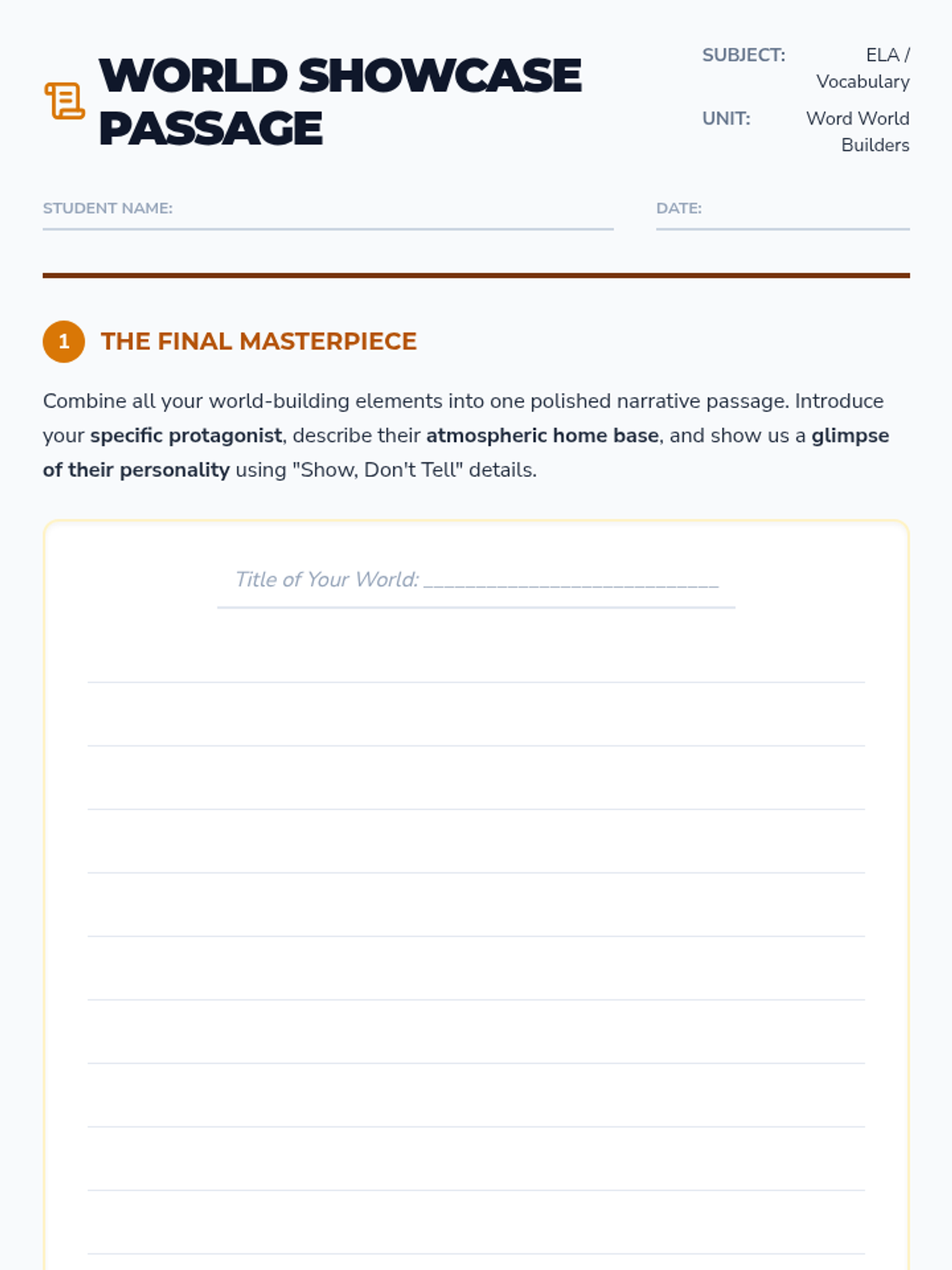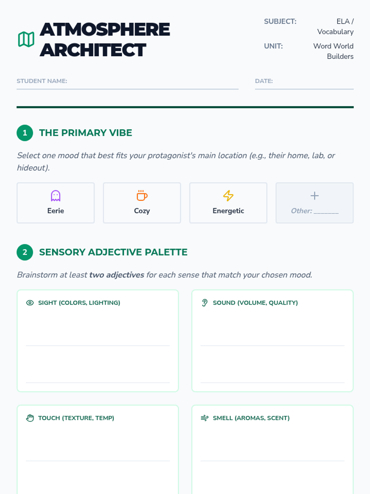 Students embark on a journey of fictional world-building, using precise nouns and vivid adjectives as their primary tools. They move from character identity to atmospheric settings, eventually crafting a polished narrative passage that demonstrates the power of descriptive imagery.