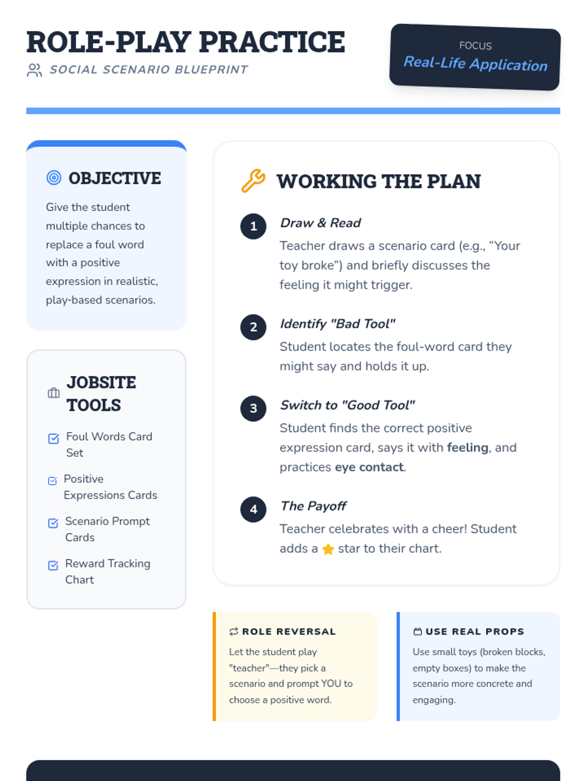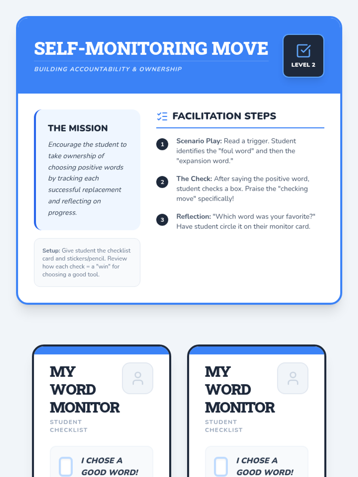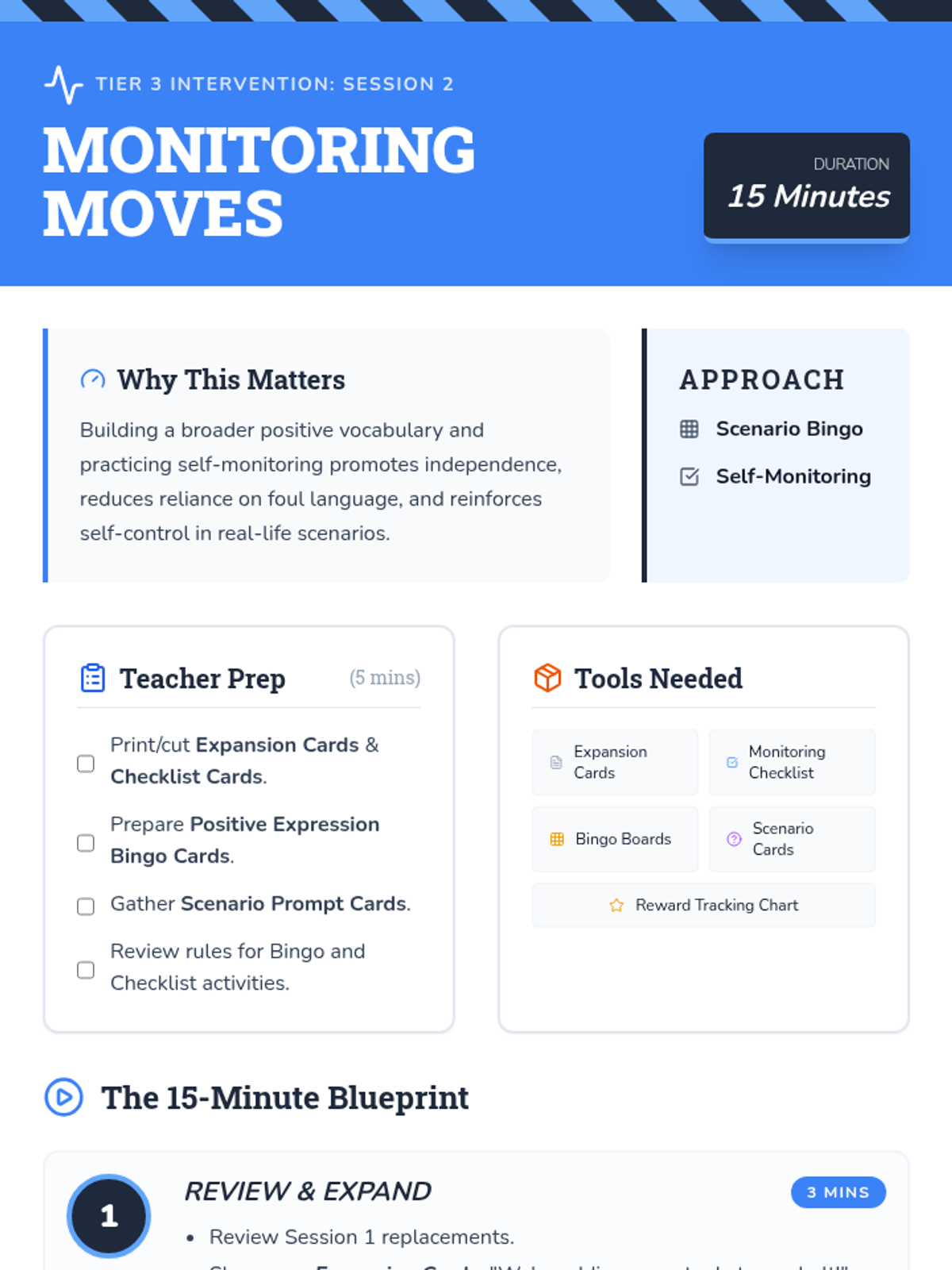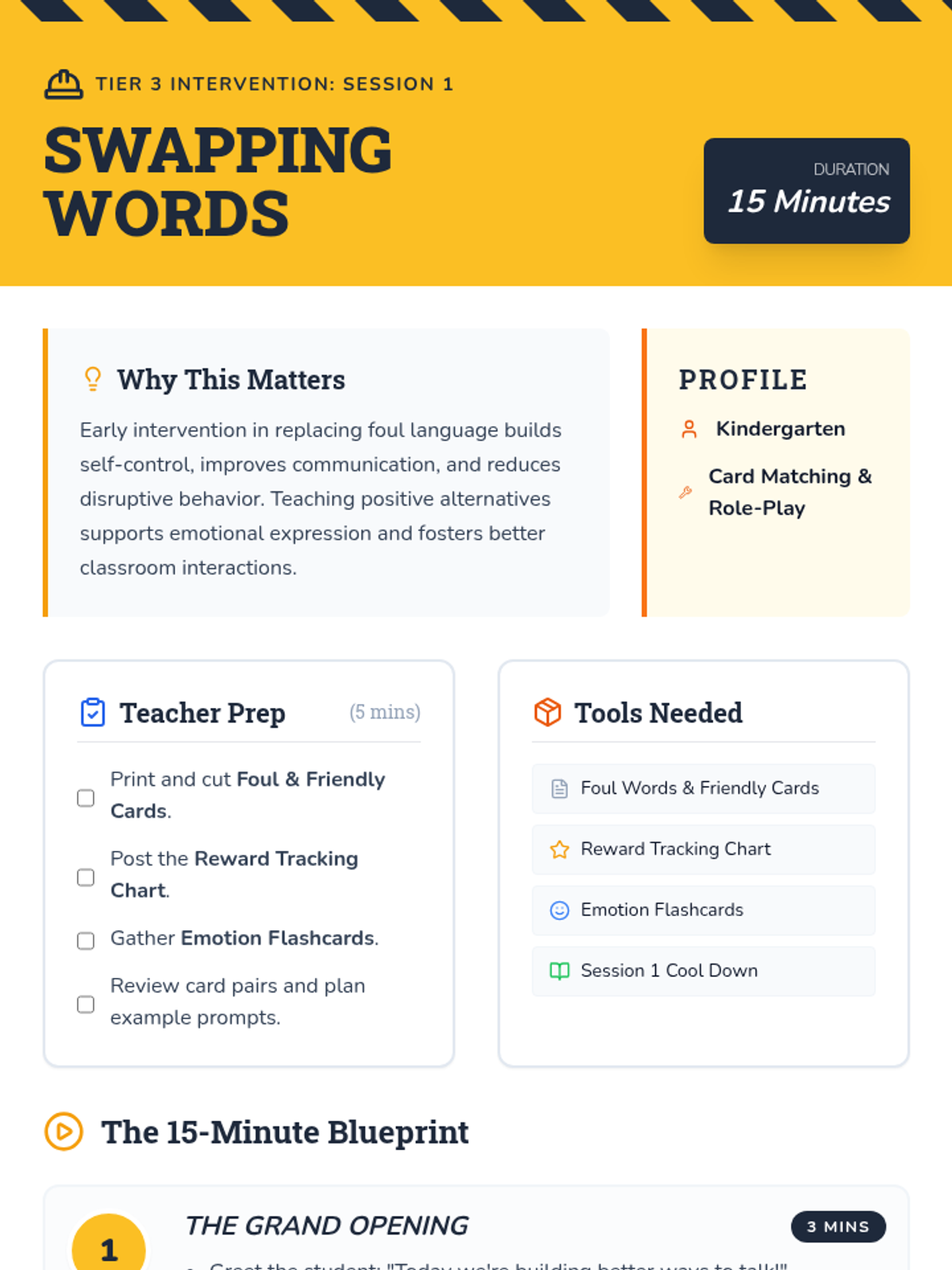 A three-session Tier 3 intervention for kindergarten students focusing on replacing foul language with positive expressions through games, role-play, and self-monitoring.