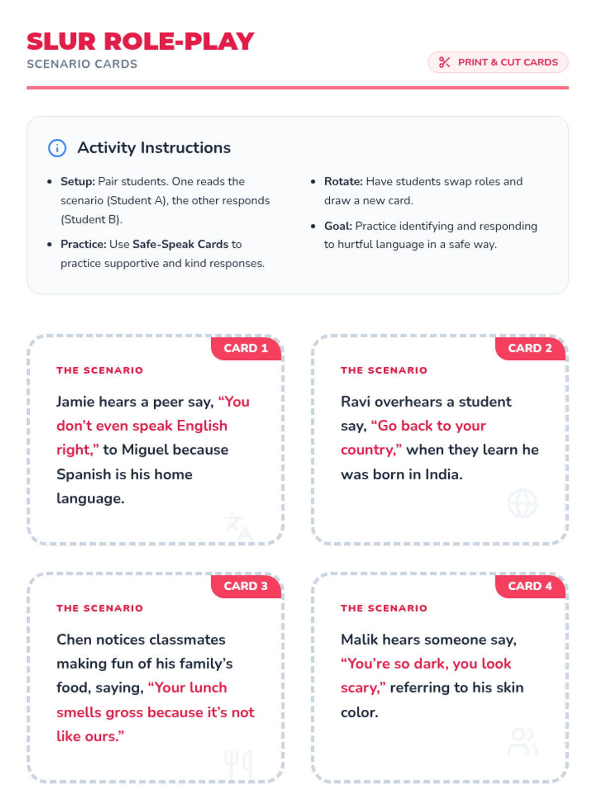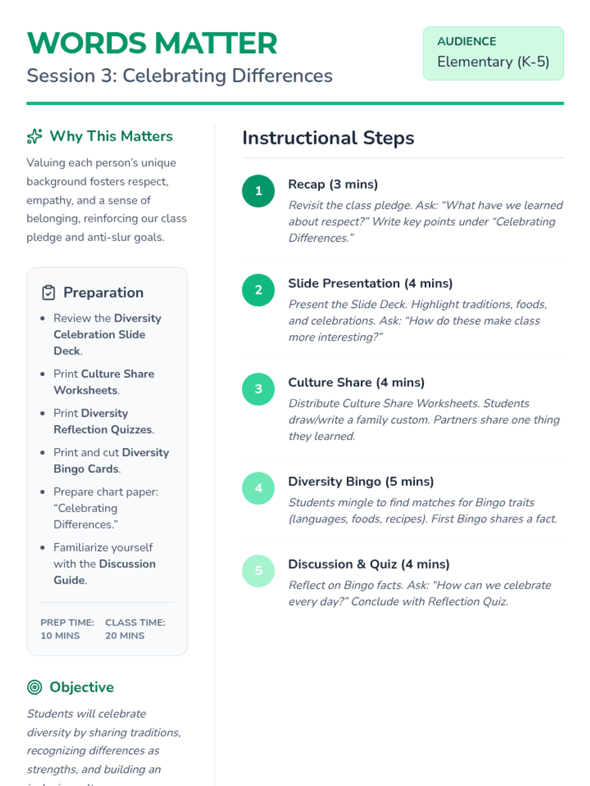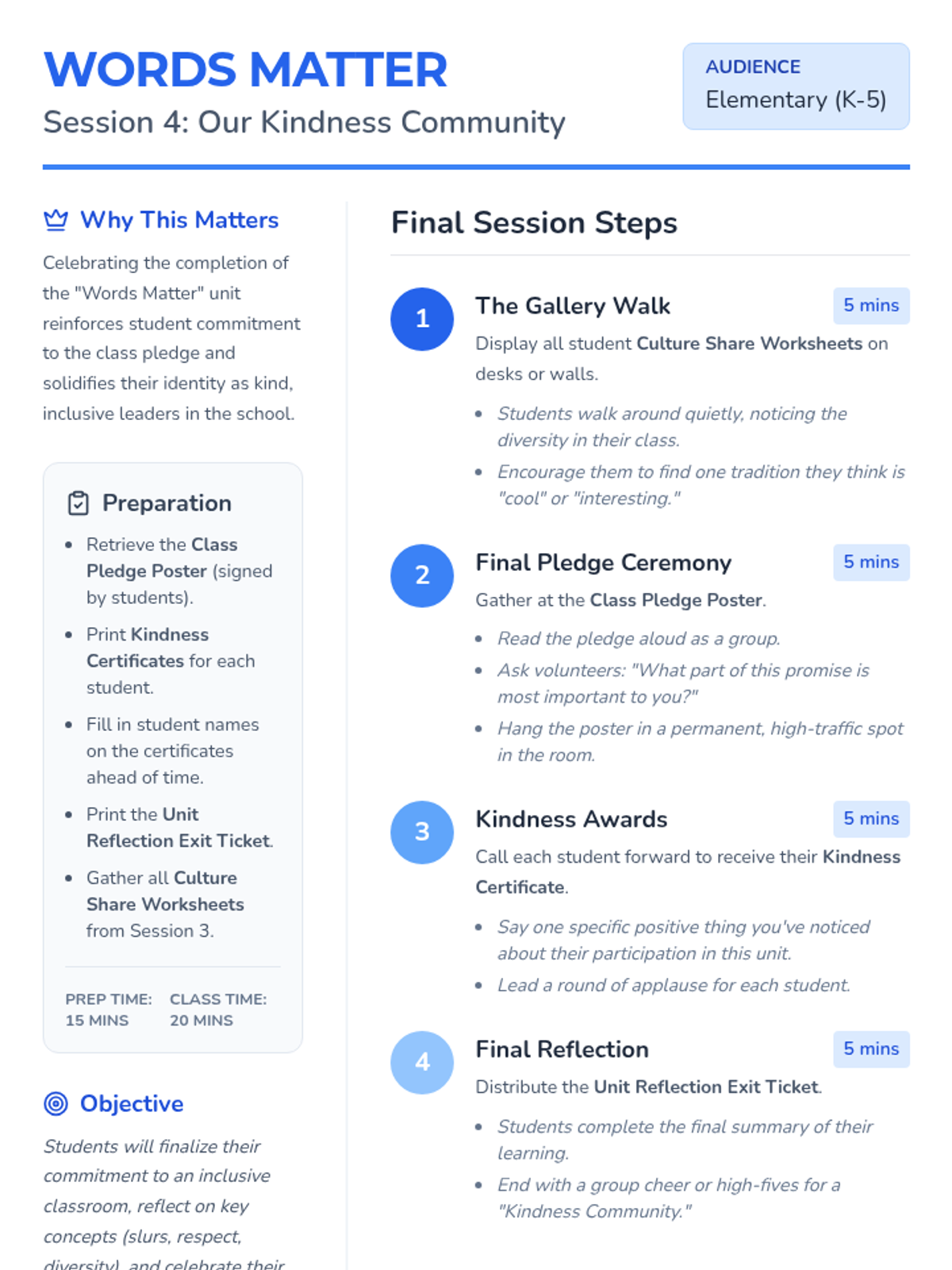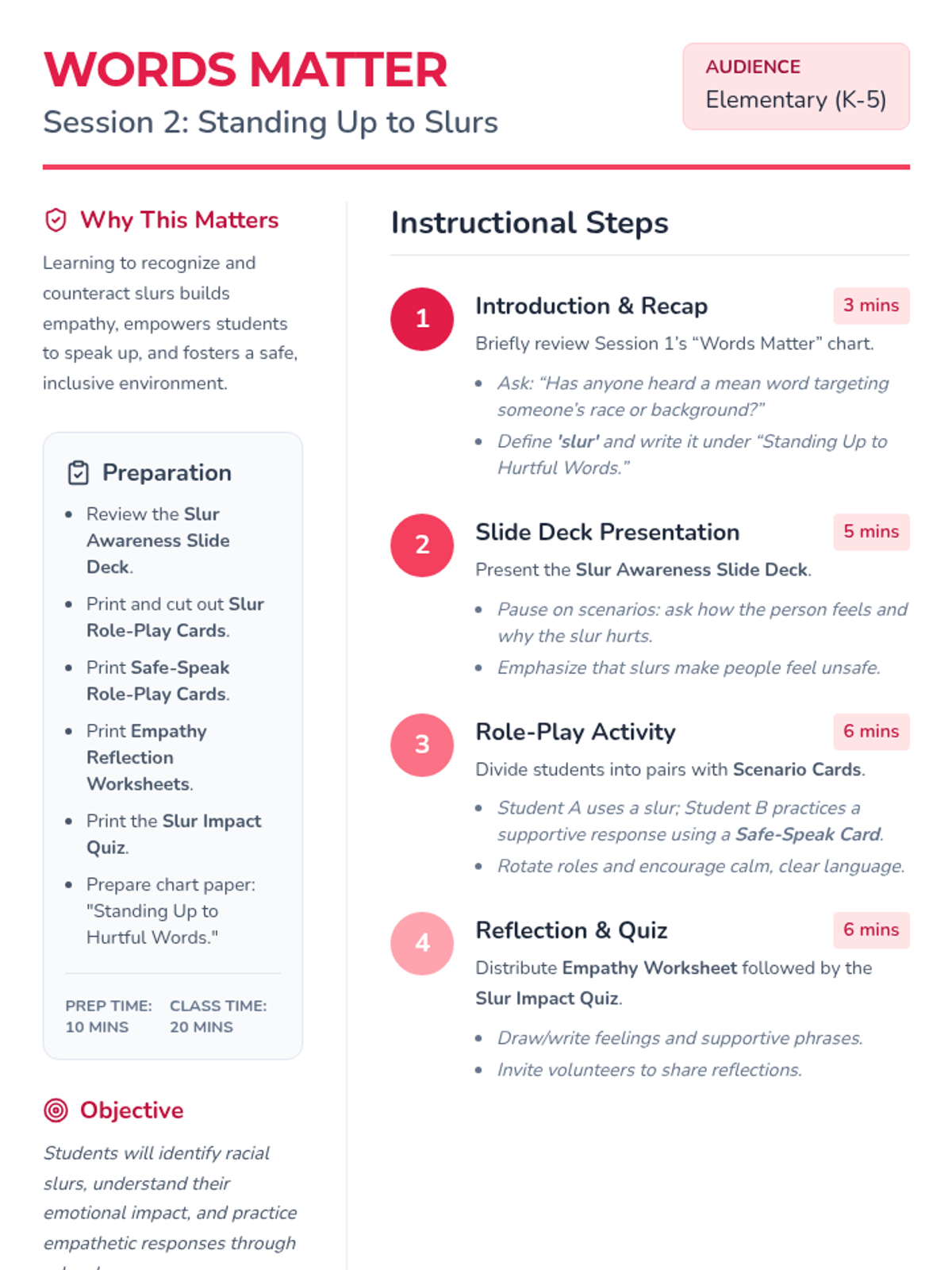 A 4-session Tier 1 sequence for K-5 students focused on racial slur prevention, respectful language, and celebrating diversity. Students learn empathy through role-play, sharing traditions, and creating a collective class pledge.