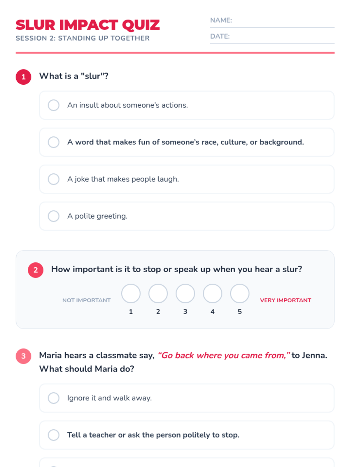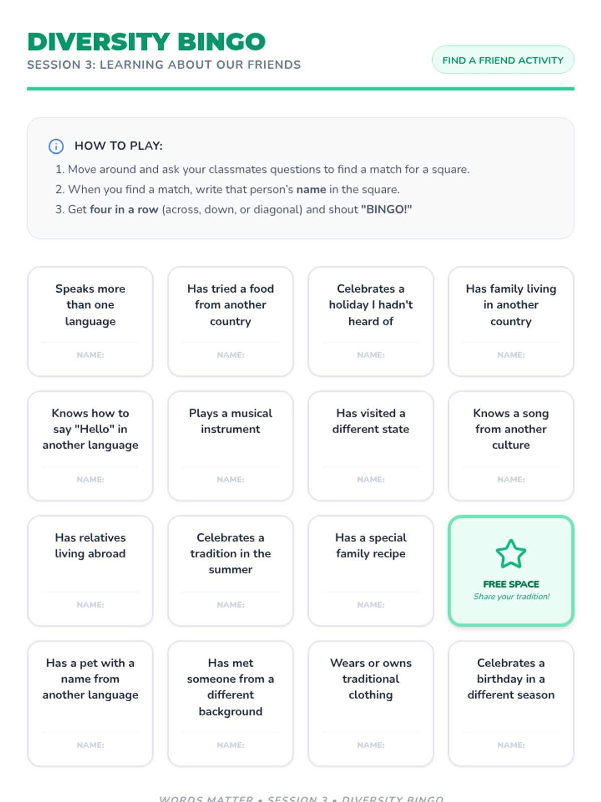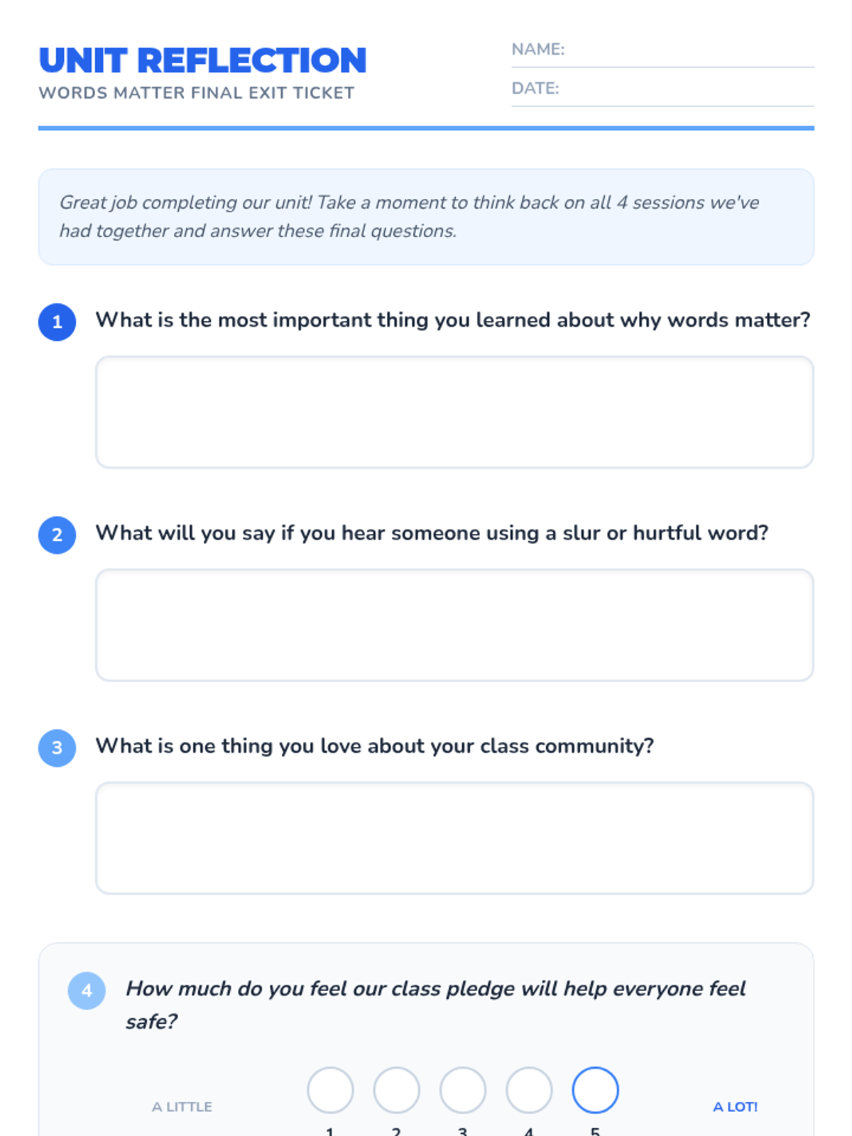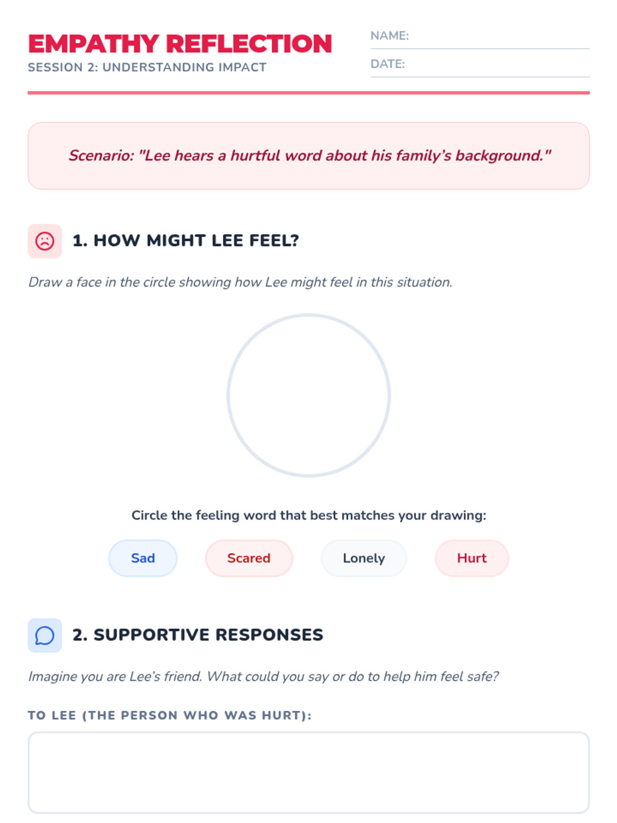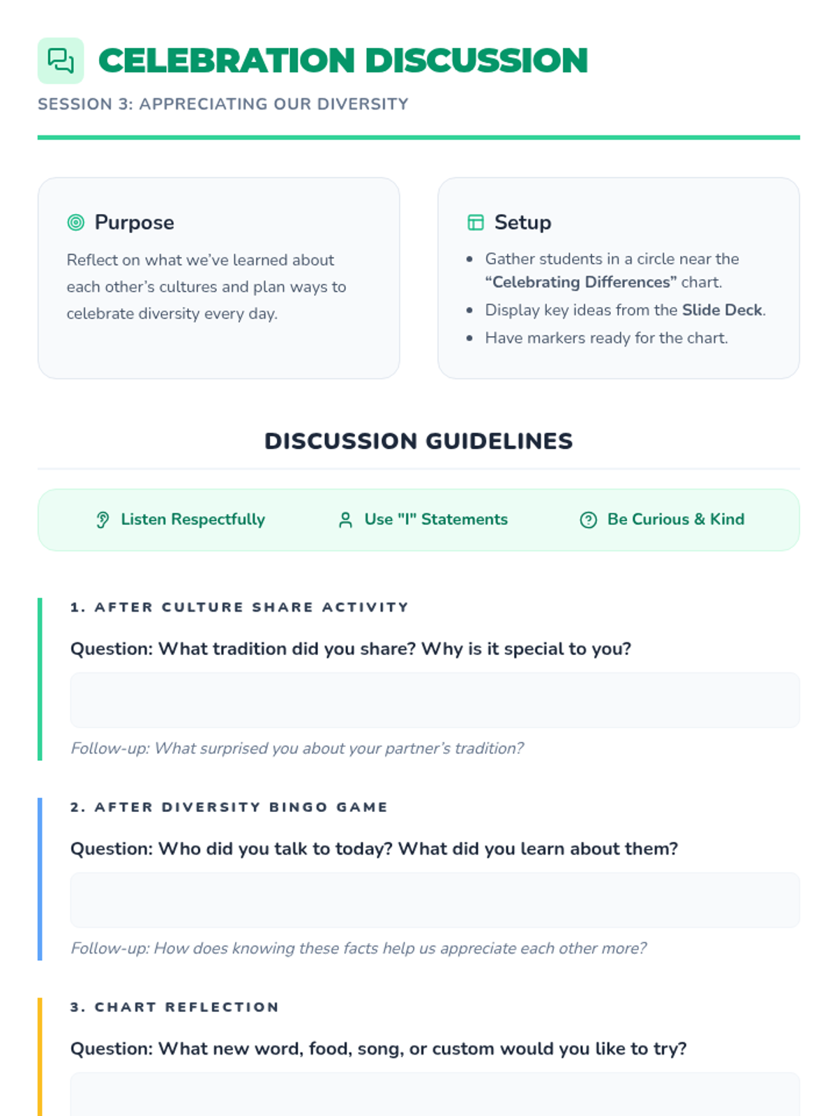A 4-session Tier 1 sequence for K-5 students focused on racial slur prevention, respectful language, and celebrating diversity. Students learn empathy through role-play, sharing traditions, and creating a collective class pledge.