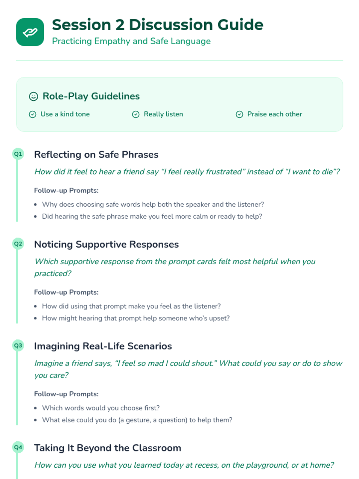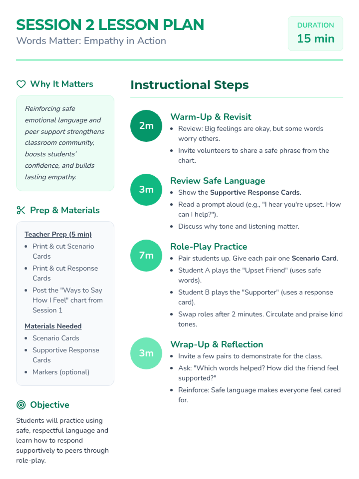 A 2-session Tier 1 classroom lesson sequence for second graders focused on emotional literacy. Students learn why certain phrases can be alarming and practice using safe, respectful language to express big feelings and support their peers.