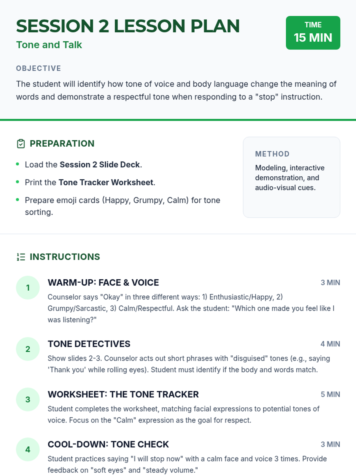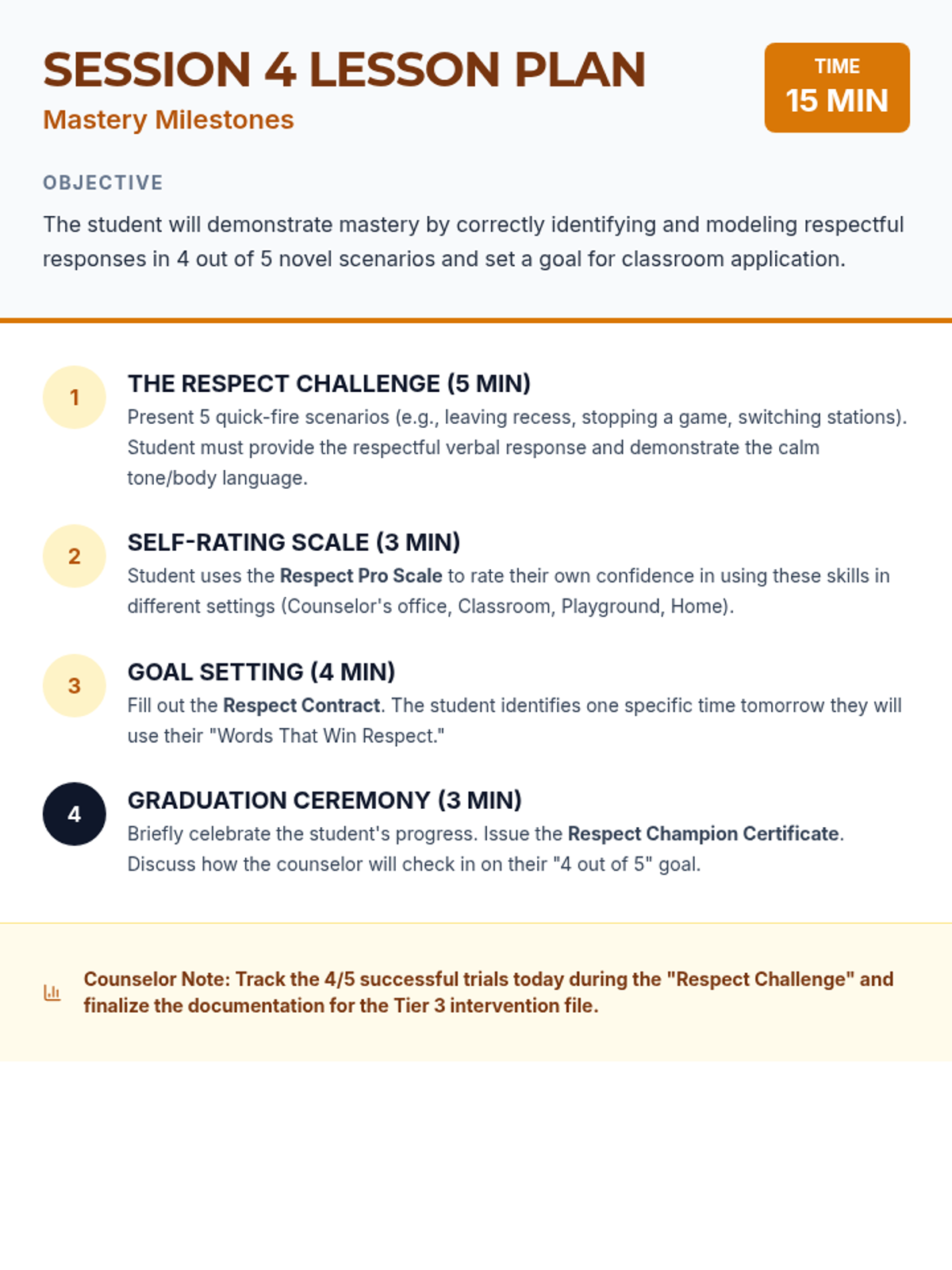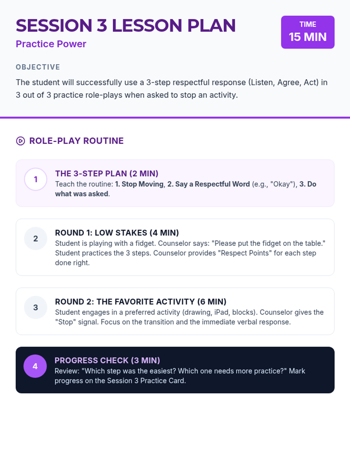 A 4-session Tier 3 intervention mini-course designed for individual counseling to help students learn and practice respectful language when asked to stop an activity. The course moves from identifying respectful words to mastering the use of respectful phrases in real-world scenarios.