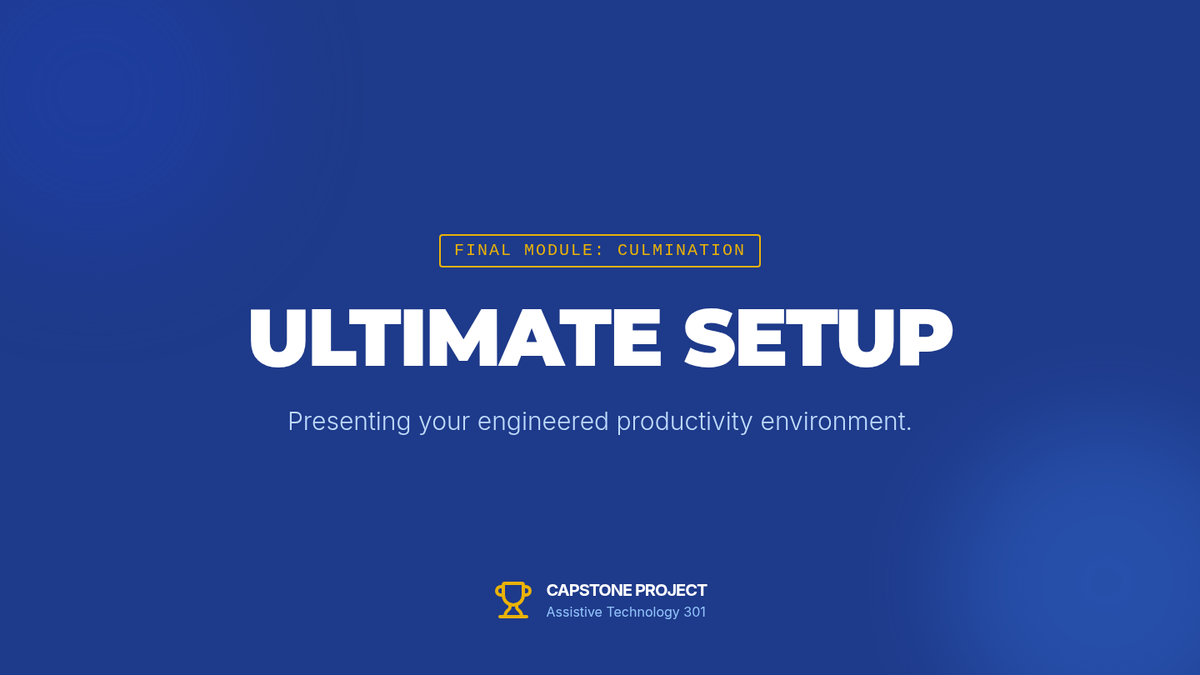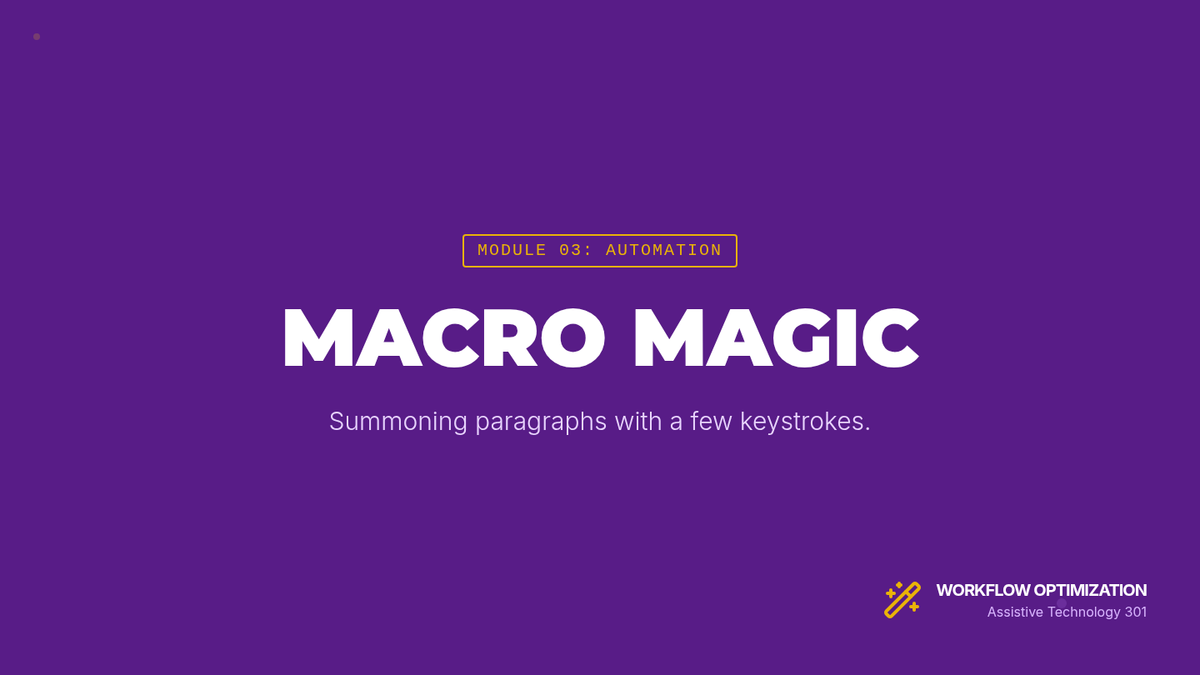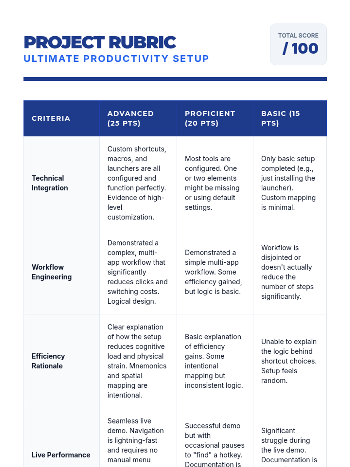 A 5-lesson project-based sequence for undergraduate students focused on assistive technology and workflow optimization. Students move from basic application launchers to creating custom macros and multi-app workflows, culminating in a personalized productivity setup project.