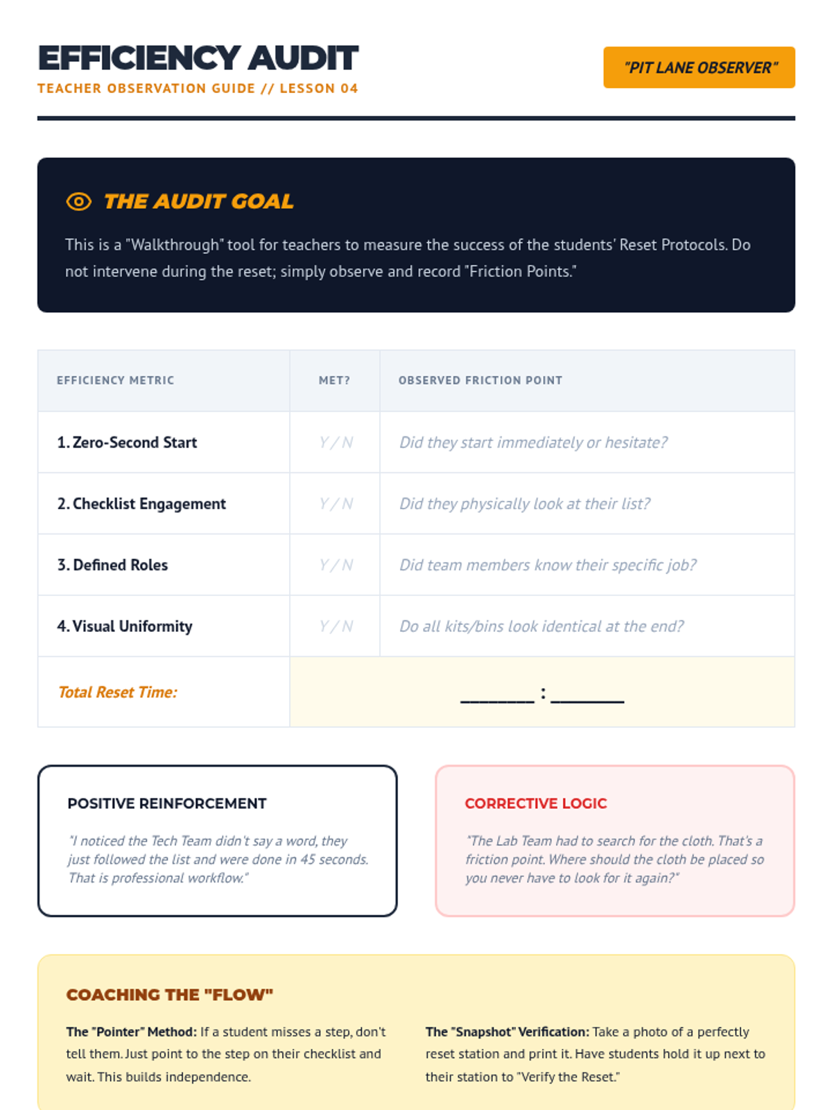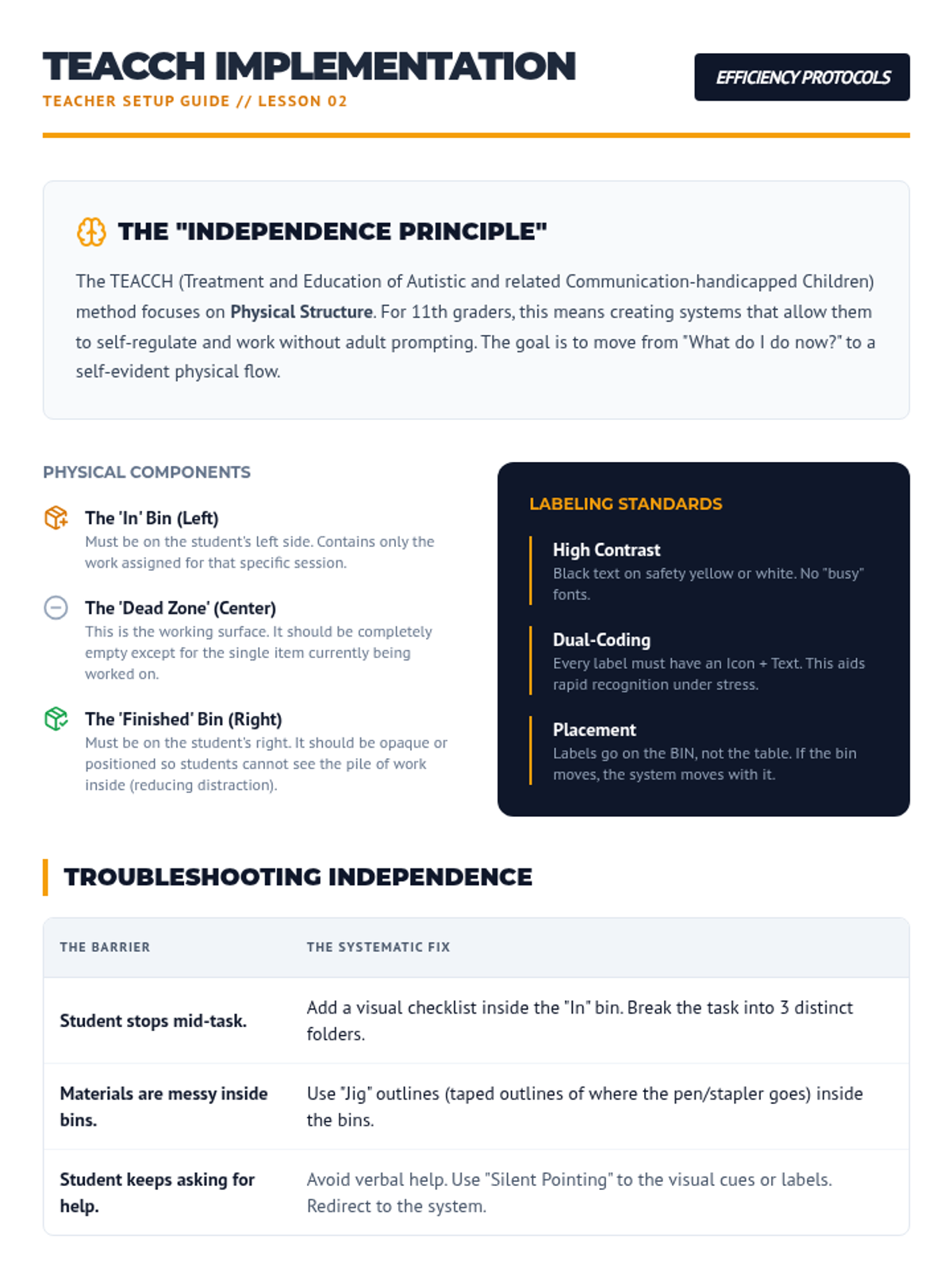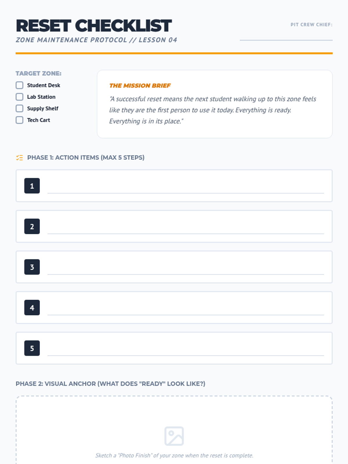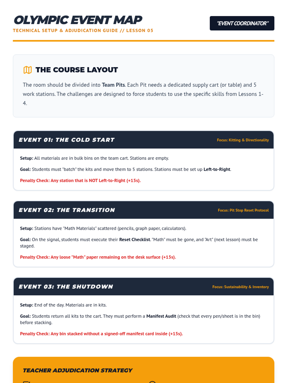 A game-based sequence designed for 11th-grade students to master physical organization. Through time-motion studies, 'pit crew' simulations, and TEACCH-inspired workflow systems, students learn to minimize 'lost learning time' and maximize efficiency in educational environments.