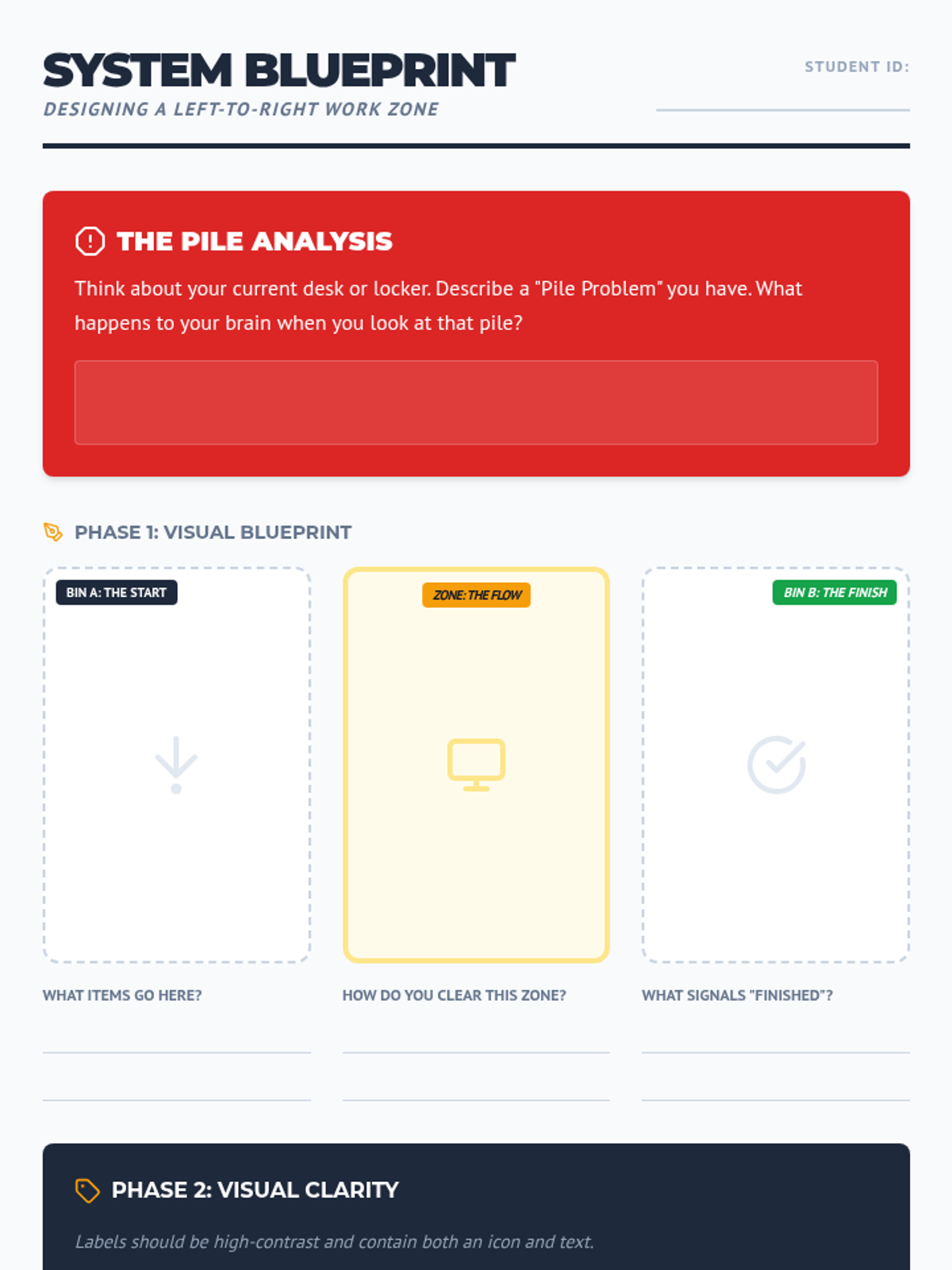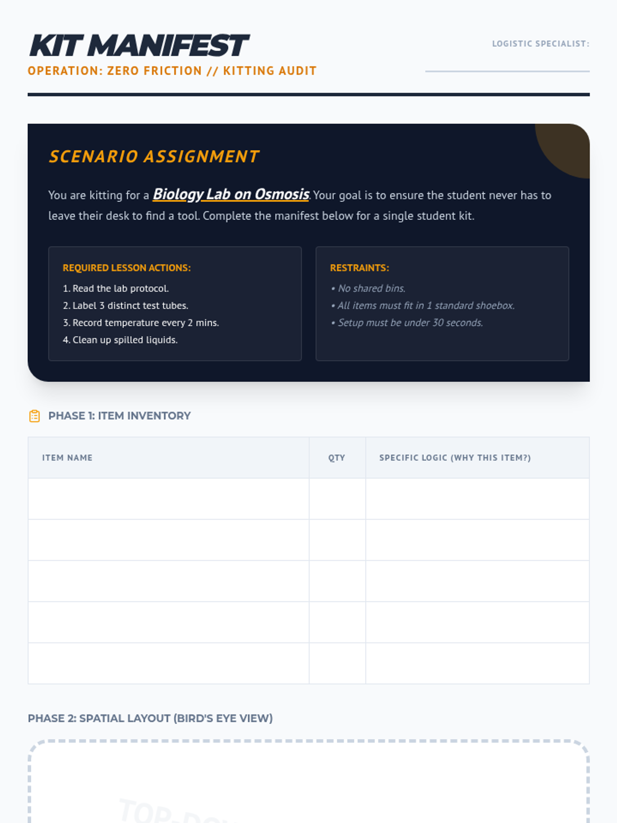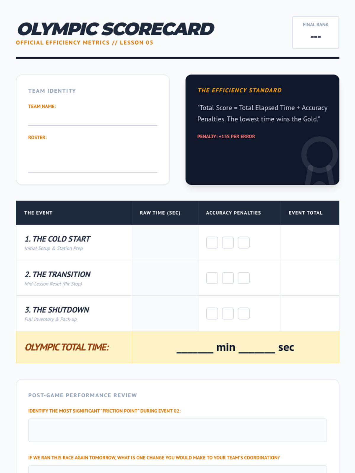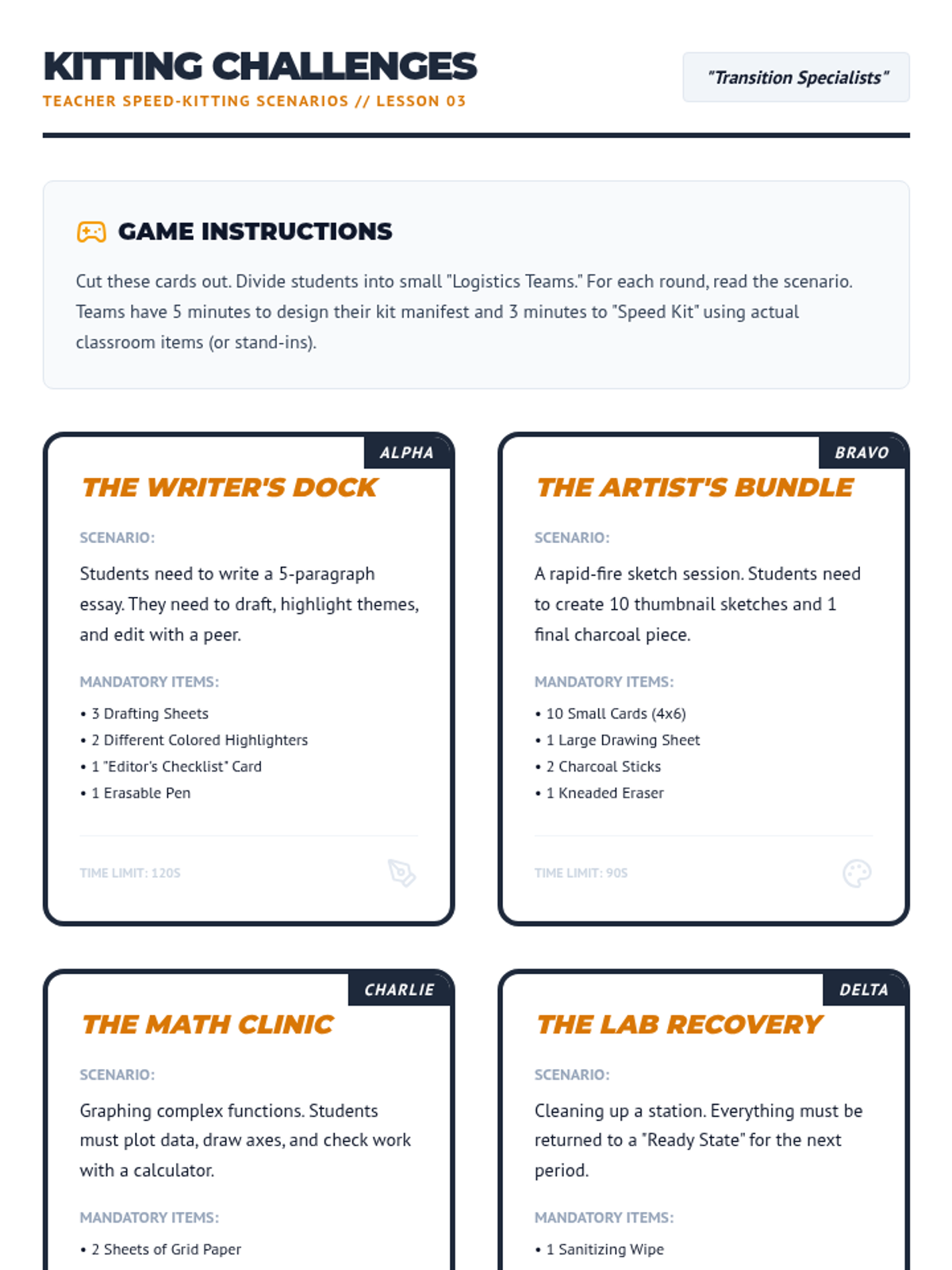 A game-based sequence designed for 11th-grade students to master physical organization. Through time-motion studies, 'pit crew' simulations, and TEACCH-inspired workflow systems, students learn to minimize 'lost learning time' and maximize efficiency in educational environments.