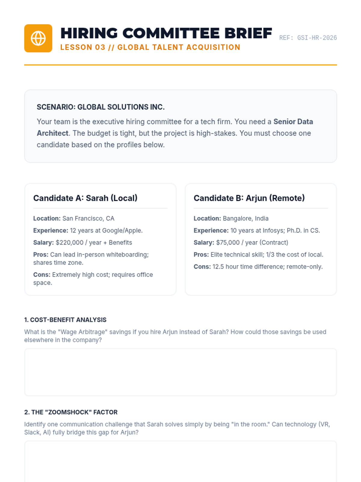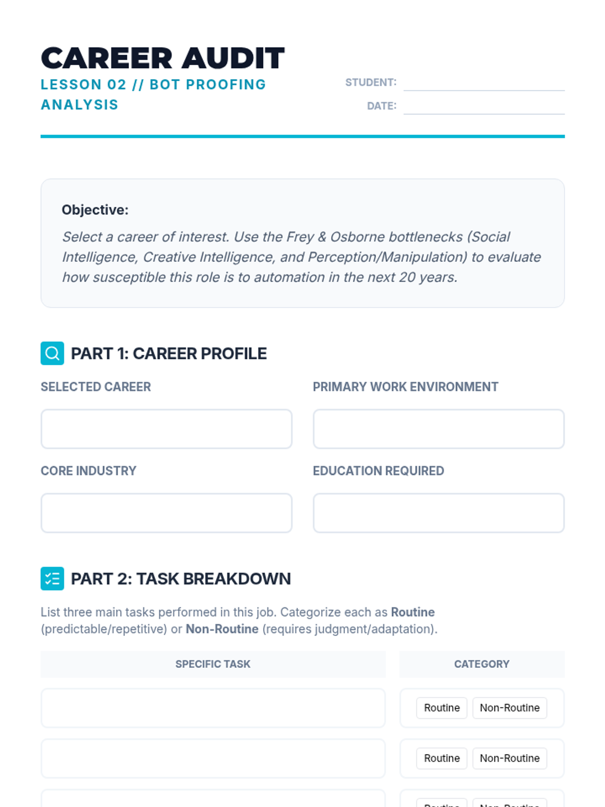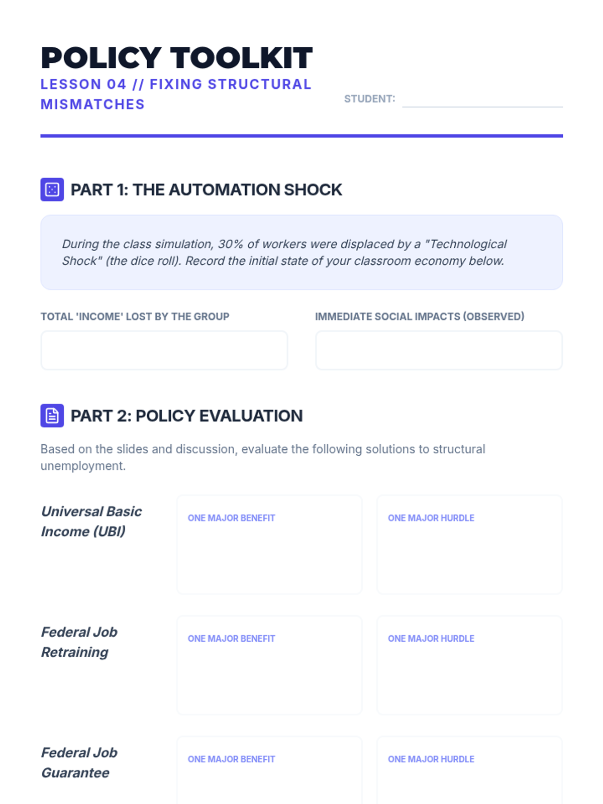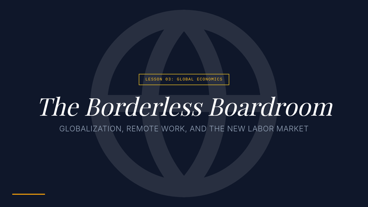 This sequence explores the macroeconomic impact of automation, artificial intelligence, and globalization on the future labor market. Students analyze historical shifts, evaluate automation risks, simulate global hiring, and design policy proposals for a post-labor economy.