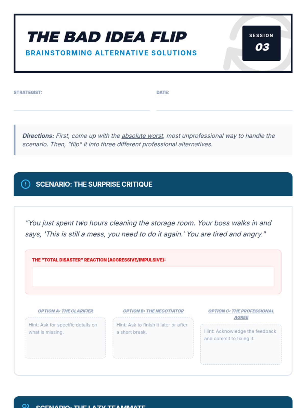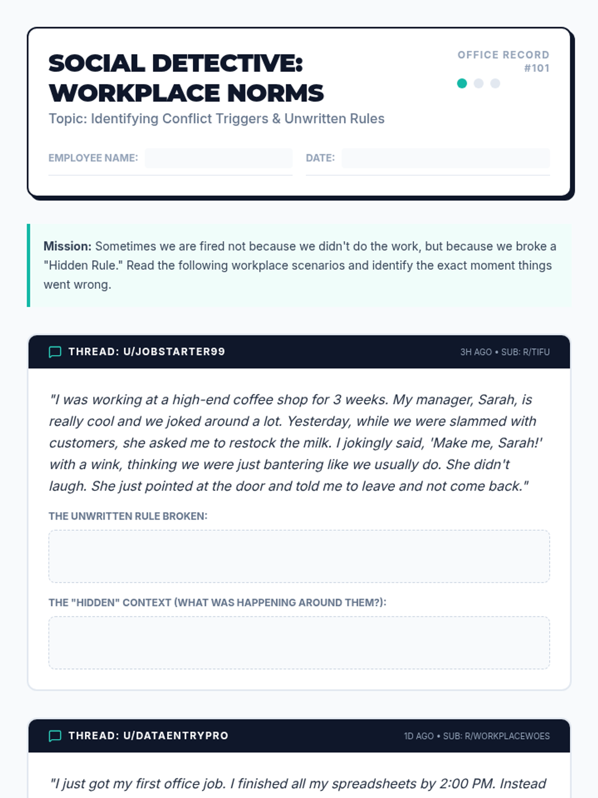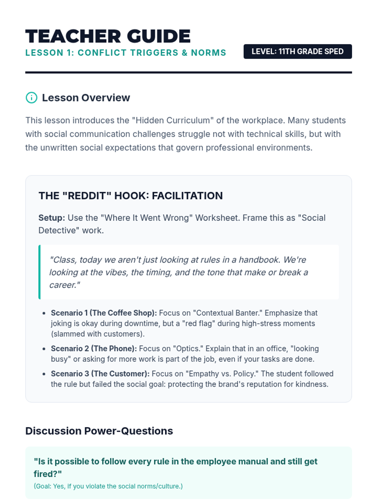 A comprehensive sequence for 11th-grade students in special education focusing on social communication and solution generation within workplace contexts. Students progress from identifying hidden professional norms to simulating complex HR conflict resolutions.