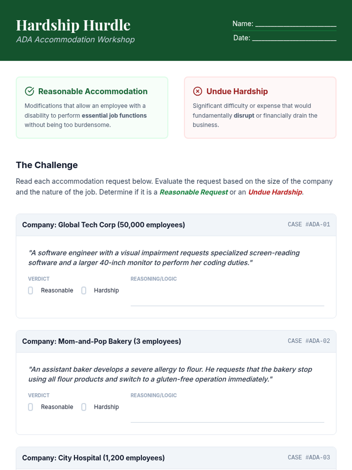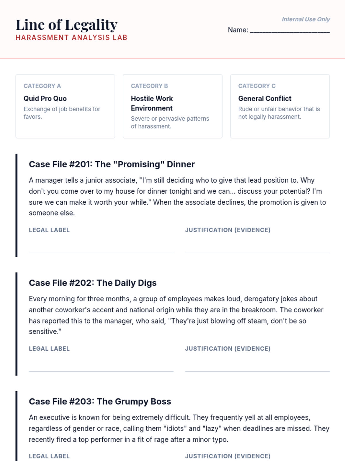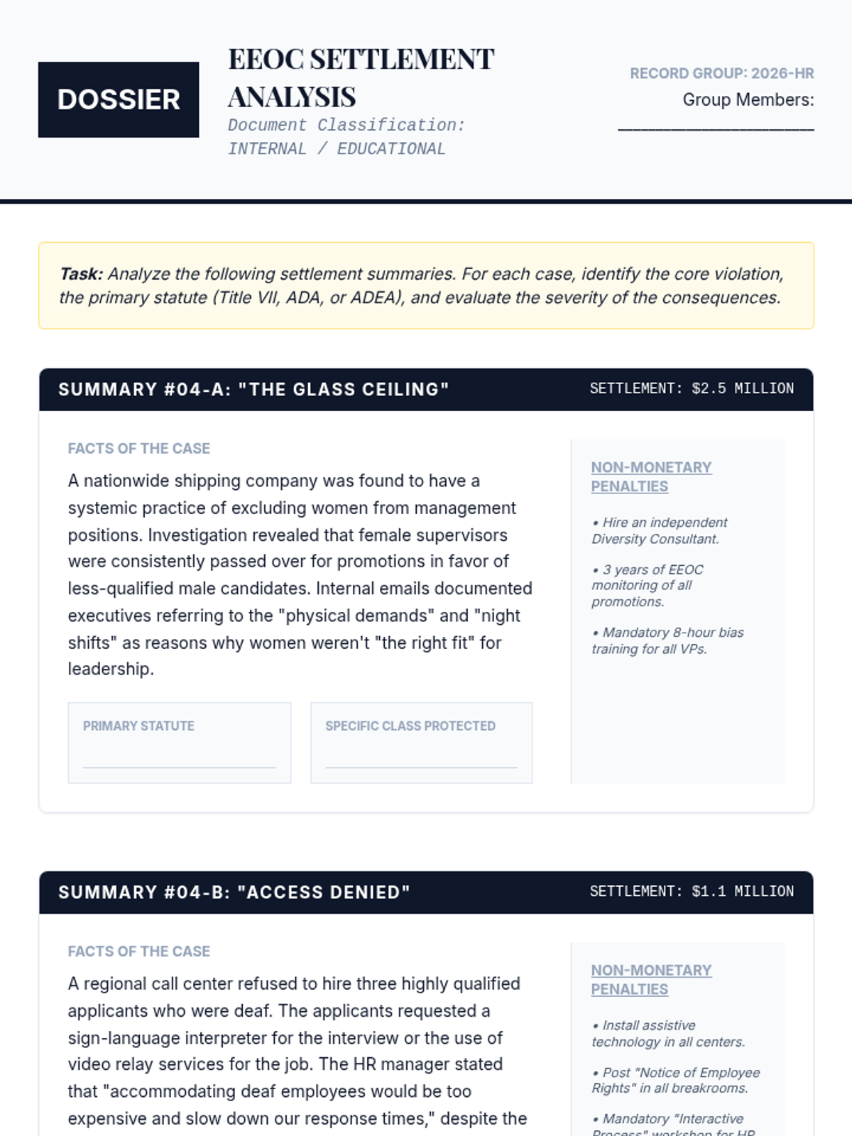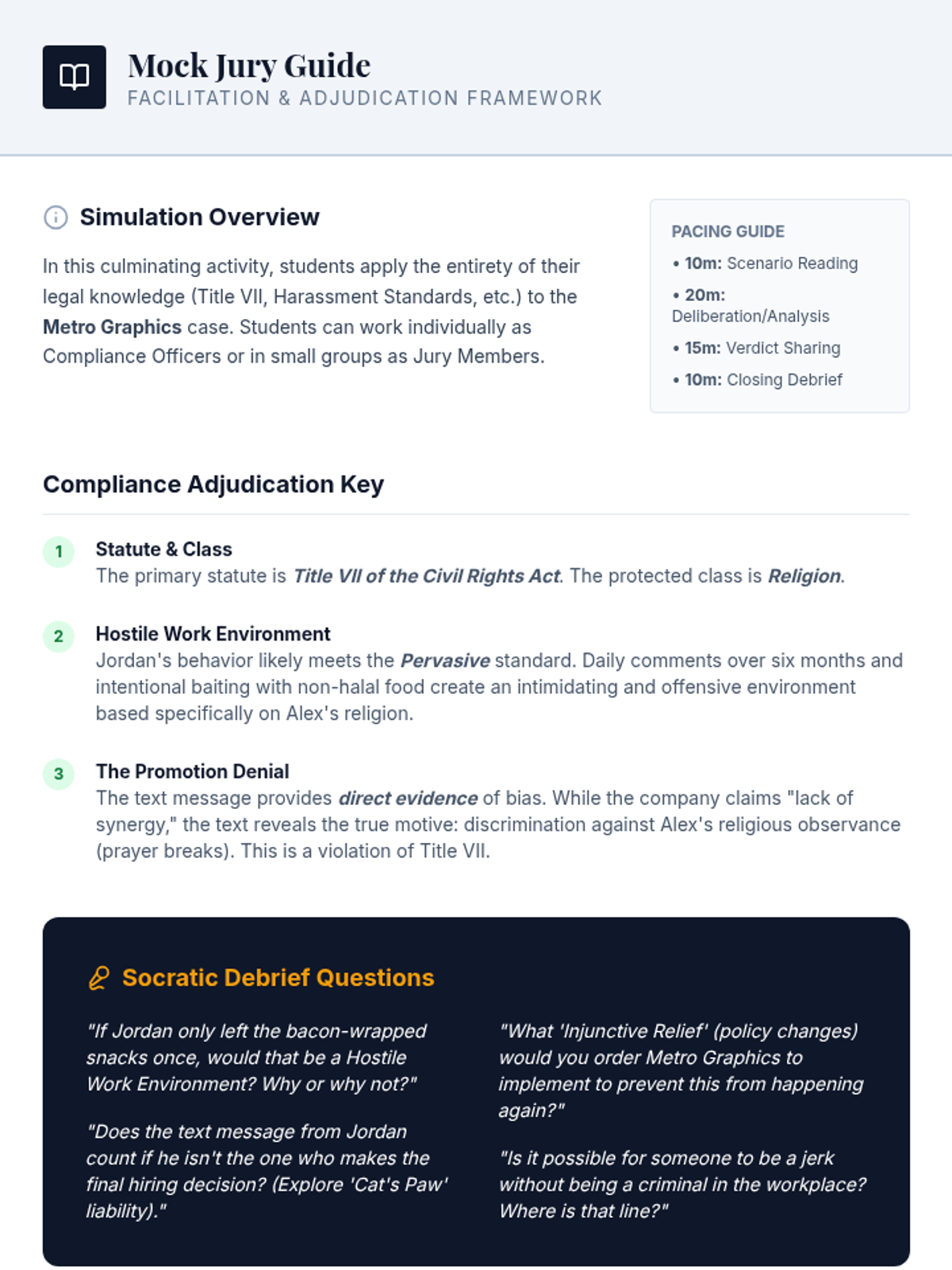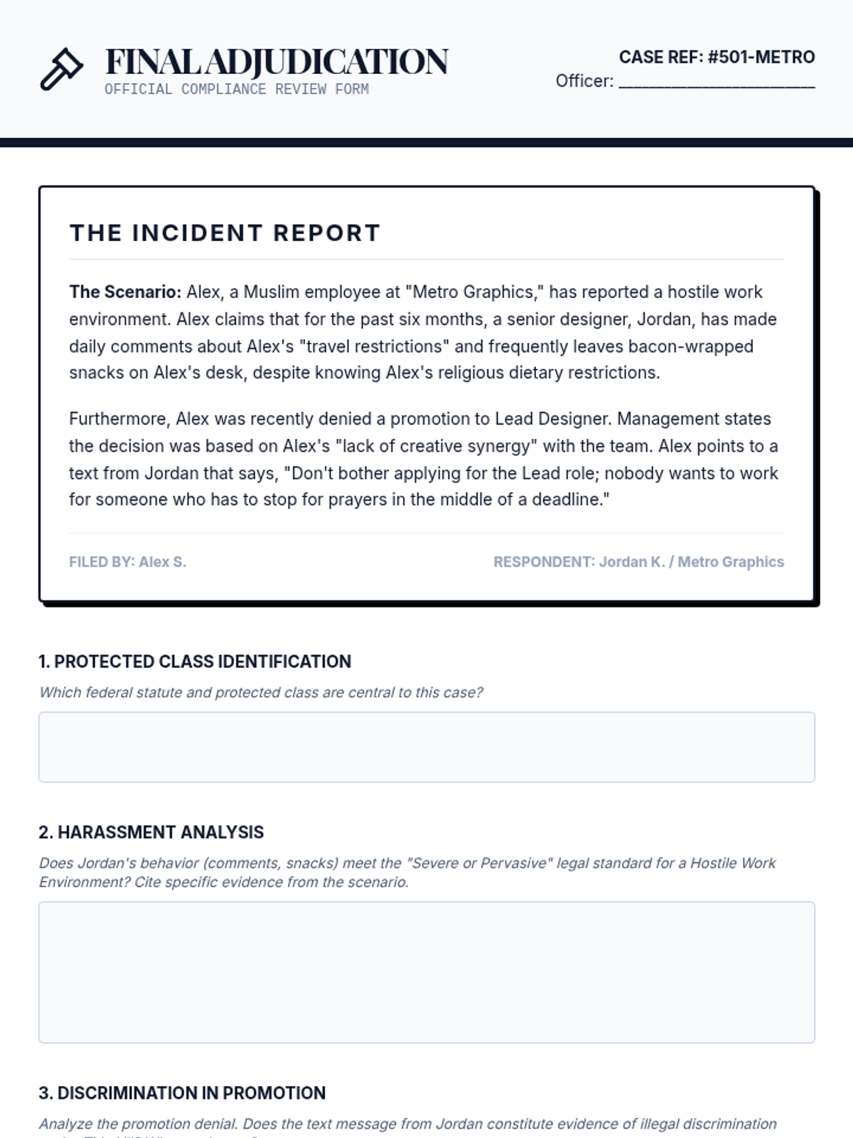 Students explore federal legal frameworks defining workplace discrimination and harassment, moving from identifying protected classes to adjudicating complex cases based on legal standards like 'severe or pervasive' and 'reasonable accommodation'.