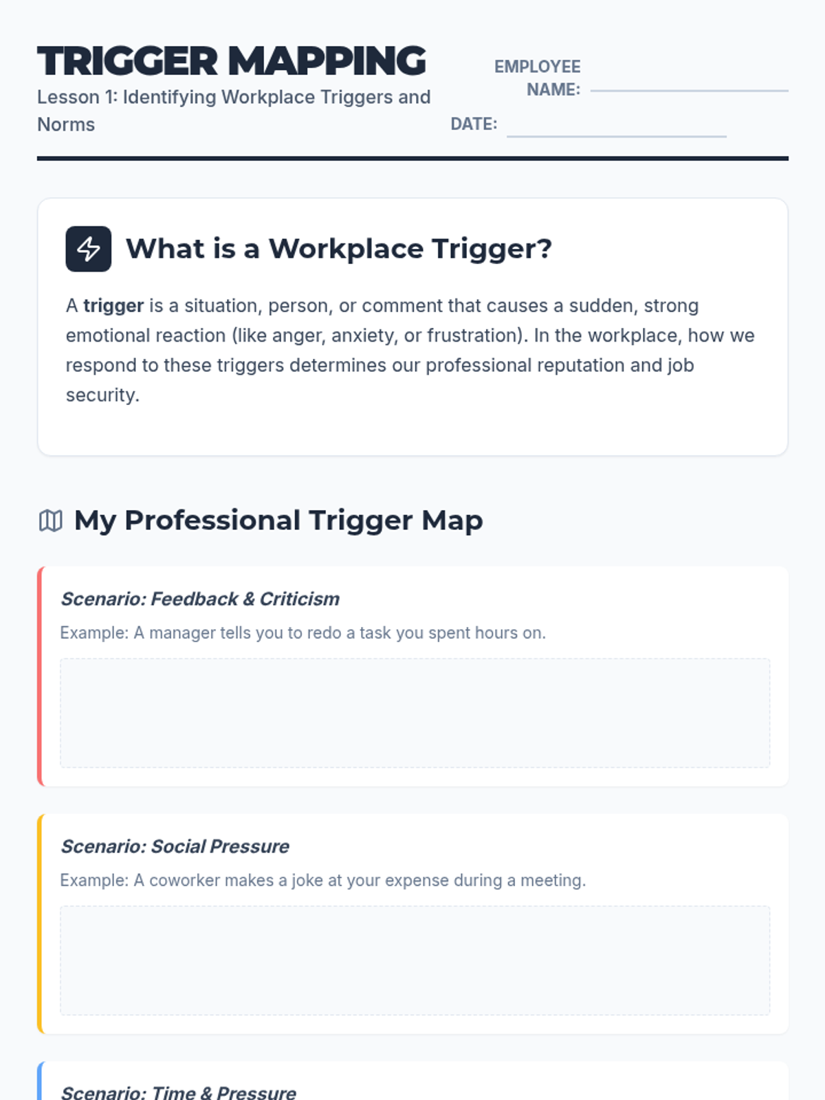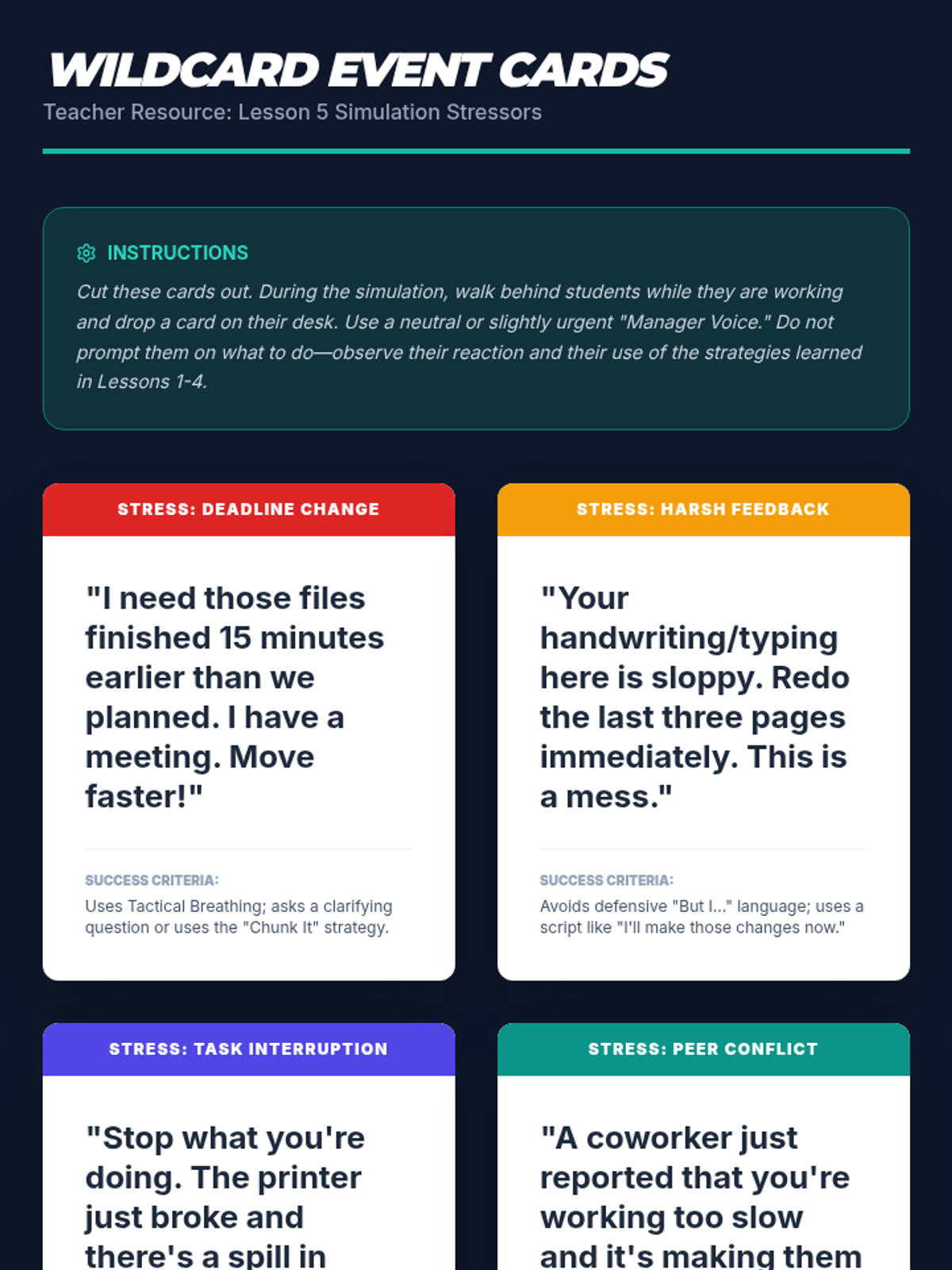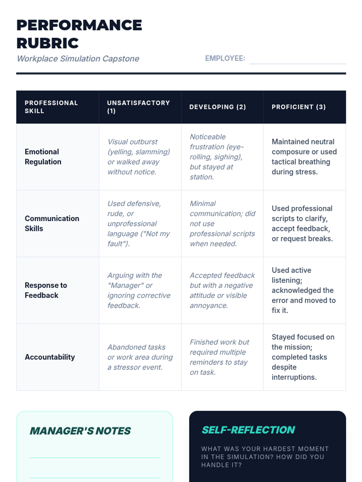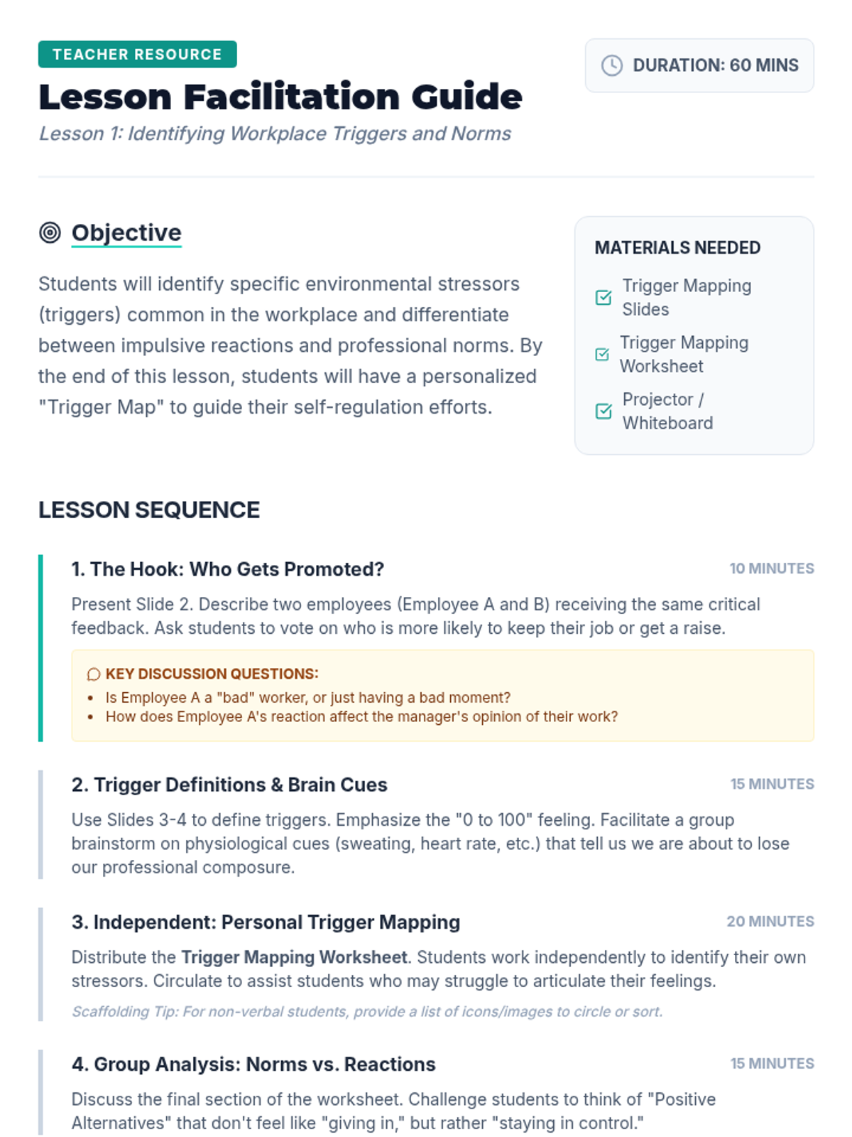 This sequence prepares 12th-grade students for the behavioral demands of the workforce by analyzing stressors, practicing emotional regulation, and replacing impulsive behaviors with professional communication. Students move from self-awareness of triggers to mastery-based simulations of high-pressure work environments.