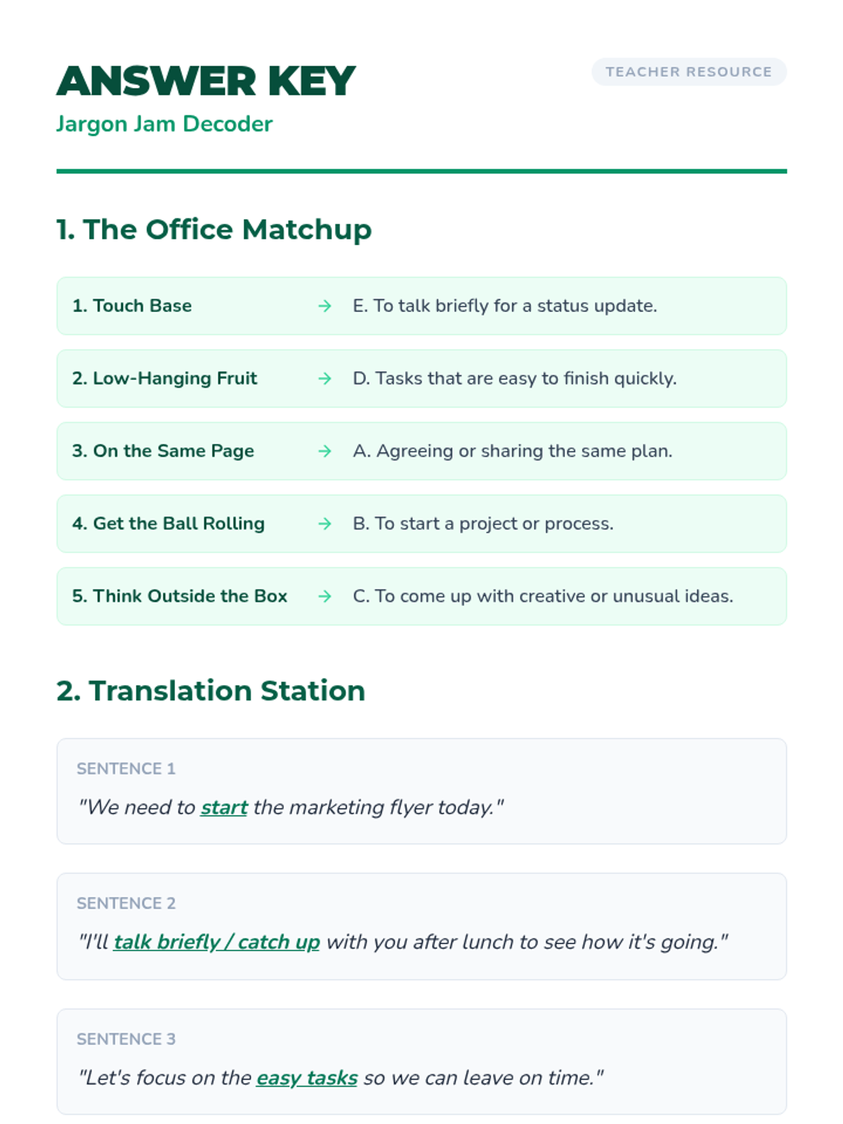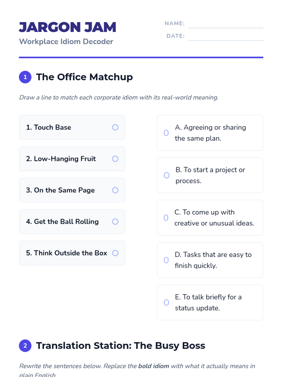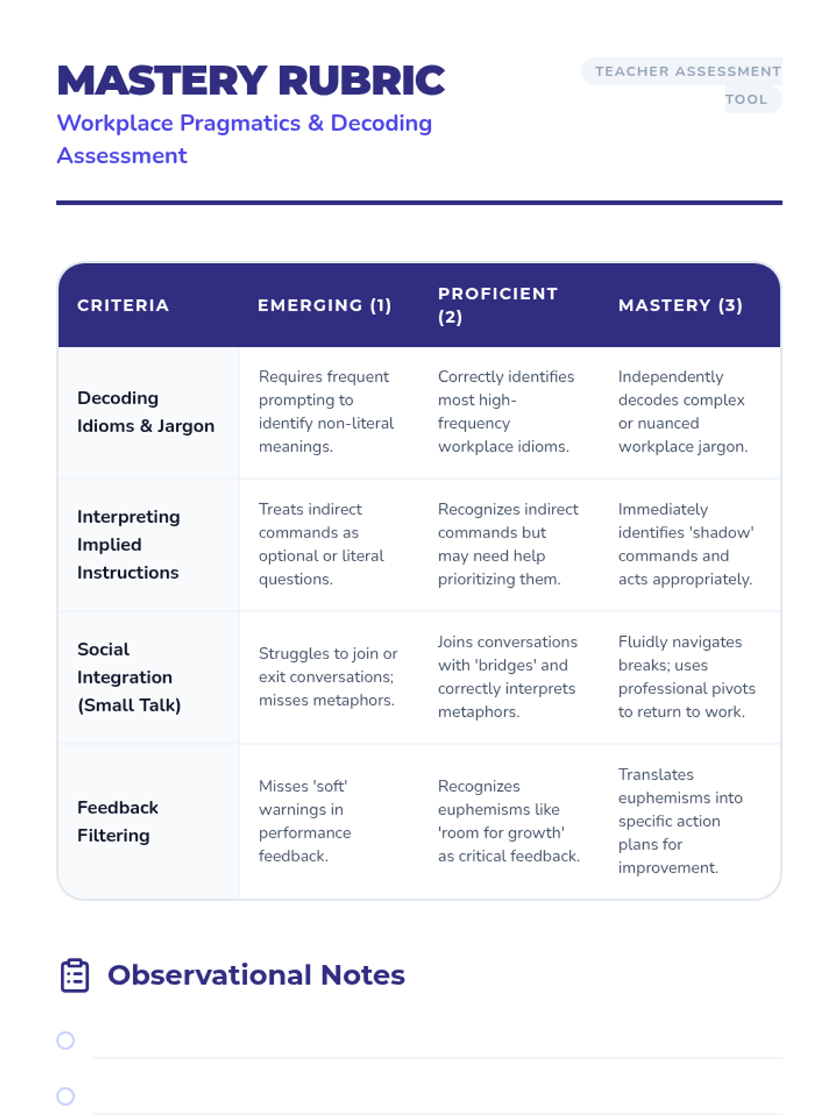 This sequence prepares students for transition to the workforce by focusing specifically on the idioms, euphemisms, and jargon common in professional environments. Students analyze workplace scenarios to distinguish between direct instructions and polite suggestions often masked in figurative language.