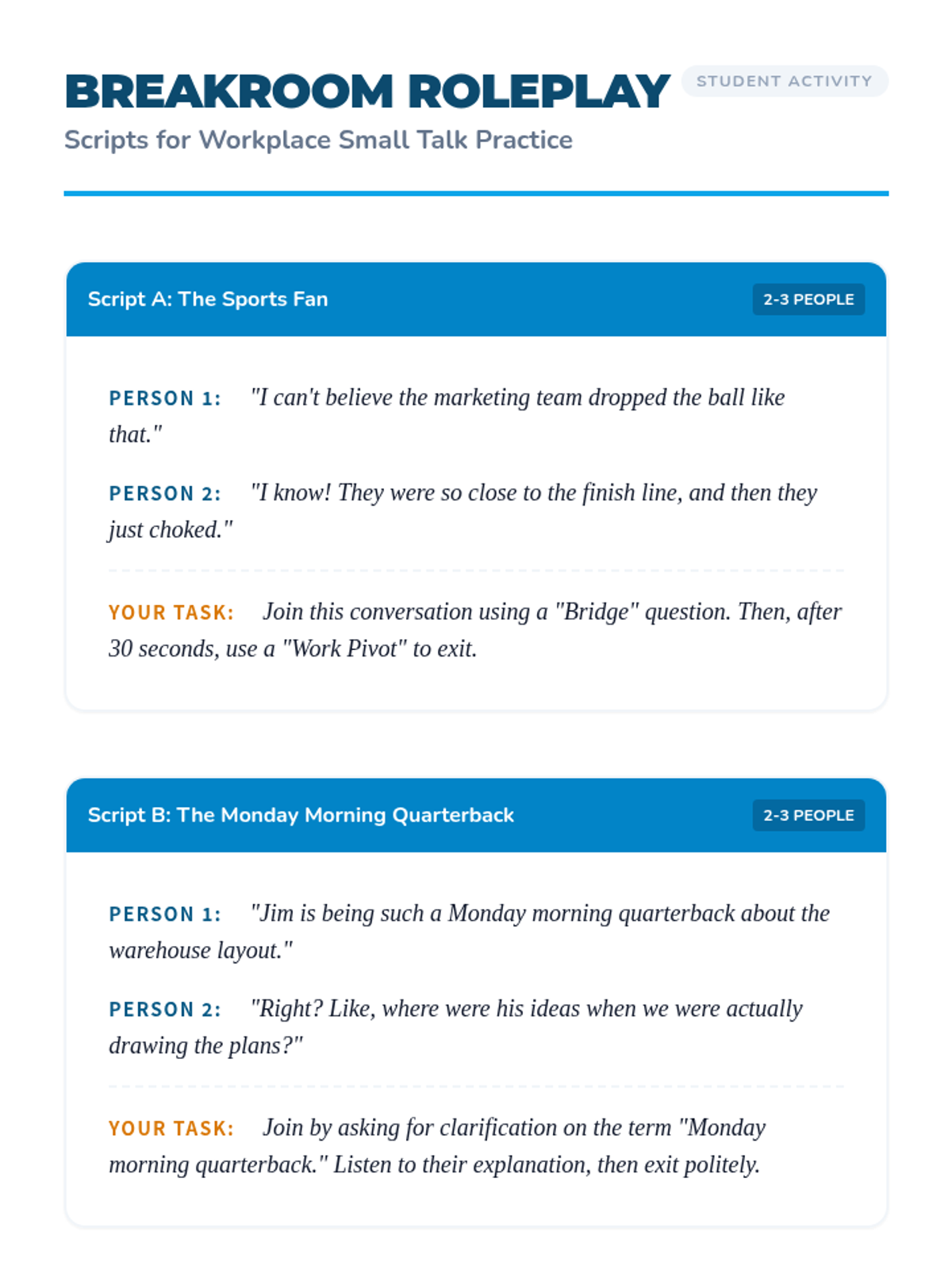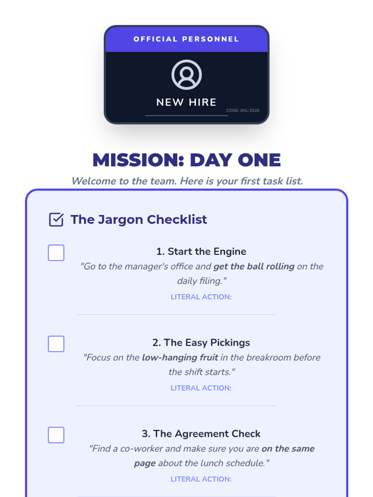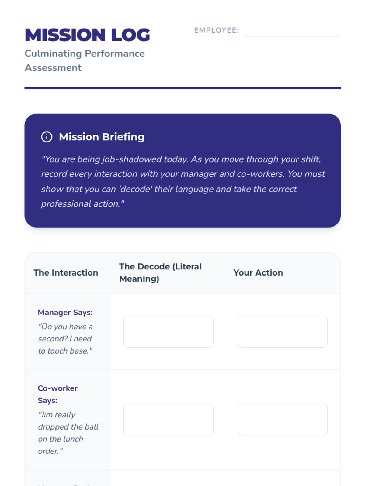 This sequence prepares students for transition to the workforce by focusing specifically on the idioms, euphemisms, and jargon common in professional environments. Students analyze workplace scenarios to distinguish between direct instructions and polite suggestions often masked in figurative language.