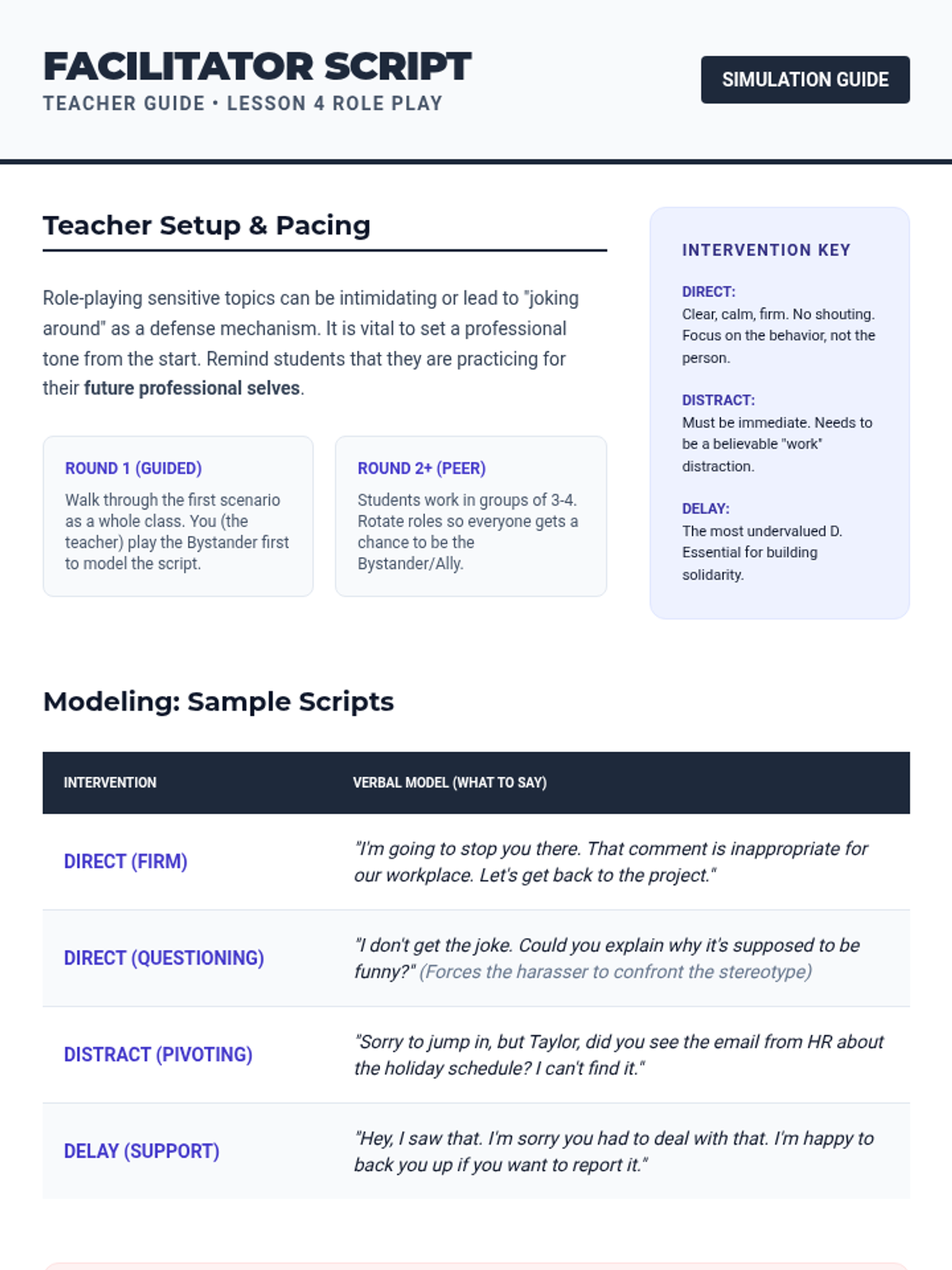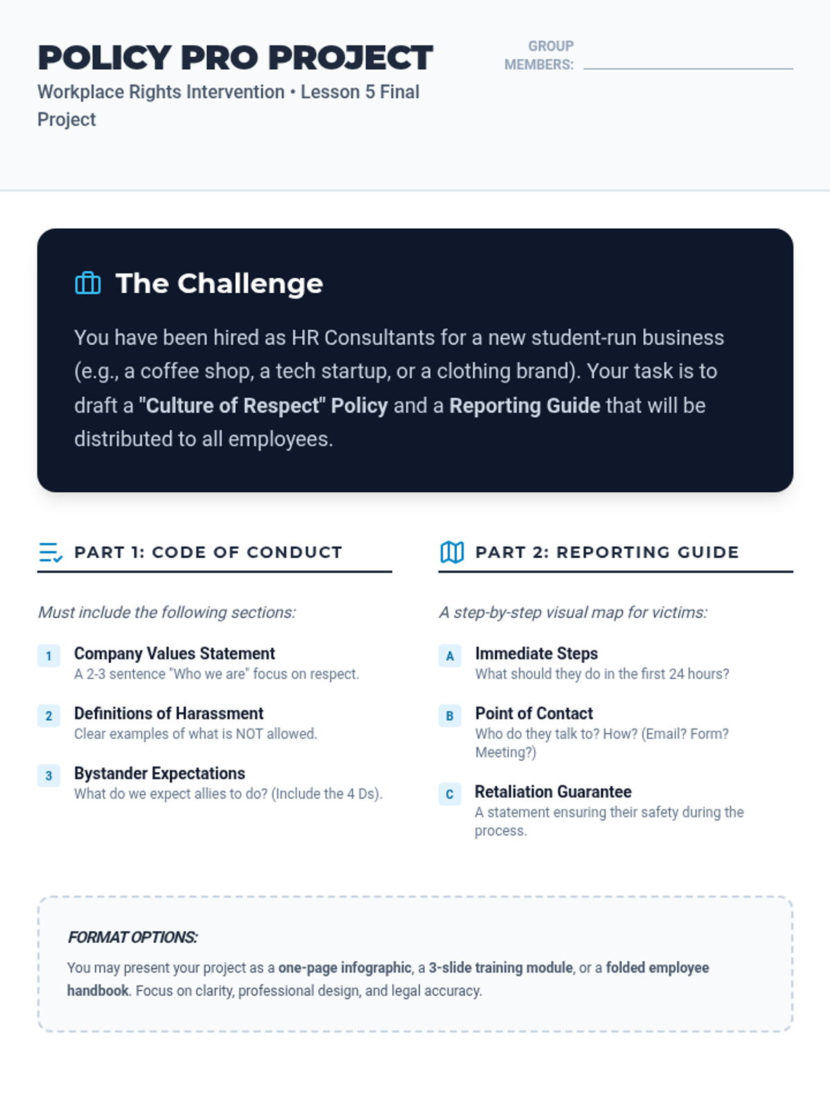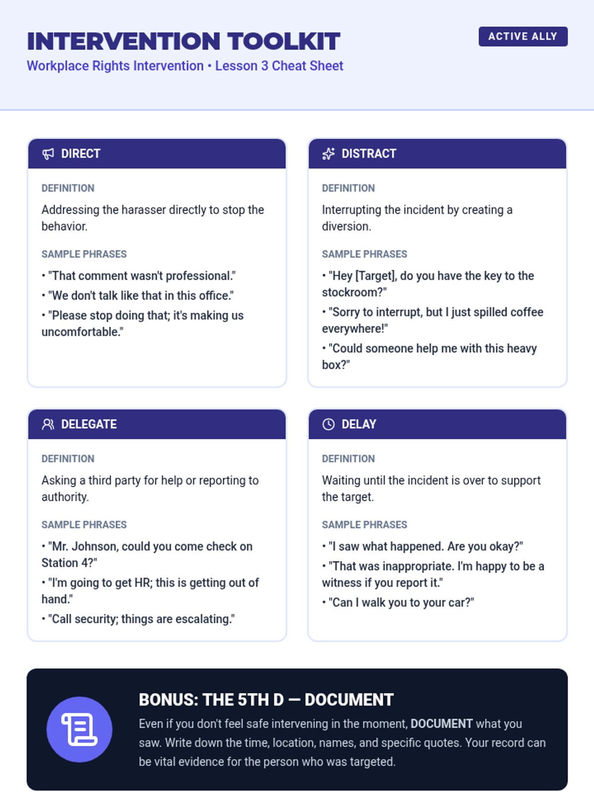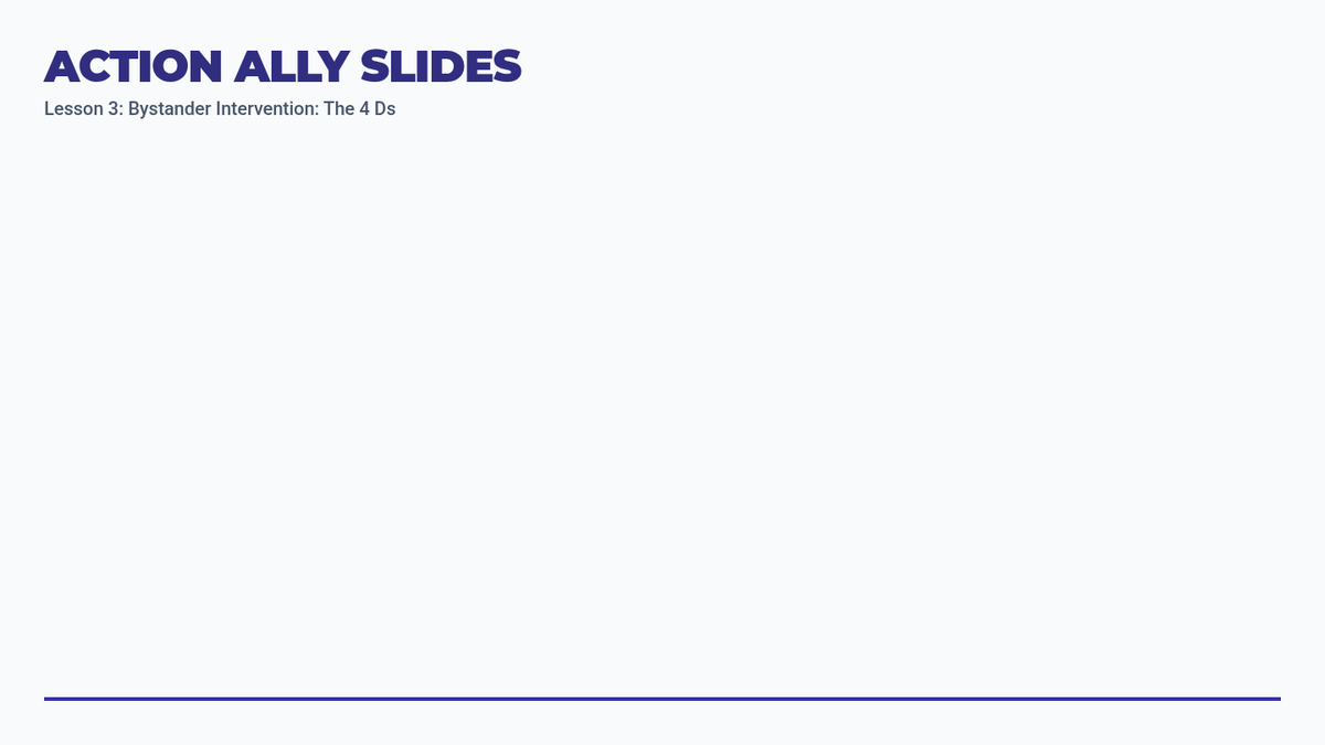 This sequence shifts from identification to action, equipping students with the tools to report misconduct and intervene safely. Students learn the formal mechanisms for reporting discrimination, protections against retaliation, and the '4 Ds' of bystander intervention.
