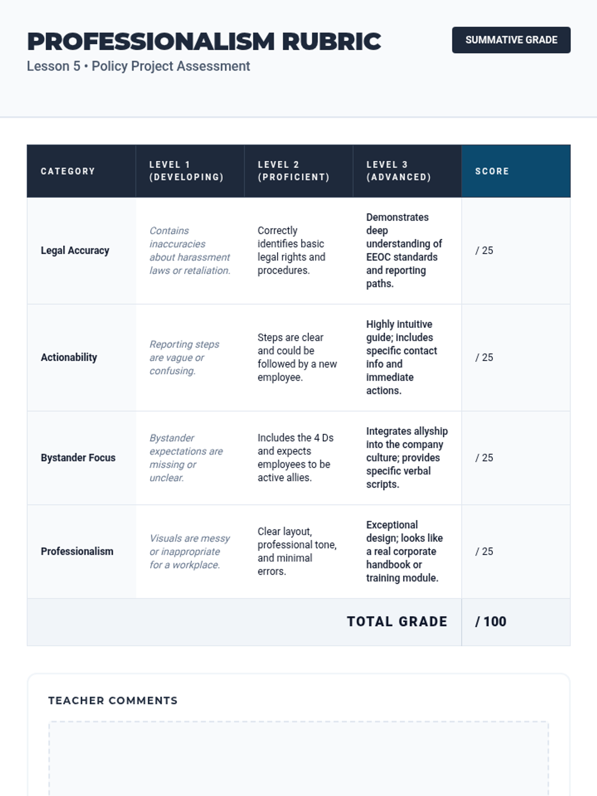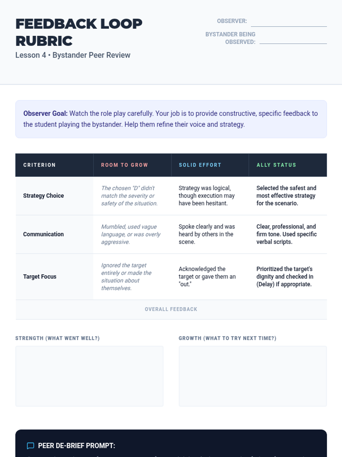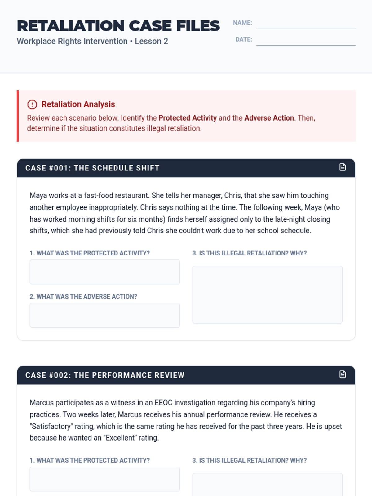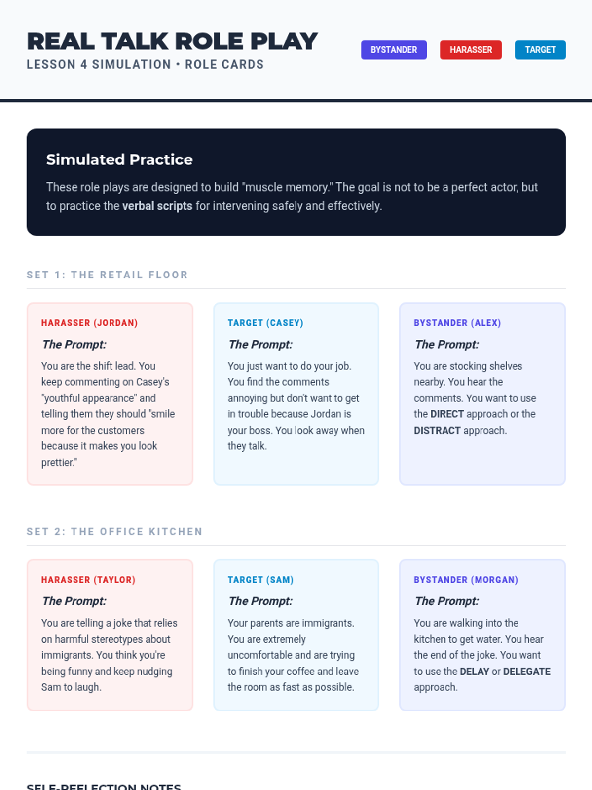 This sequence shifts from identification to action, equipping students with the tools to report misconduct and intervene safely. Students learn the formal mechanisms for reporting discrimination, protections against retaliation, and the '4 Ds' of bystander intervention.