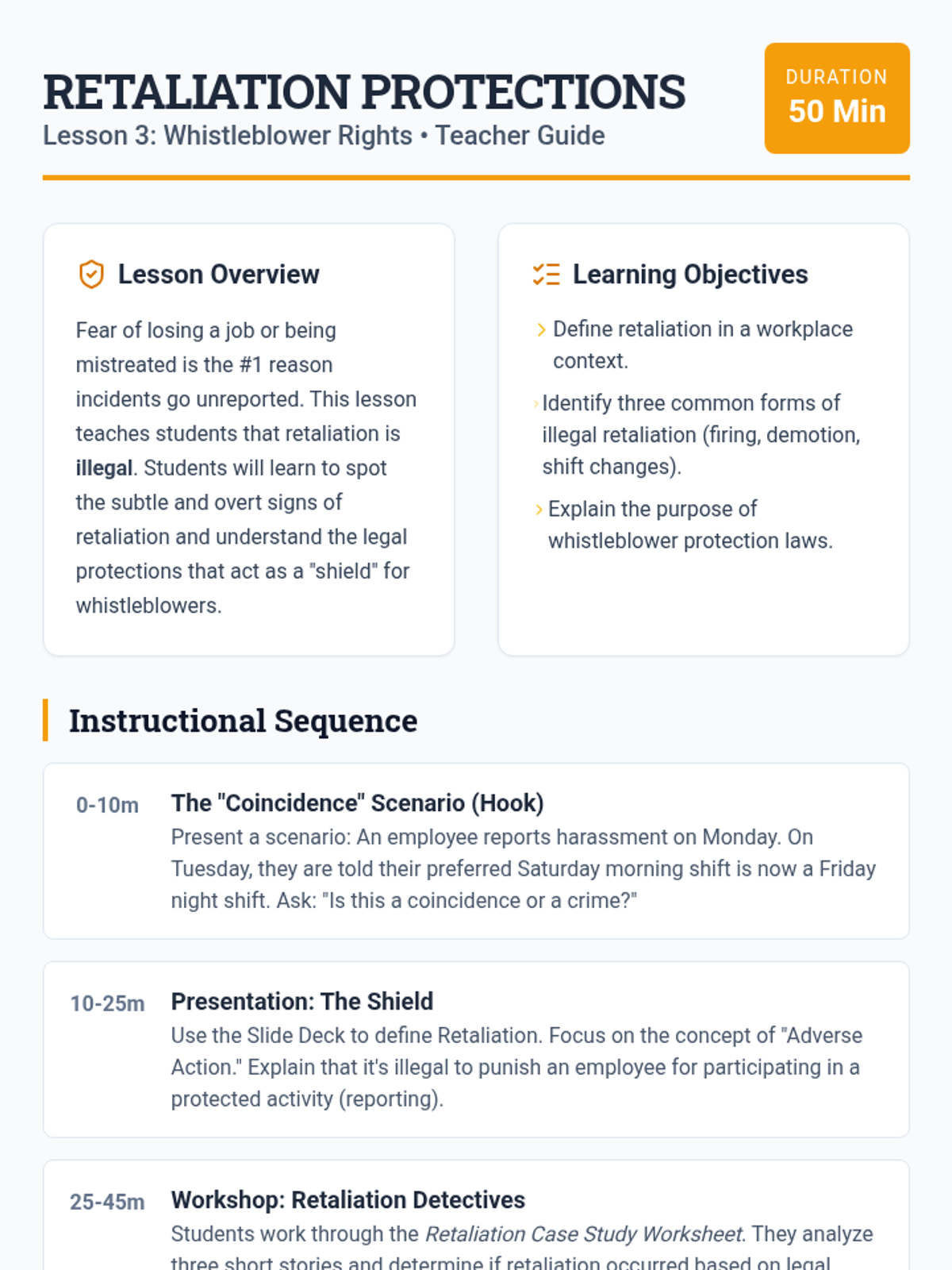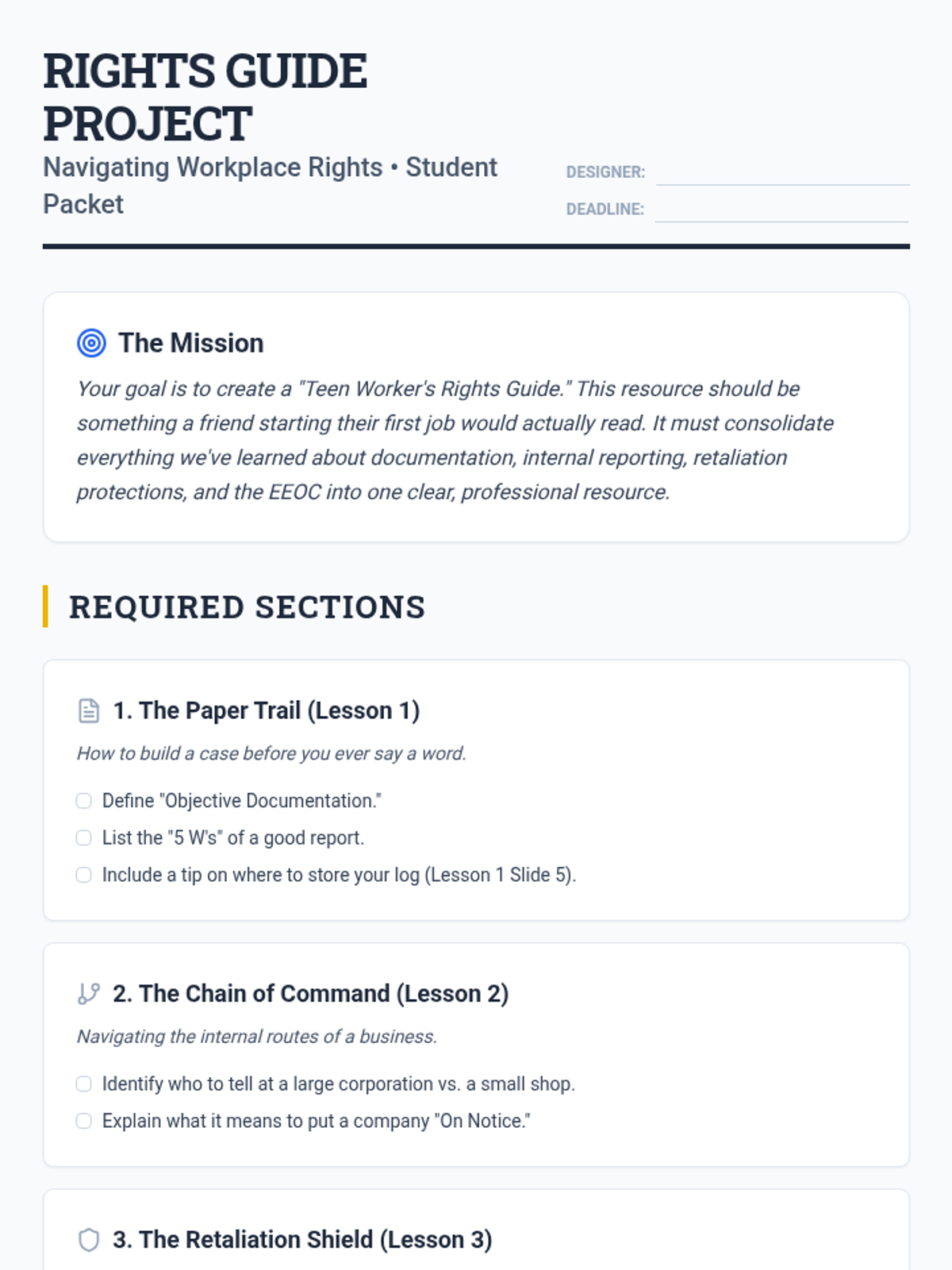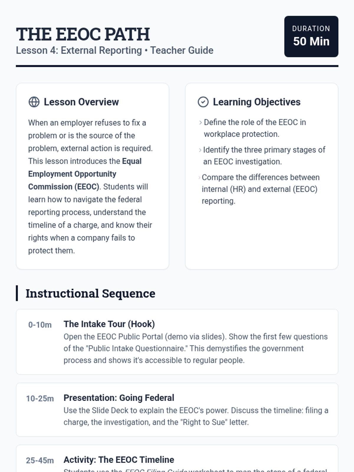 This sequence teaches 9th-grade students how to navigate the logistical and procedural aspects of workplace rights, focusing on documentation, internal reporting to HR, whistleblower protections, and external reporting through the EEOC. The unit culminates in a student-created workplace rights guide for peers.