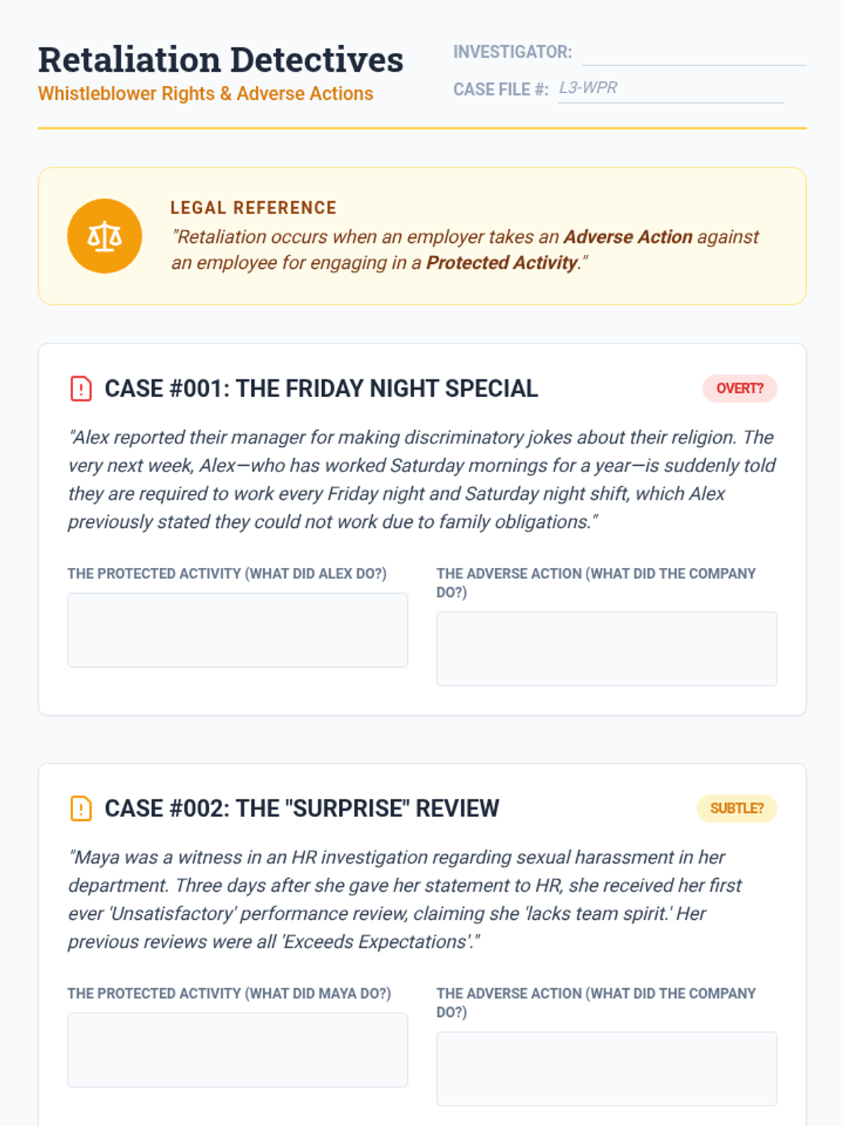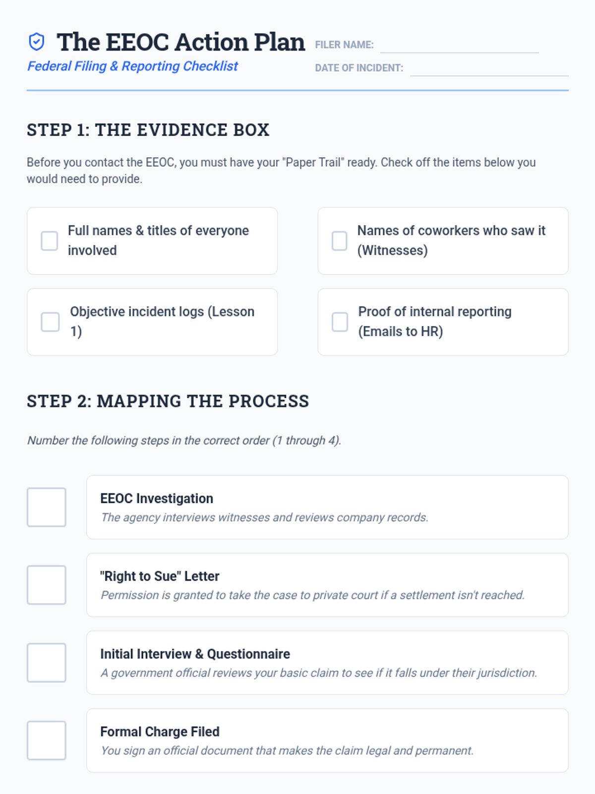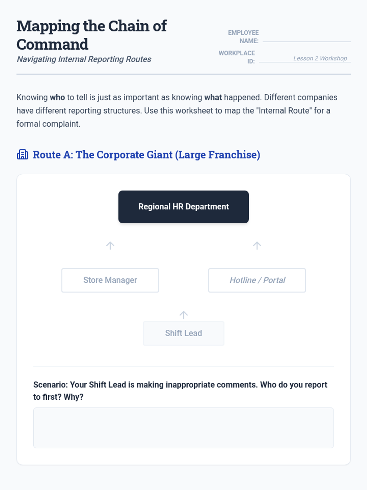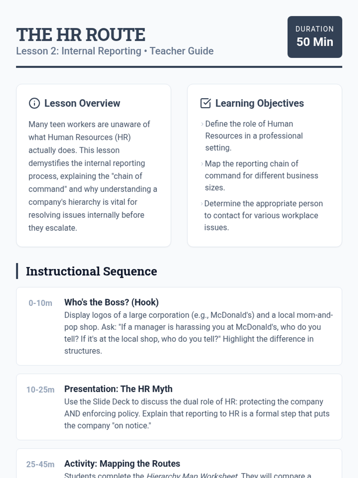 This sequence teaches 9th-grade students how to navigate the logistical and procedural aspects of workplace rights, focusing on documentation, internal reporting to HR, whistleblower protections, and external reporting through the EEOC. The unit culminates in a student-created workplace rights guide for peers.
