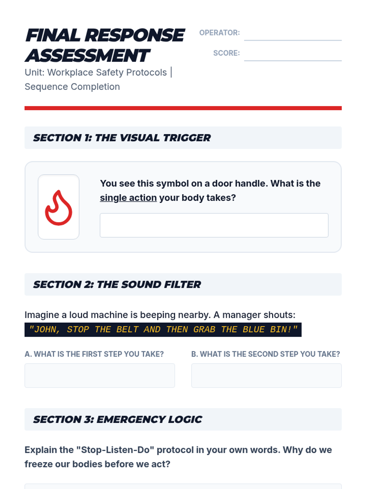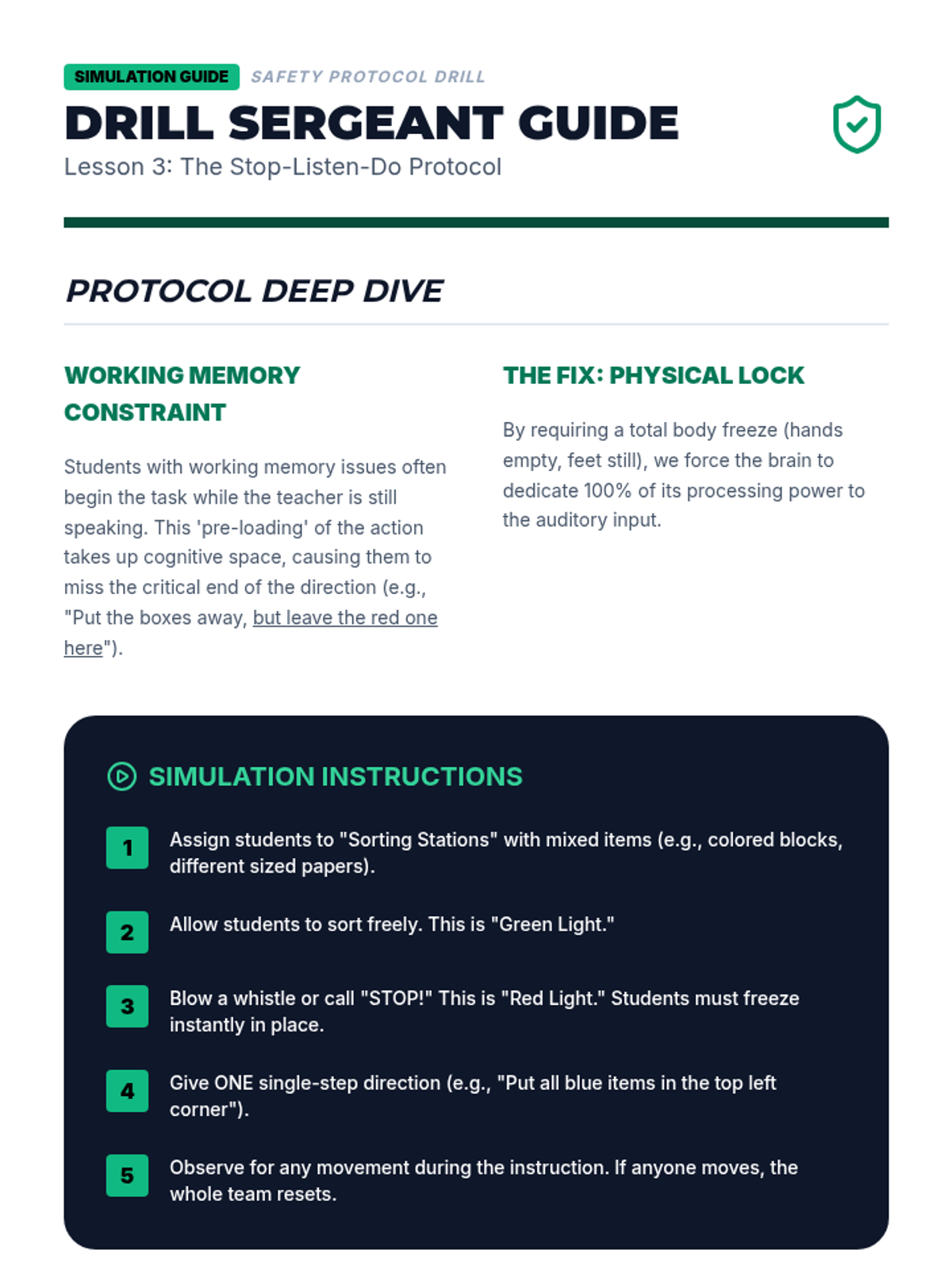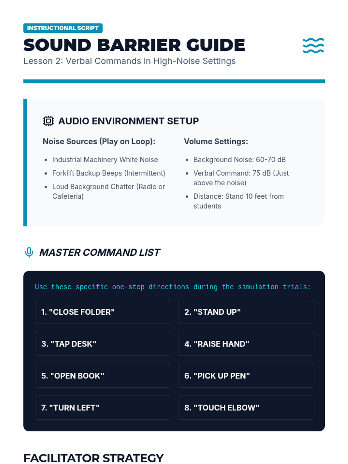 A vocational training sequence for 11th-grade students focusing on working memory through single-step directions in workplace safety contexts. Students practice interpreting signs, filtering auditory distractions, and following strict protocols in high-stakes simulations.