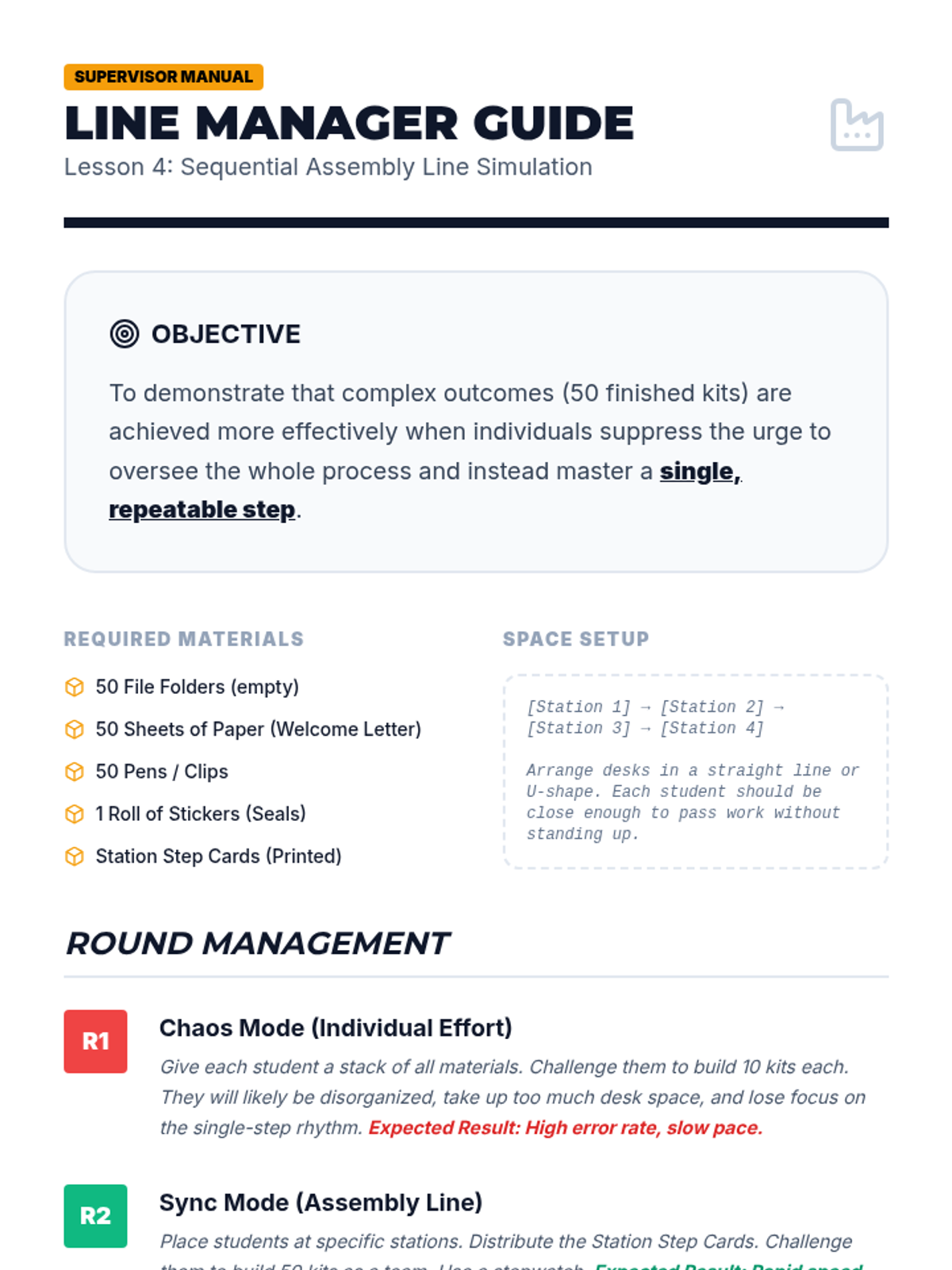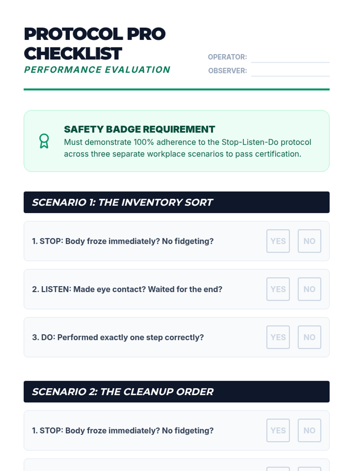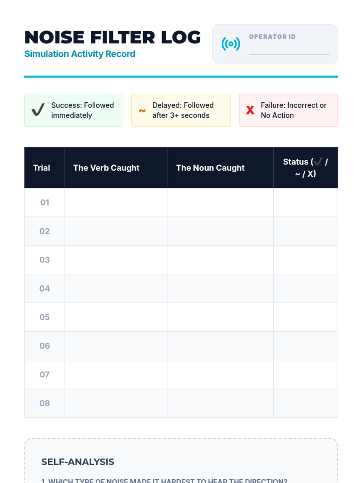 A vocational training sequence for 11th-grade students focusing on working memory through single-step directions in workplace safety contexts. Students practice interpreting signs, filtering auditory distractions, and following strict protocols in high-stakes simulations.