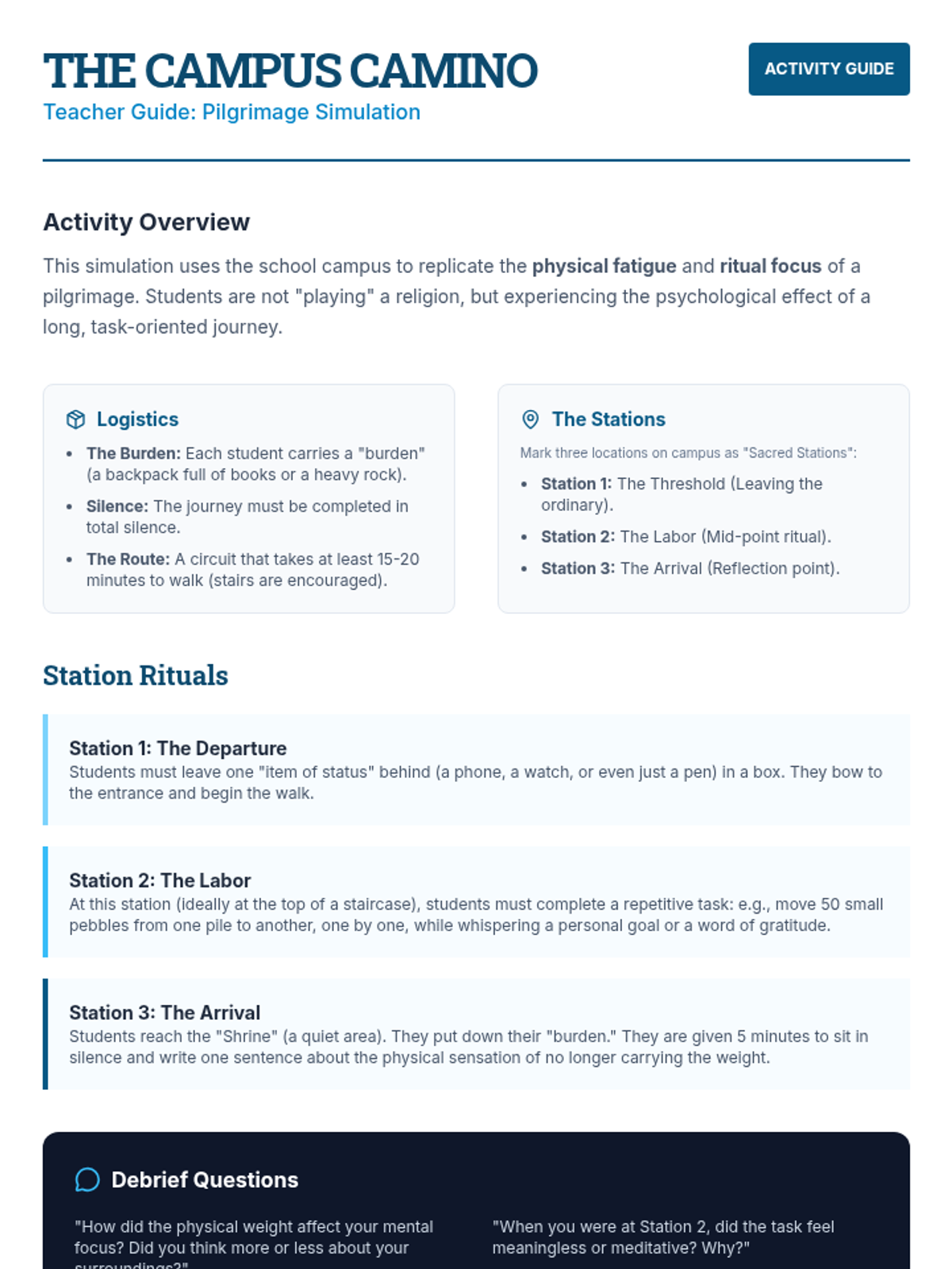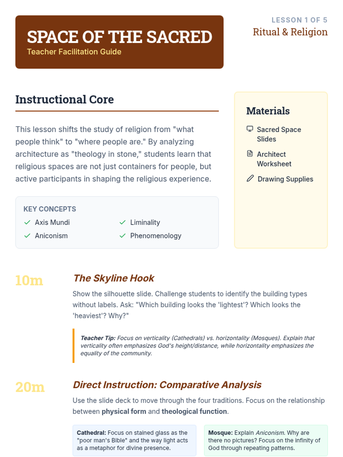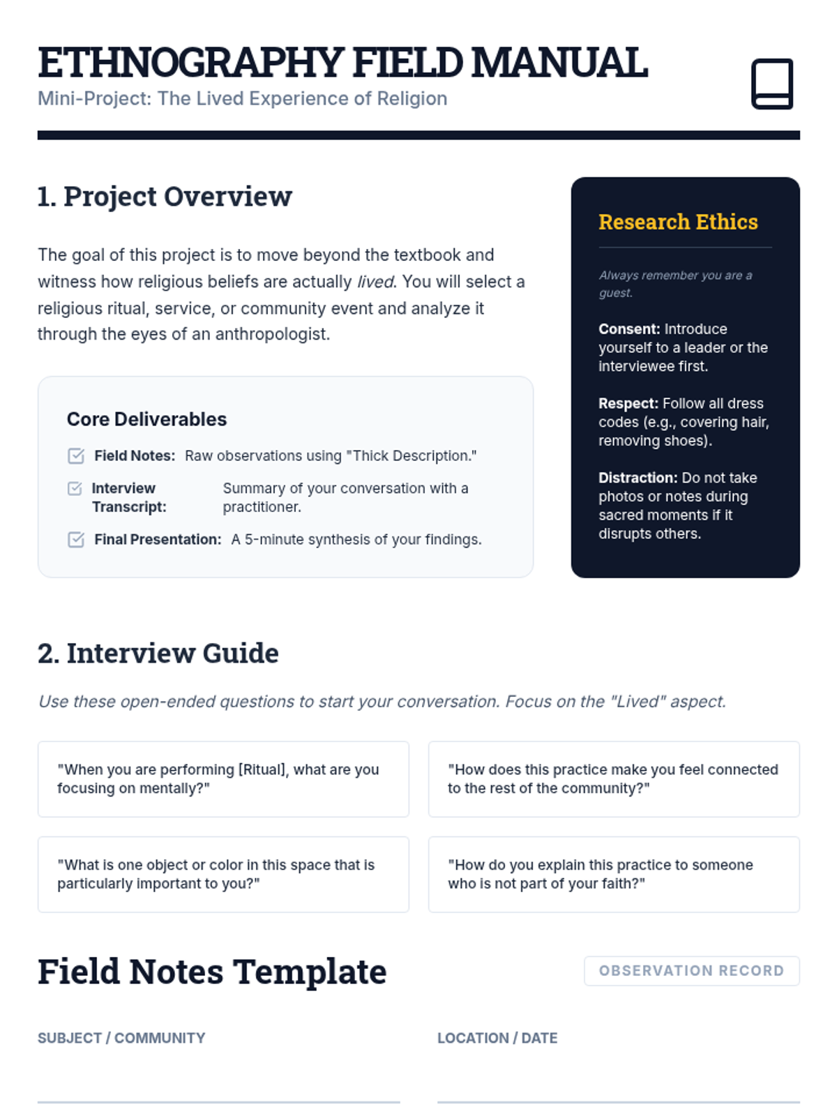 An 11th-grade anthropology-based exploration of world religions through the lens of lived experience, rituals, and cultural expressions. Students move beyond abstract theology to understand how beliefs are manifested in architecture, diet, rites of passage, and pilgrimage.