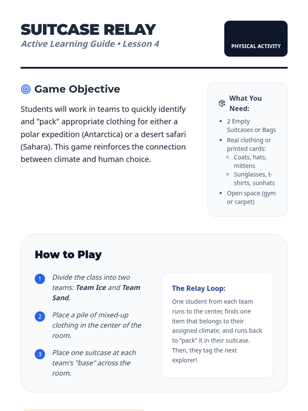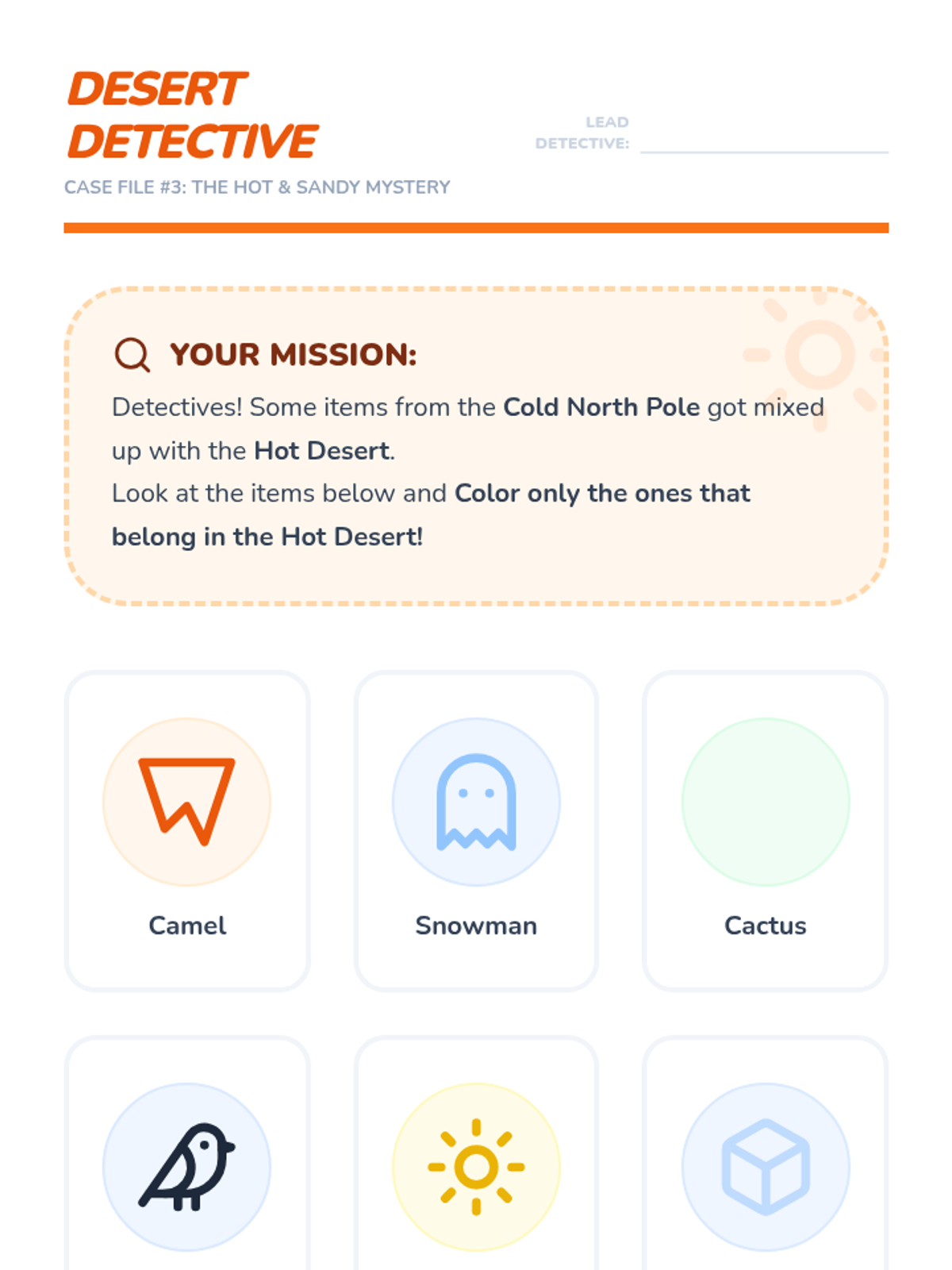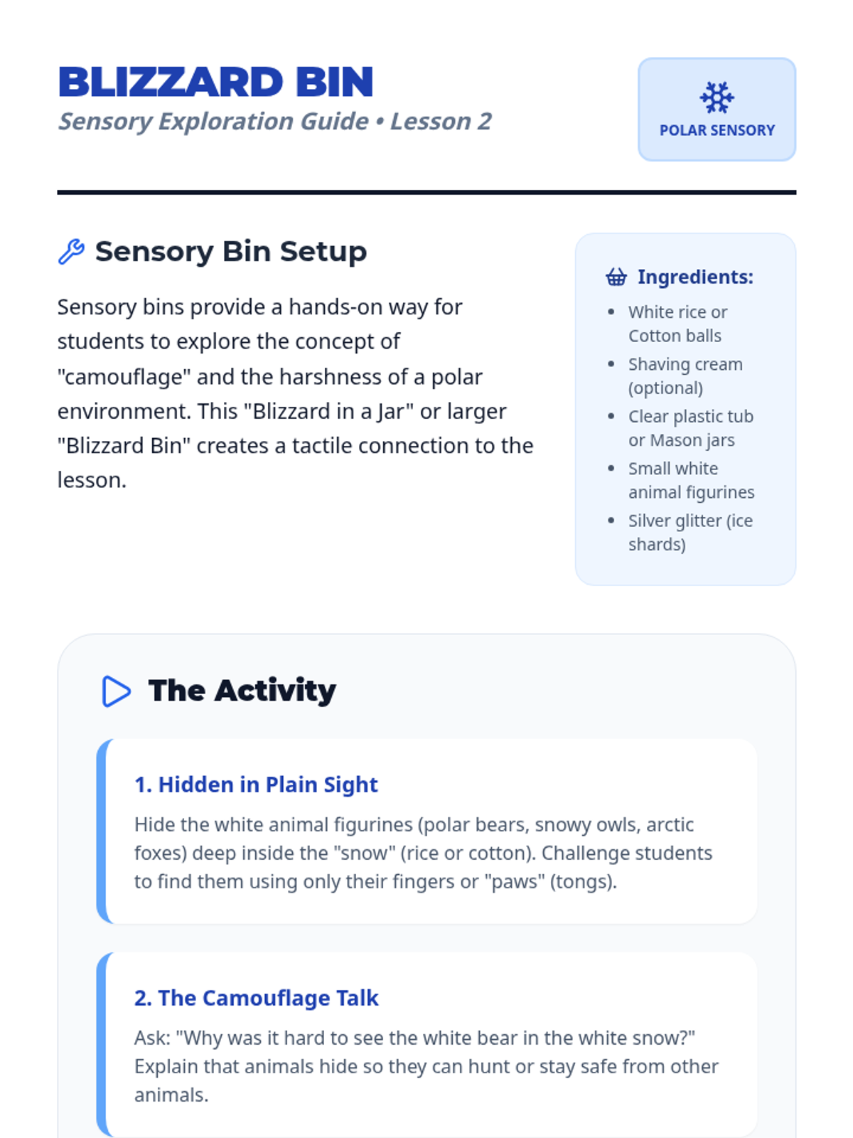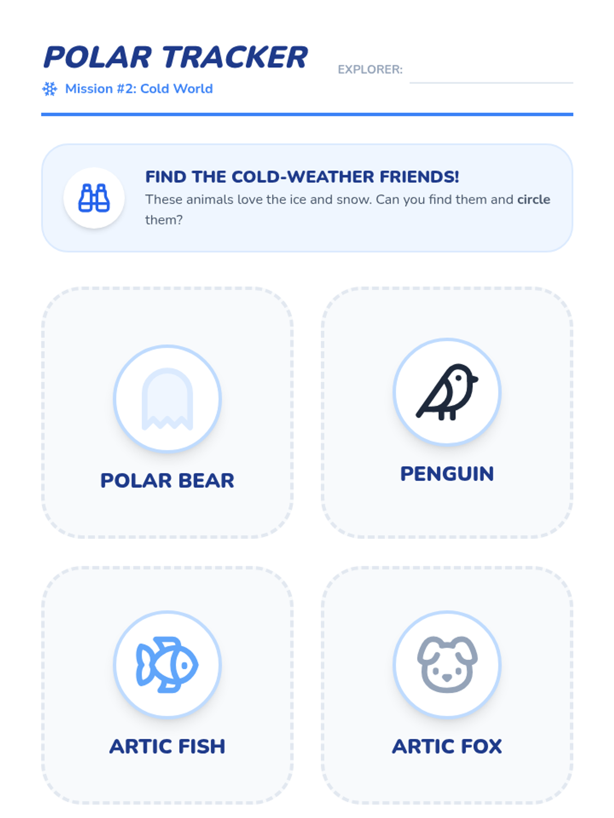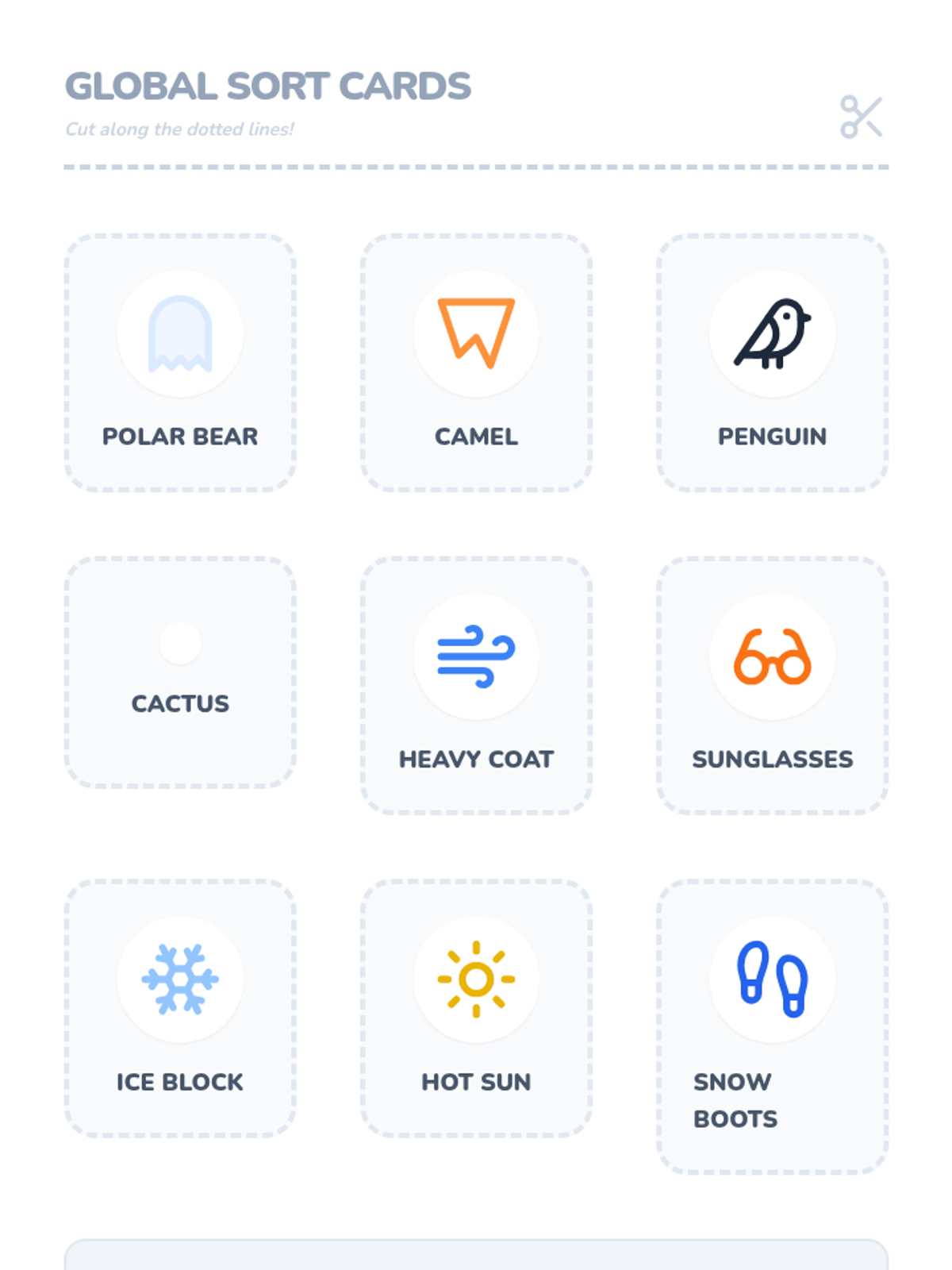 A Kindergarten geography unit comparing hot and cold global environments, focusing on the poles and equator, animal adaptations, and human clothing choices. Students use sensory exploration and categorization to understand environmental diversity.