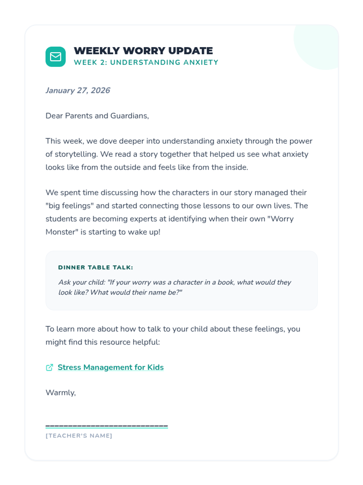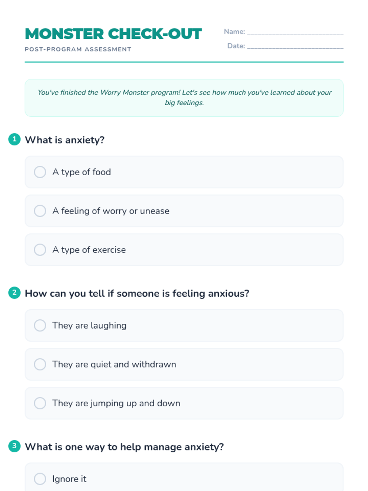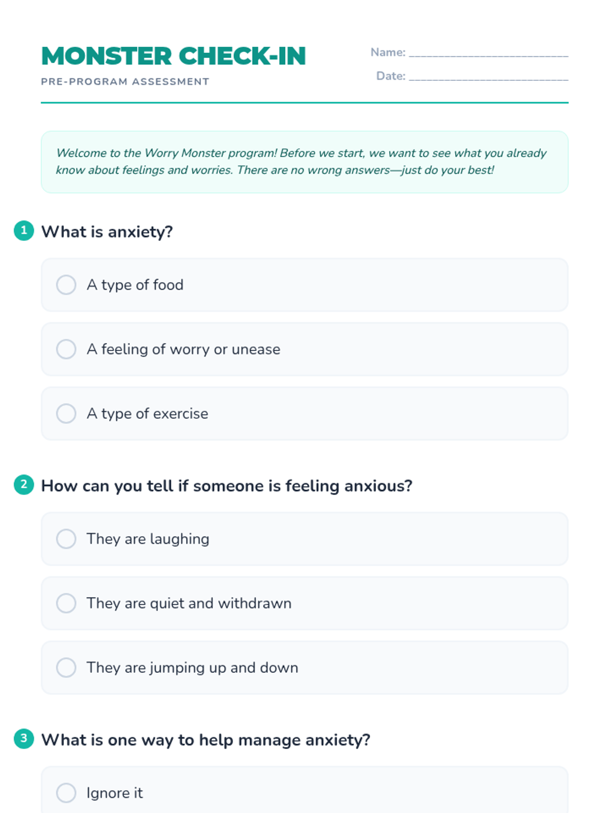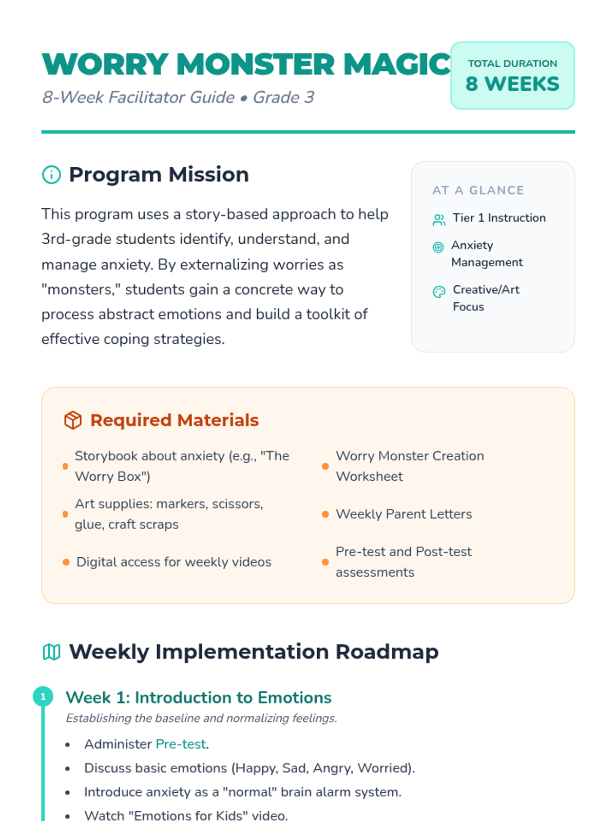 An 8-week social-emotional learning program for 3rd grade students to identify, understand, and manage anxiety through storytelling, creative arts, and evidence-based coping strategies.