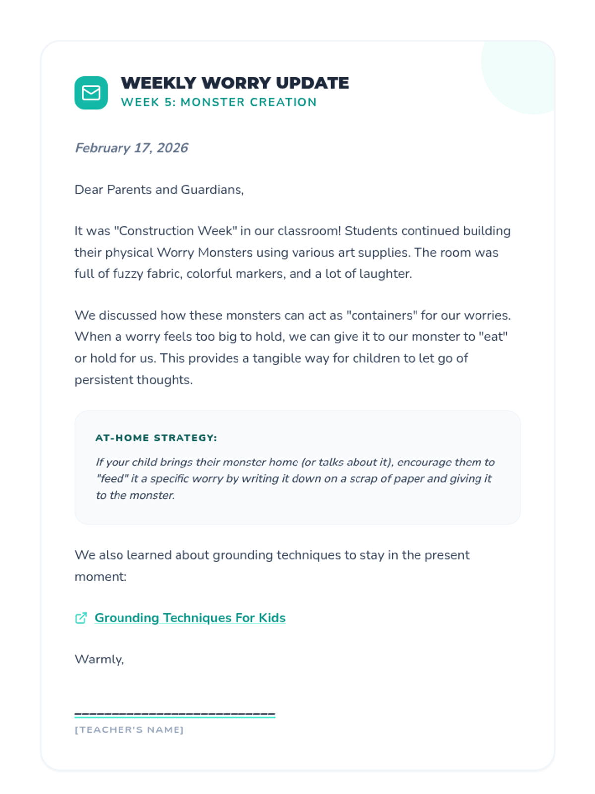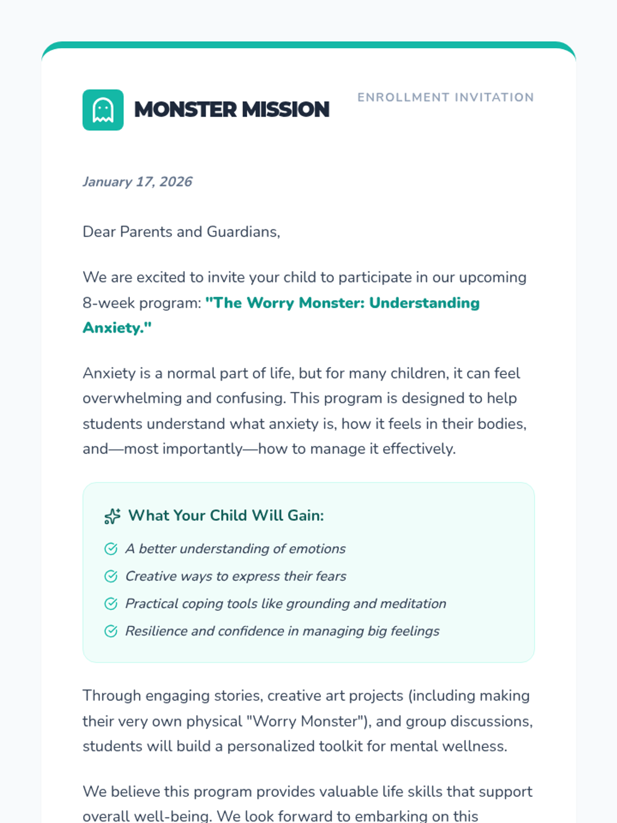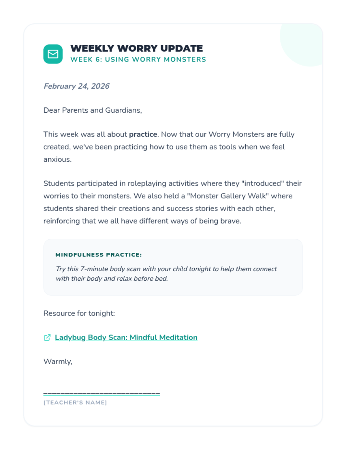 An 8-week social-emotional learning program for 3rd grade students to identify, understand, and manage anxiety through storytelling, creative arts, and evidence-based coping strategies.