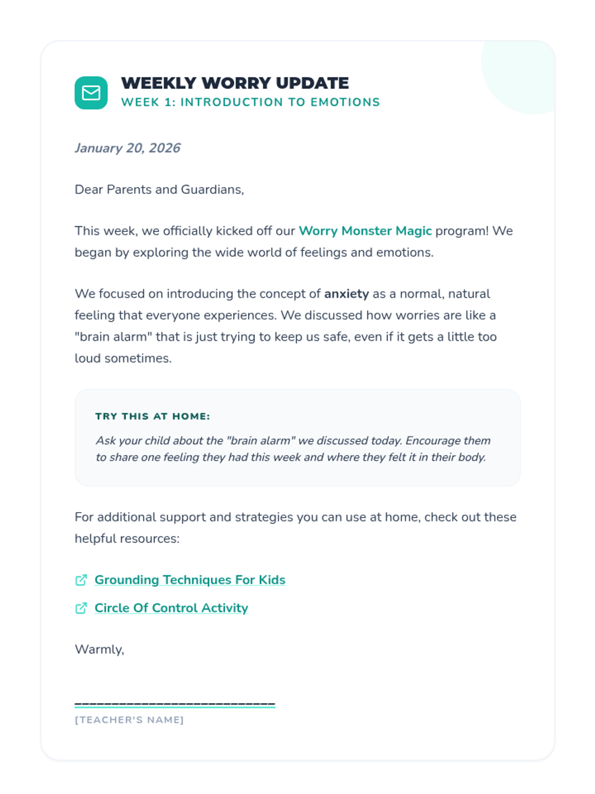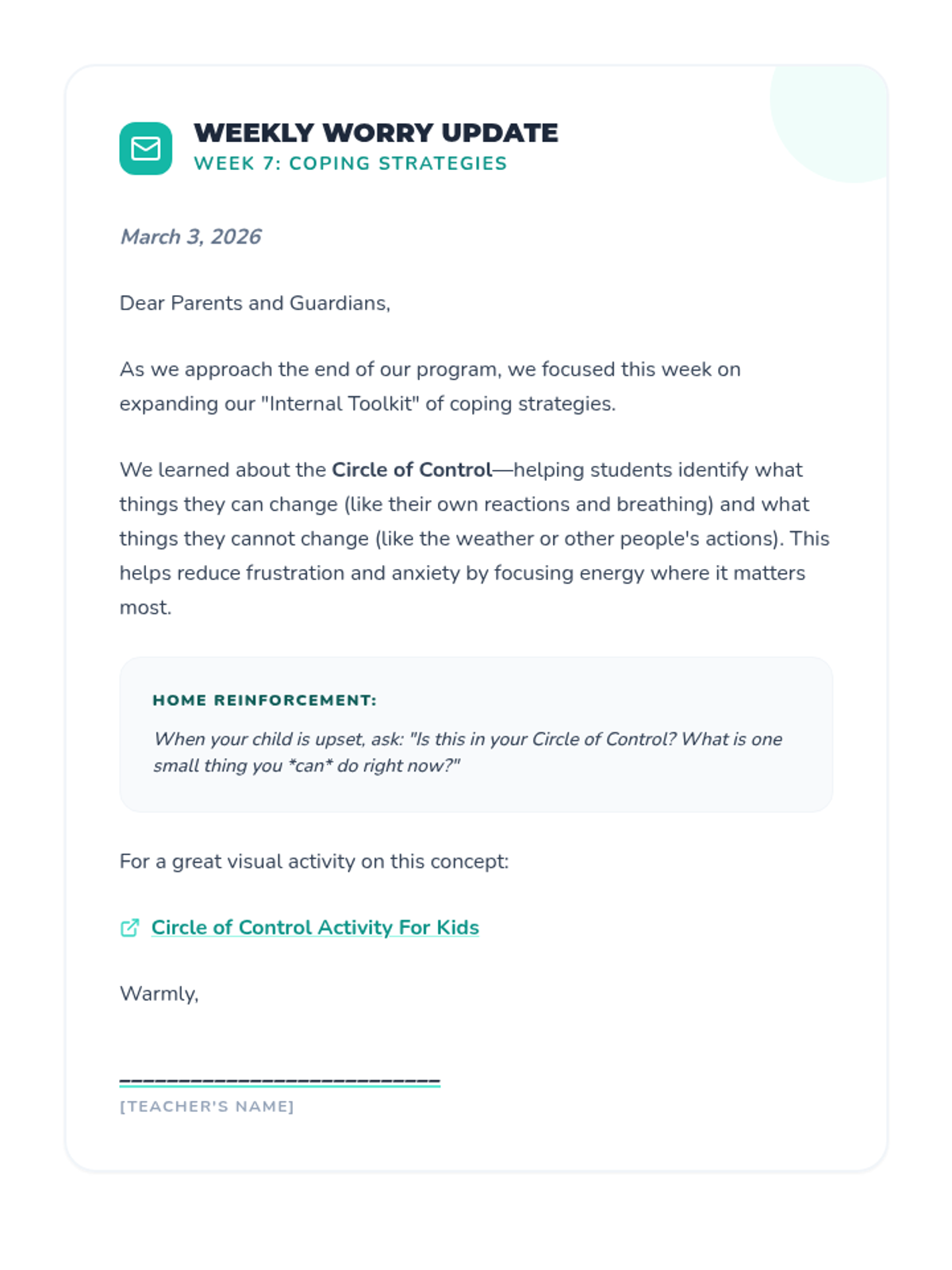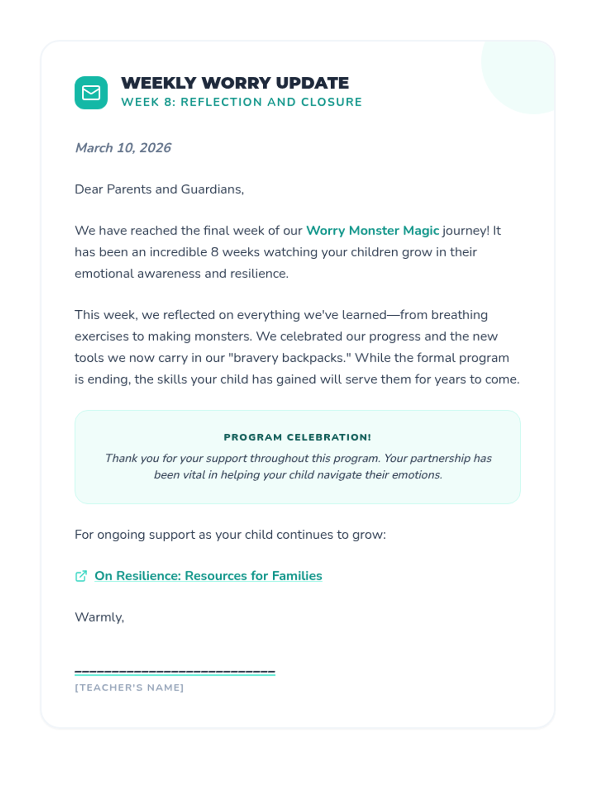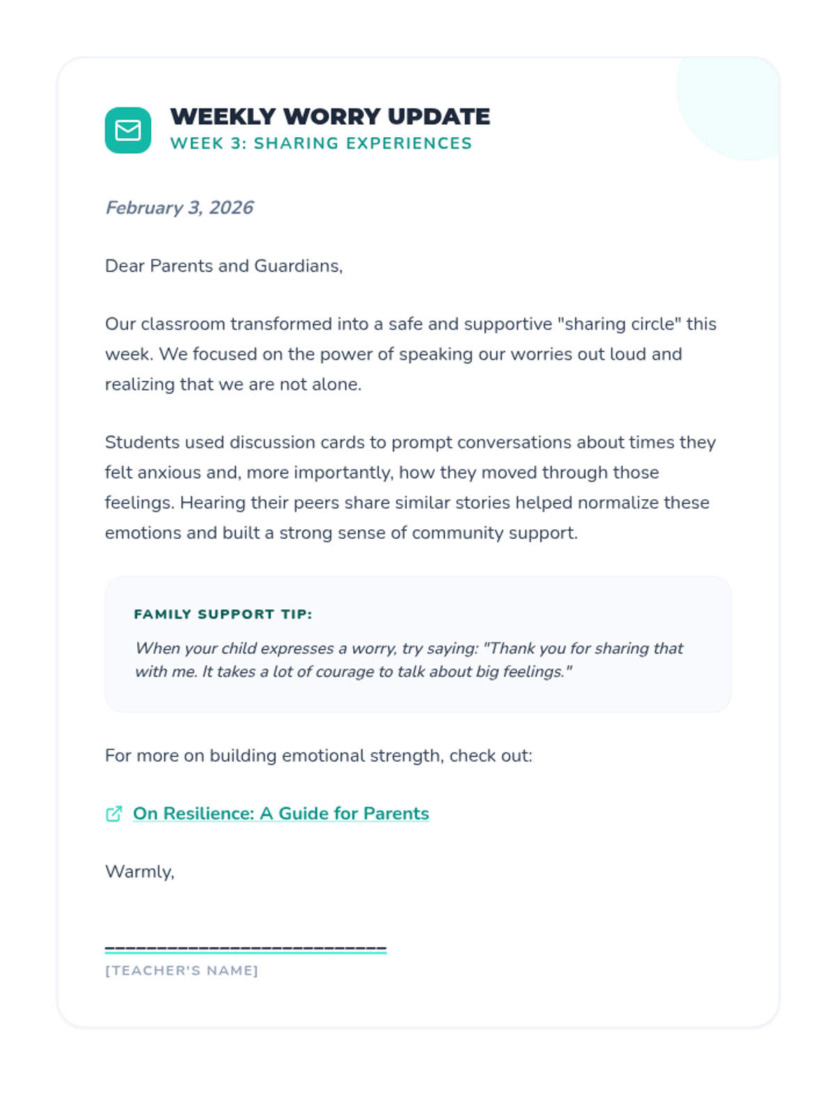 An 8-week social-emotional learning program for 3rd grade students to identify, understand, and manage anxiety through storytelling, creative arts, and evidence-based coping strategies.