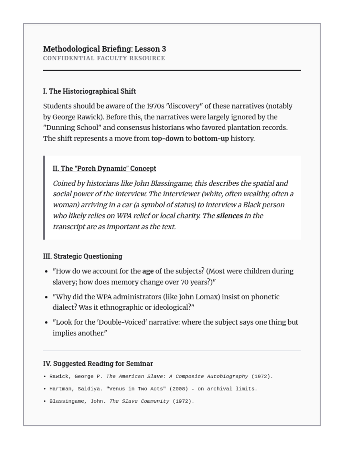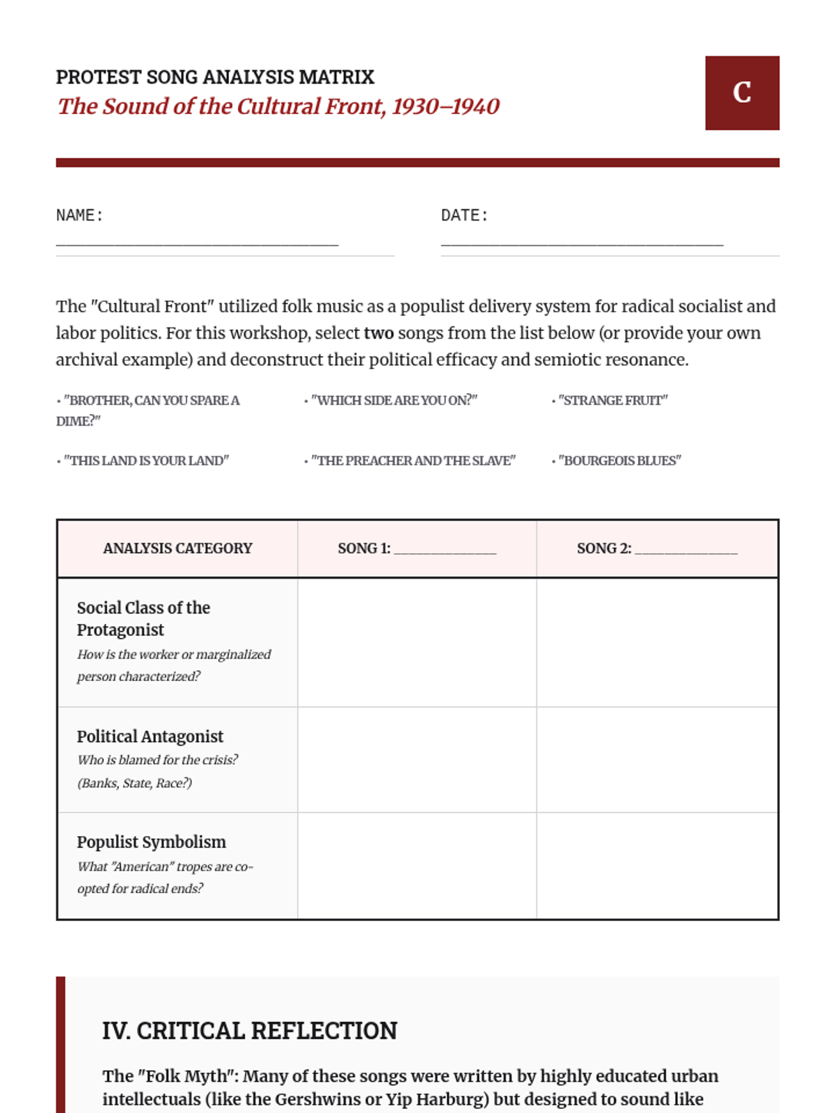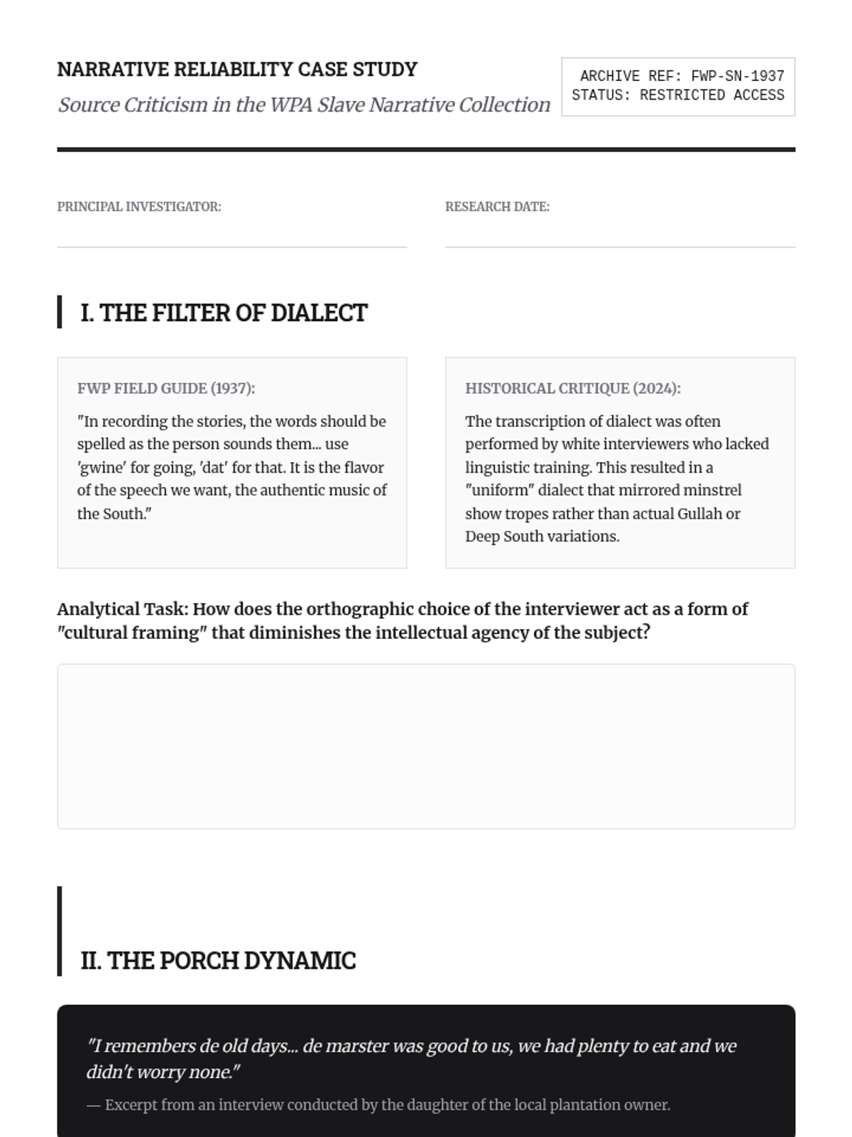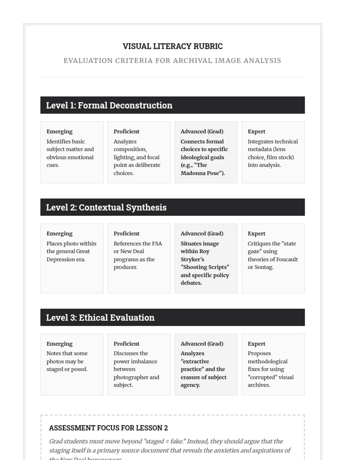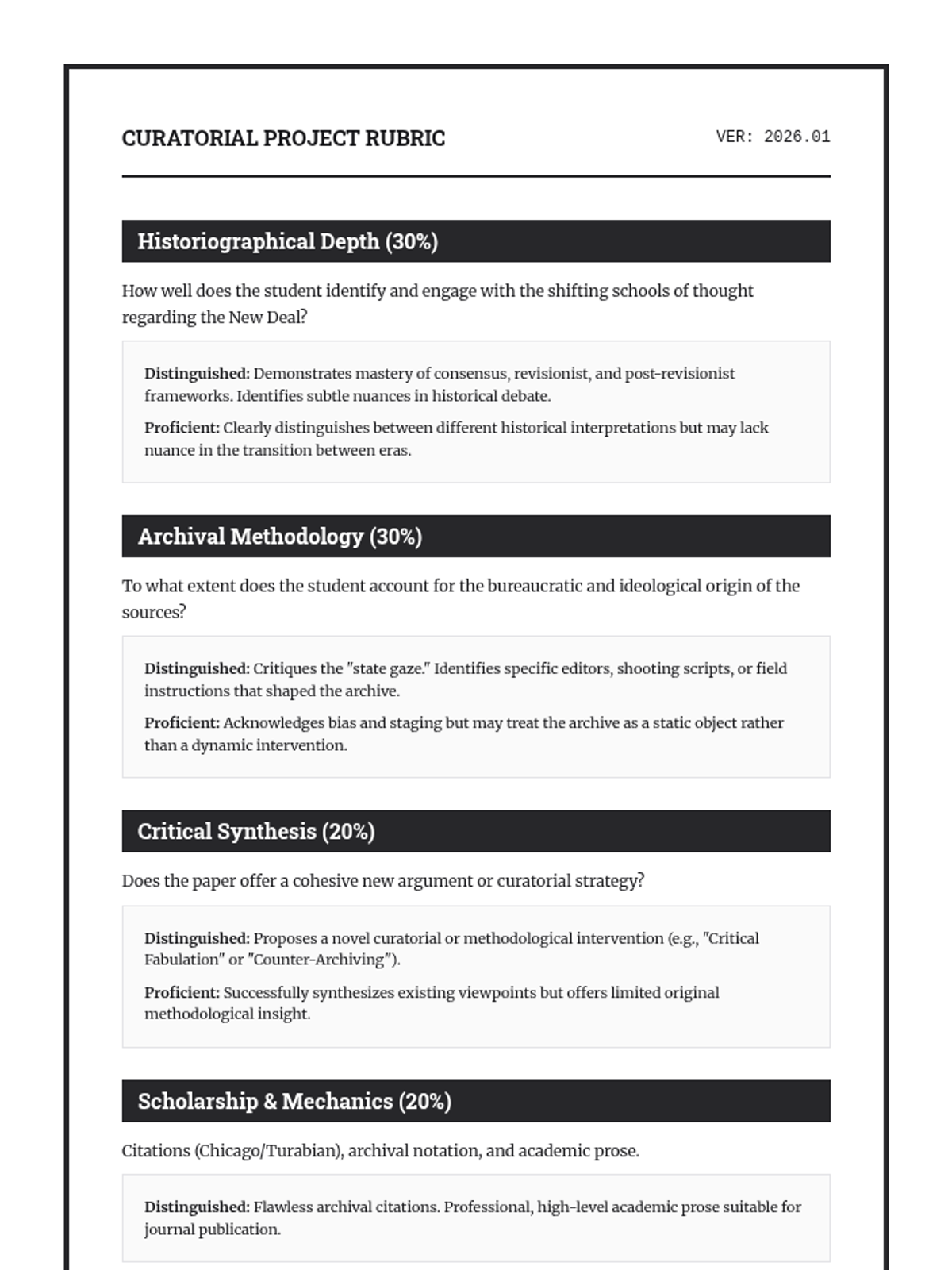 A graduate-level sequence exploring the Great Depression through the lens of New Deal cultural programs, focusing on archival methods, visual sociology, and historiography. Students critique state-sponsored narratives and use primary sources from the WPA, FSA, and Federal Writers' Project to reconstruct 'history from below'.