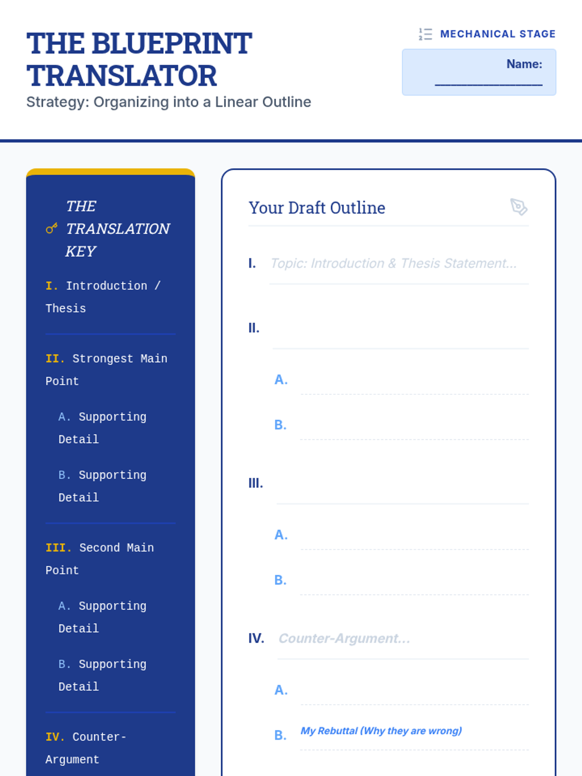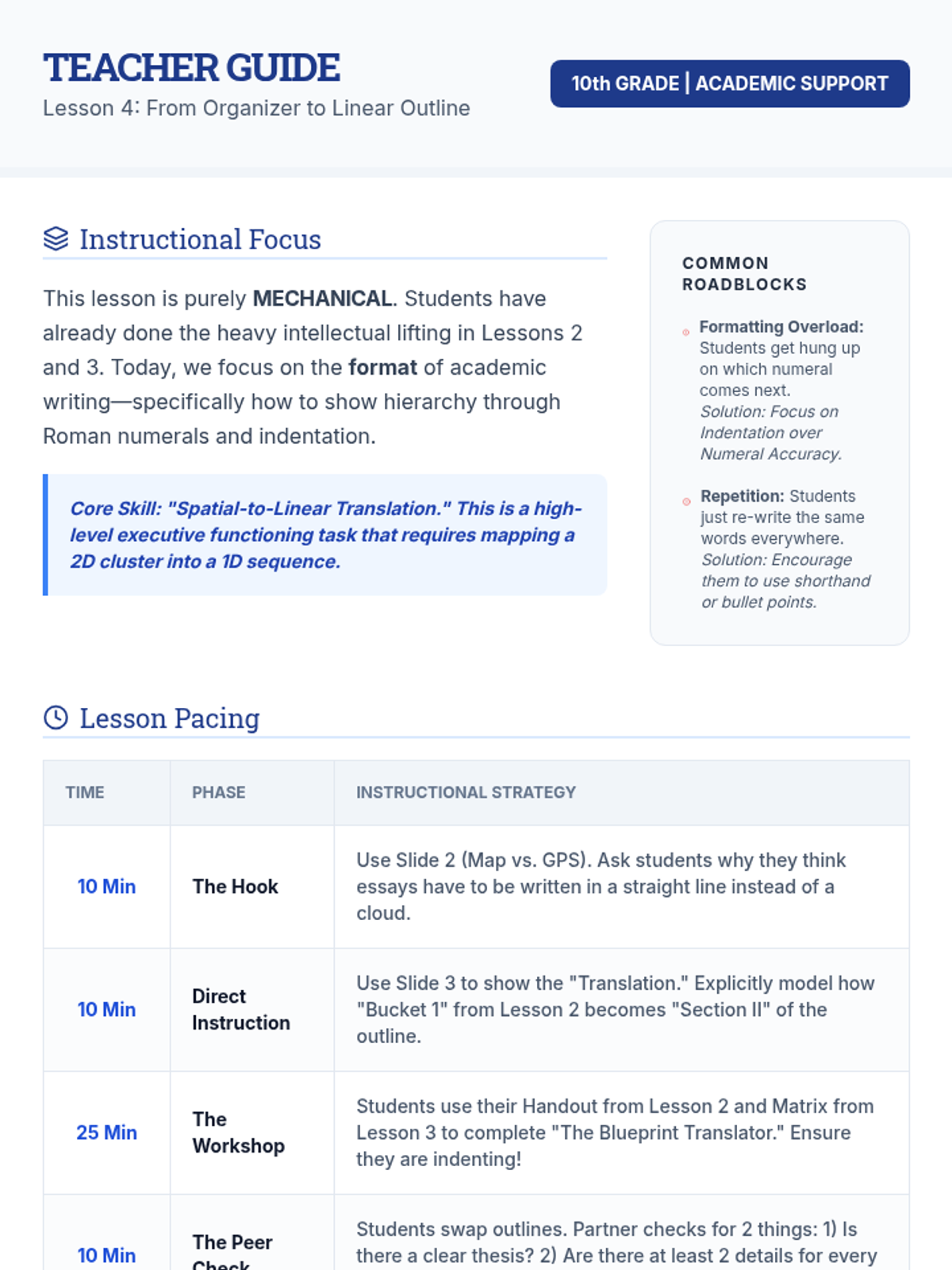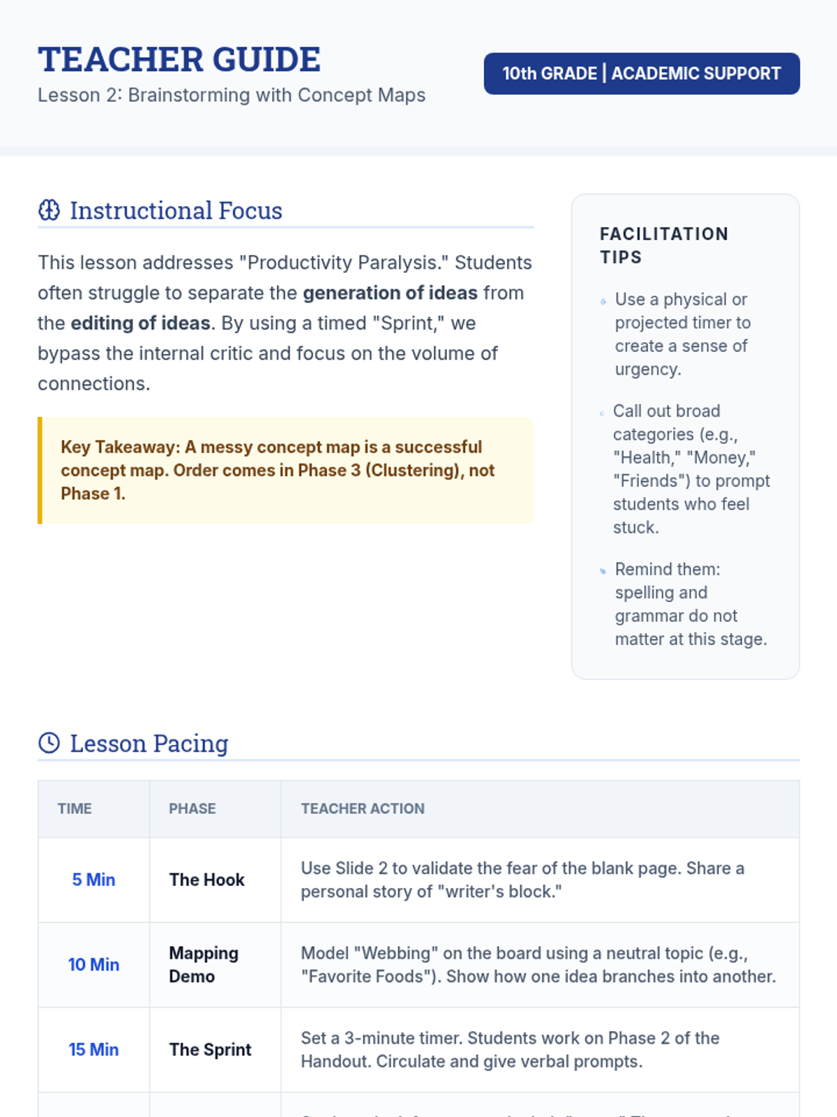 A 10th-grade workshop-style sequence teaching students how to use visual planning tools to bridge the gap between brainstorming and academic writing. Students learn to analyze prompts, categorize ideas, and translate graphic organizers into formal outlines and drafts.