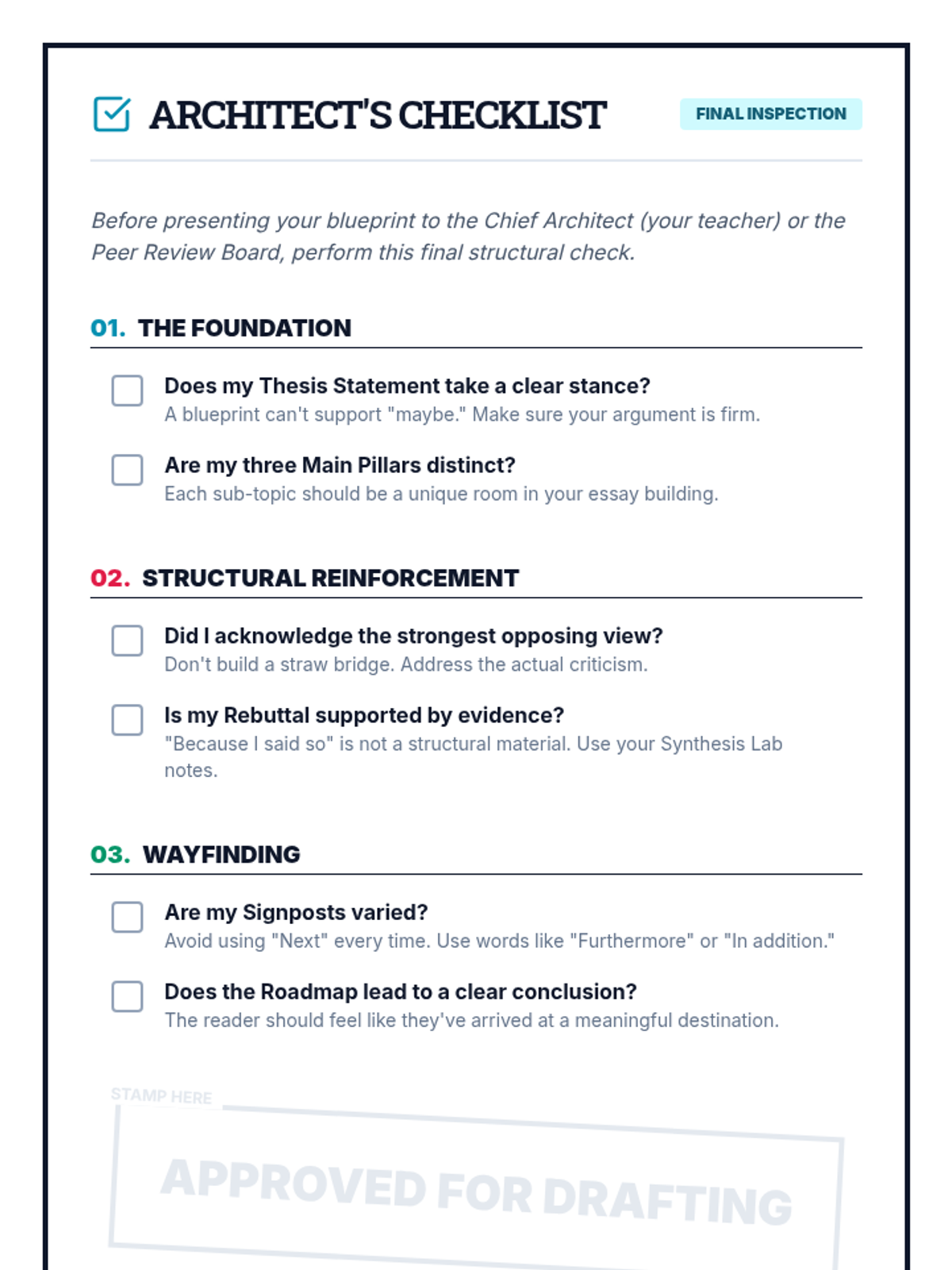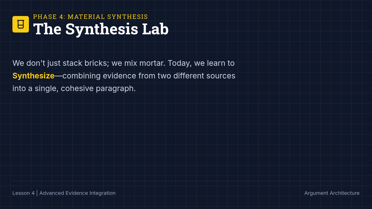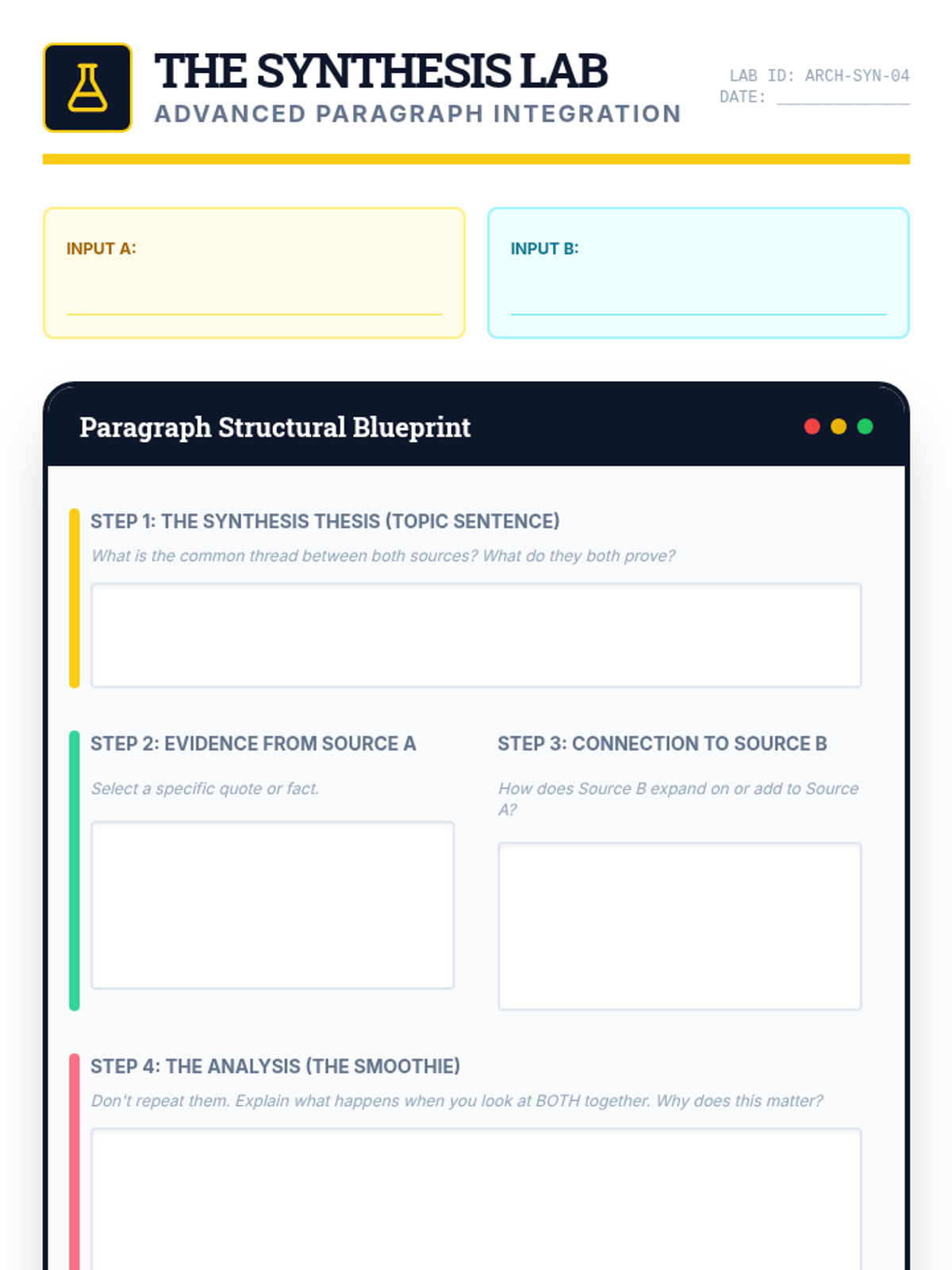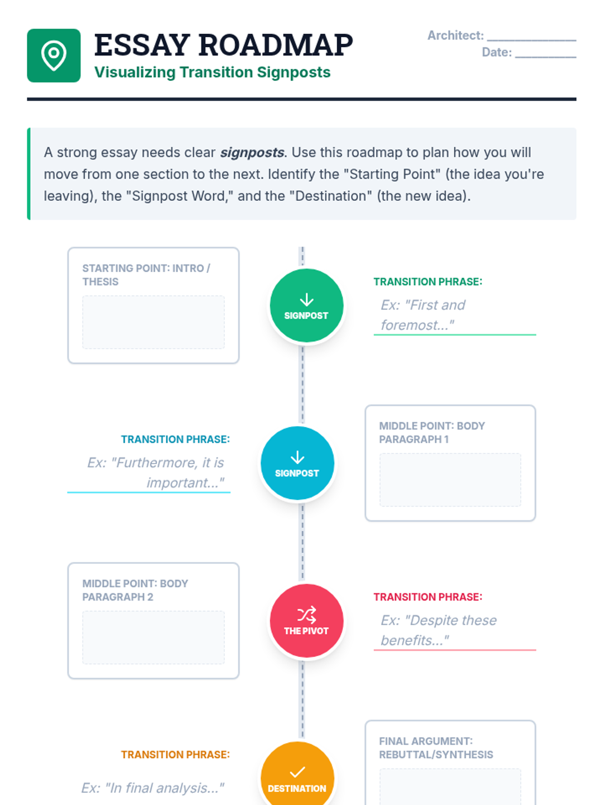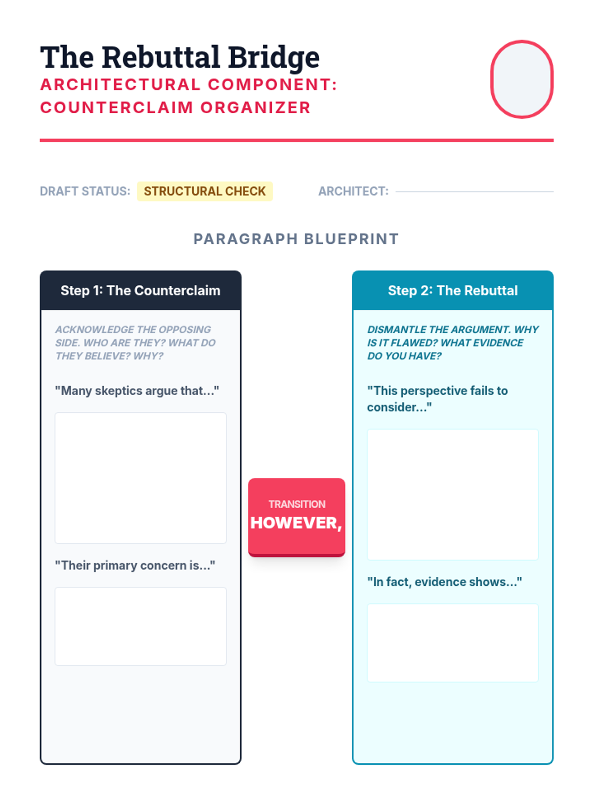 An advanced writing sequence for 10th-grade students that uses visual graphic organizers to manage counterclaims, evidence synthesis, and complex essay transitions. This sequence supports executive functioning by breaking down the 'blueprint' of a research paper into architectural components.