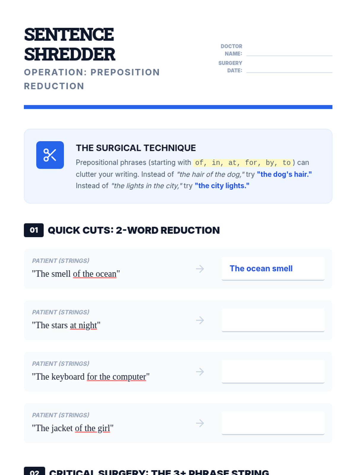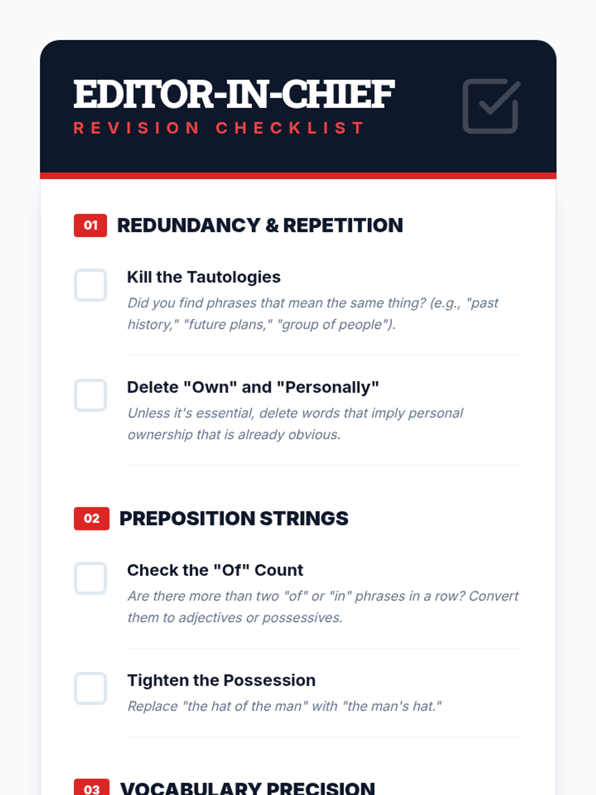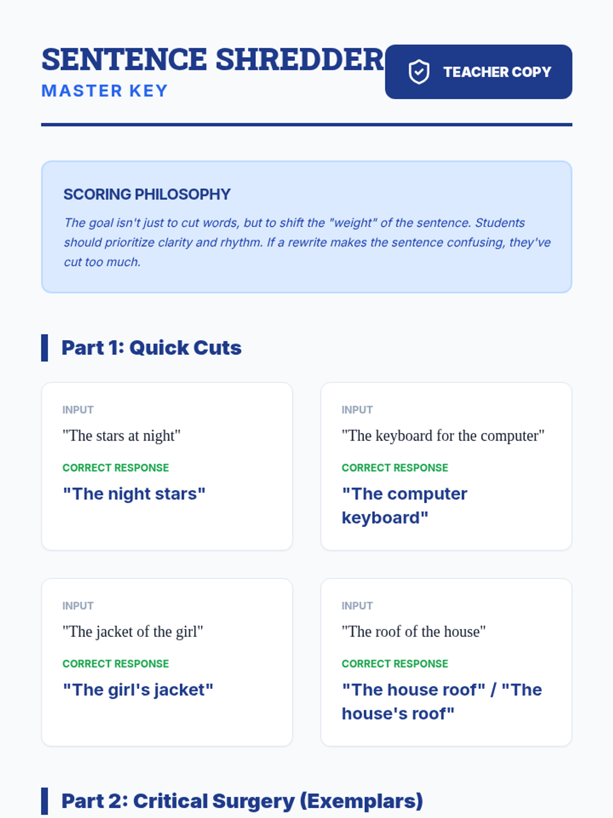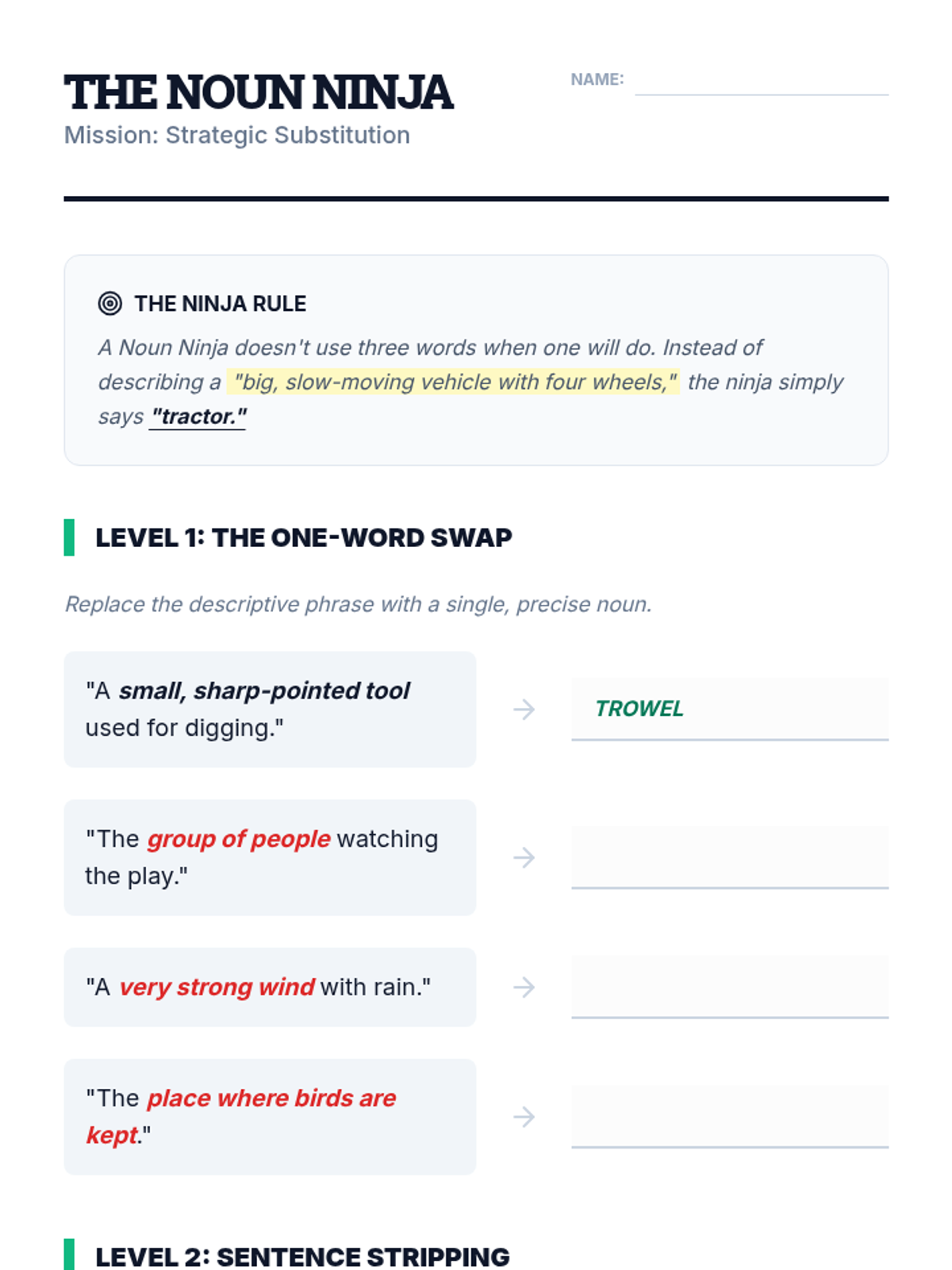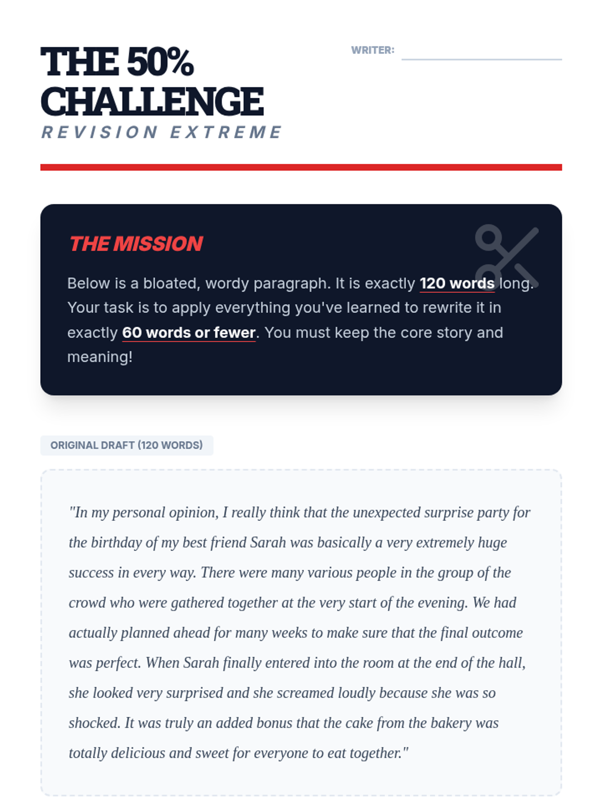 An intensive writer's workshop for 6th graders focused on eliminating wordiness and selecting precise vocabulary. Students learn to cut redundancy, streamline syntax, and choose high-impact words to make their writing clearer and more authoritative.